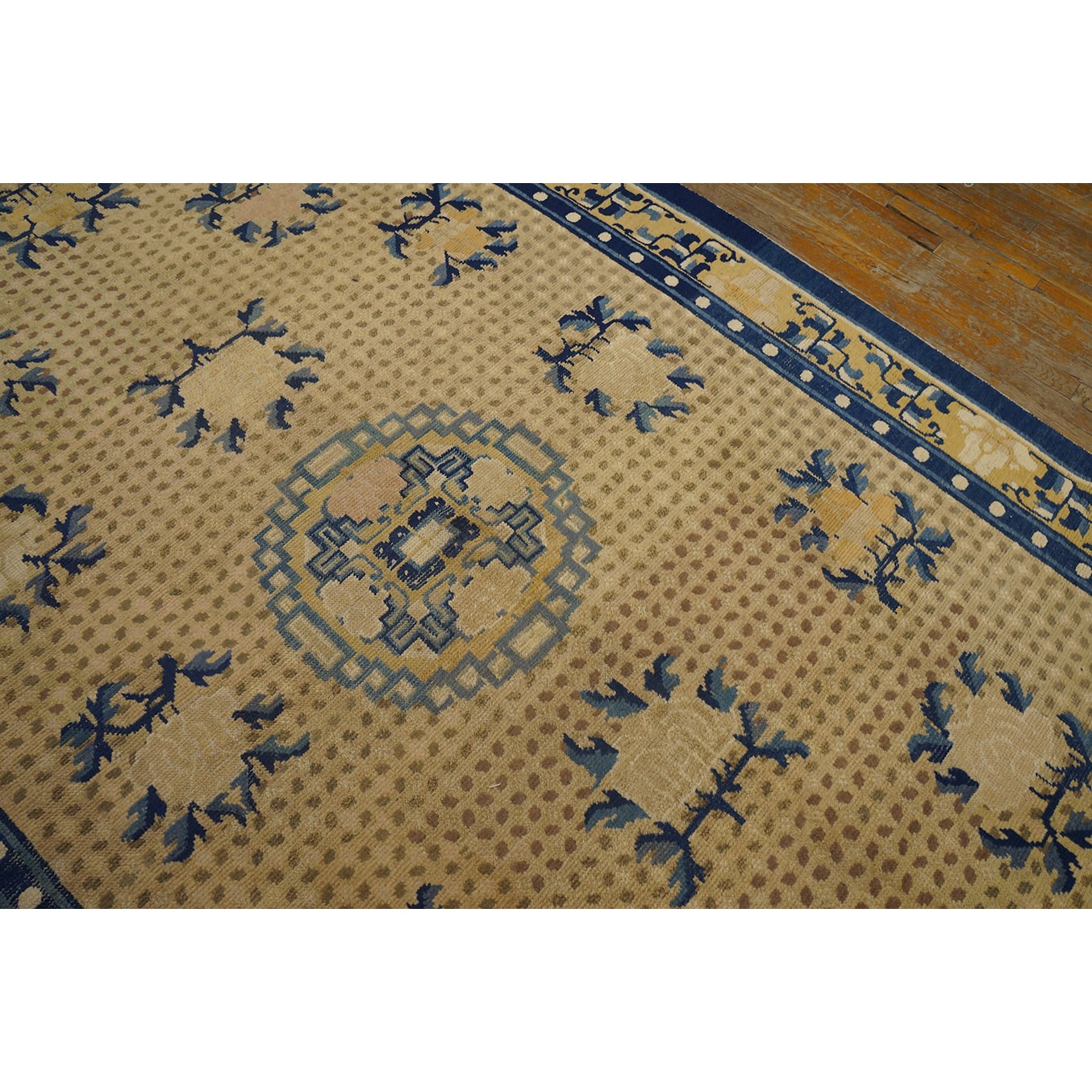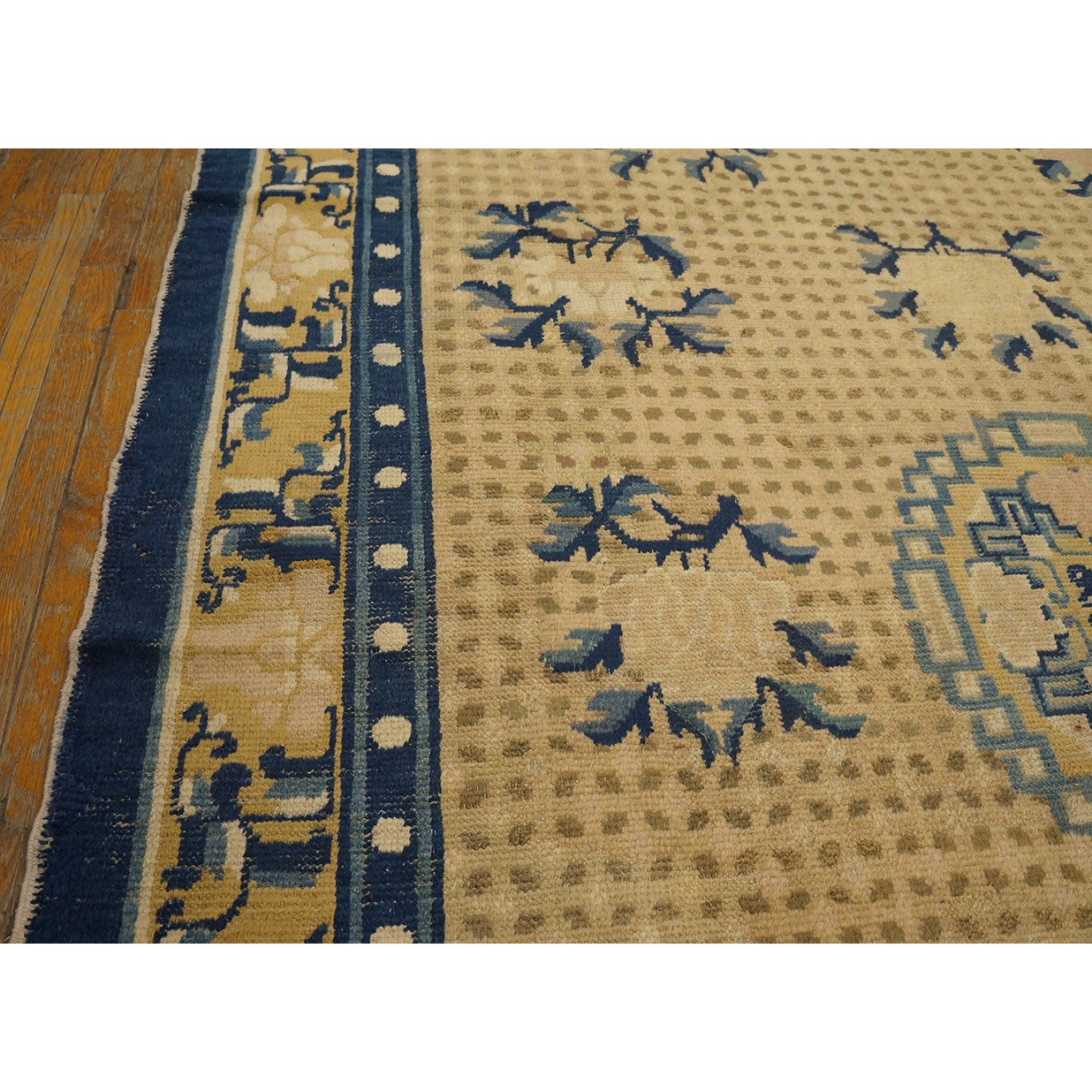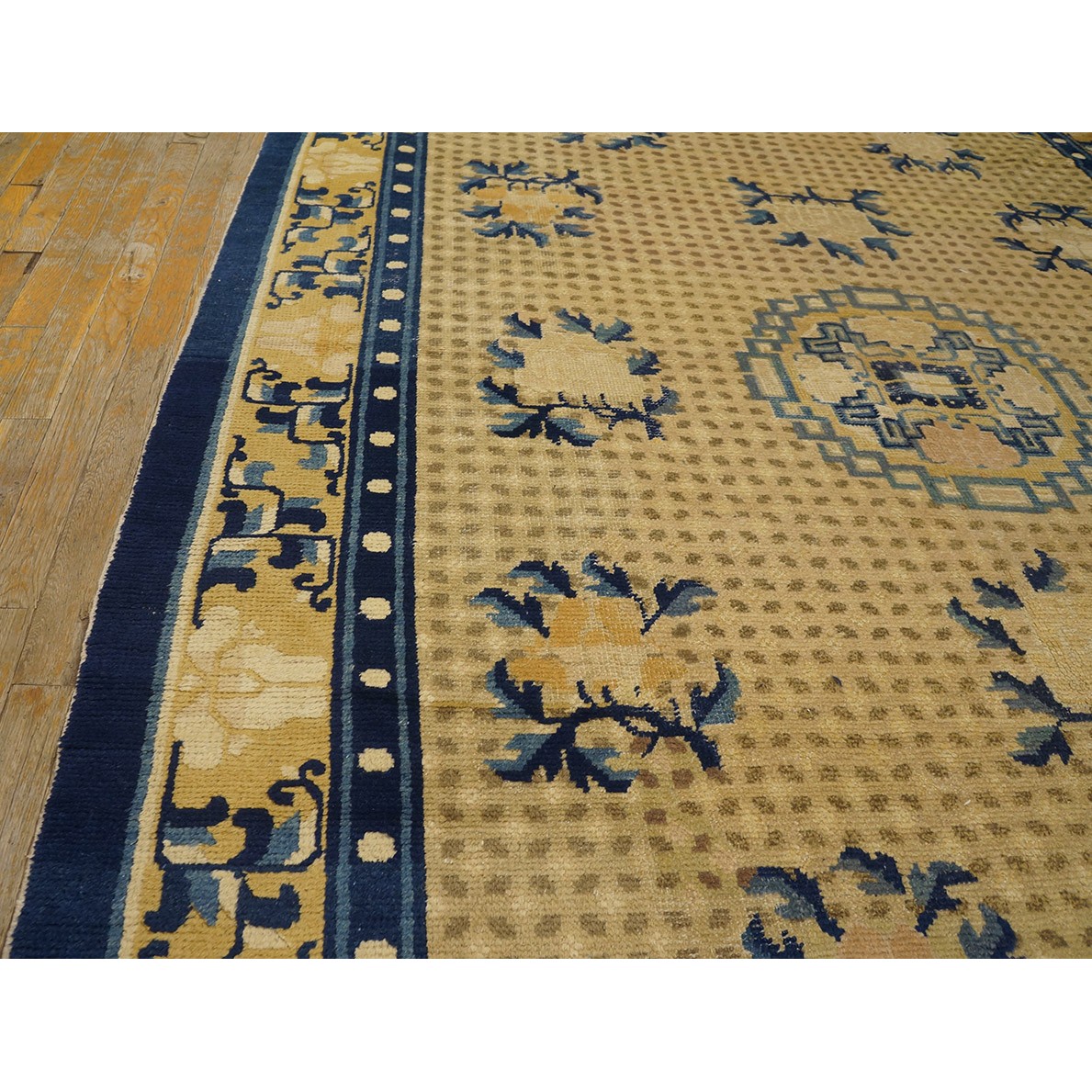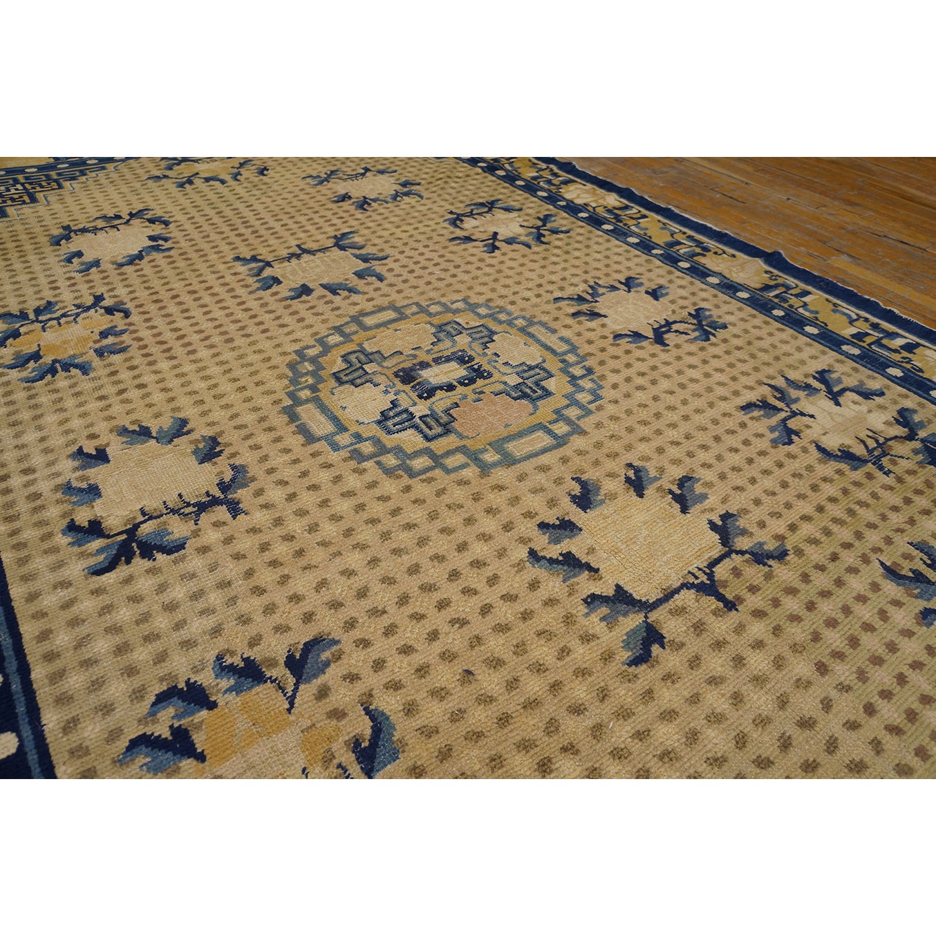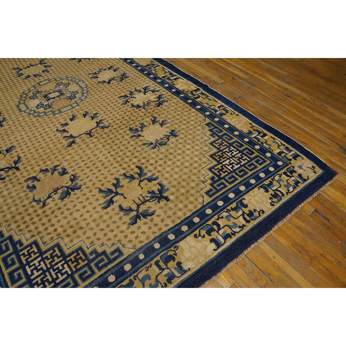 DescriptionChineseCarpets made in China proper. See entries Ningshia, Peking, Art Deco. Chinese - NingxiaThe western Chinese province of Ningshia has a mostly Muslim population and is the source of many of the oldest Chinese carpets of the modern (Ming Dynasty and later) era. The designs are typically Chinese: fretwork or Greek key boarders, pacony palmettes, bats, butterflies, Fu dogs, clouds, dragons, shou symbols, etc. Pollar carpets designed to wrap around monastery columns and displaying a dragon above waves are a specialty. The weave is coarse and soft, with several wefts between knot rows and a longish pile. Yellow golds, dark and light blues are common colors. The outer most plain border on pre 1800 examples is a corrosive brown. Formats include: large square throne carpets, paralleled meditation runners, chair seats and scalloped backs. | |