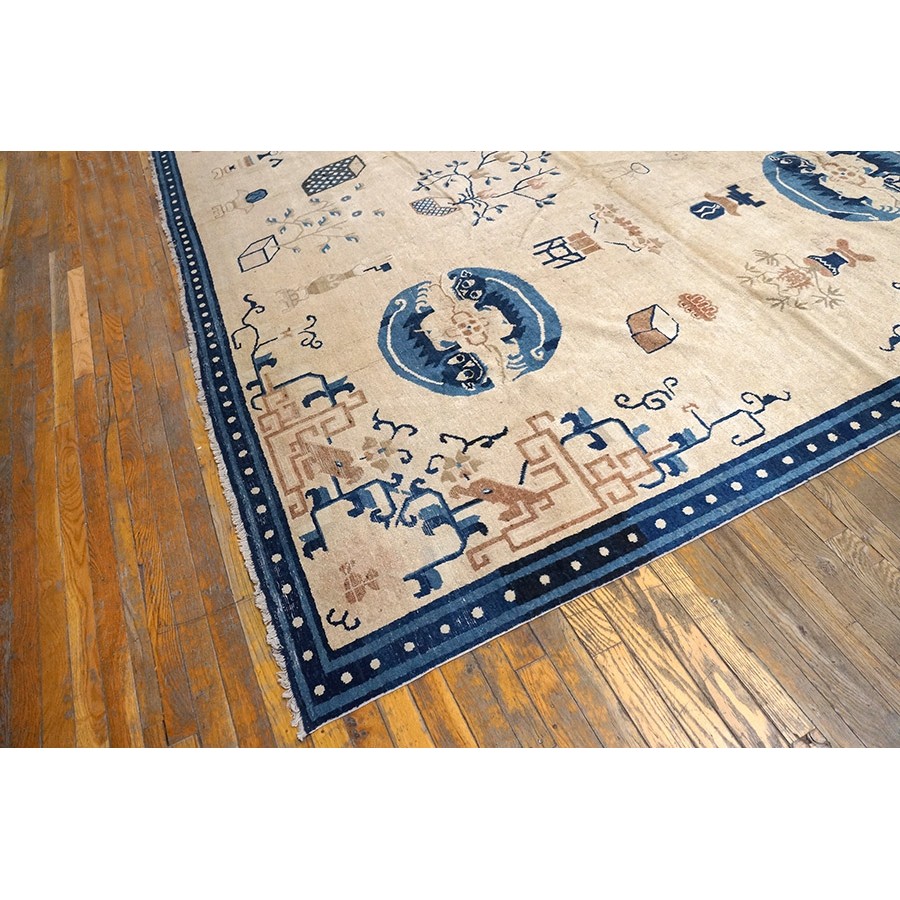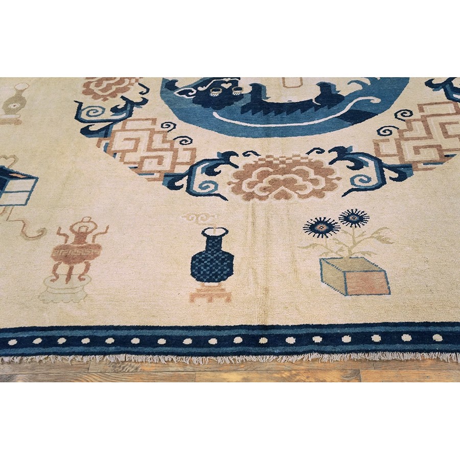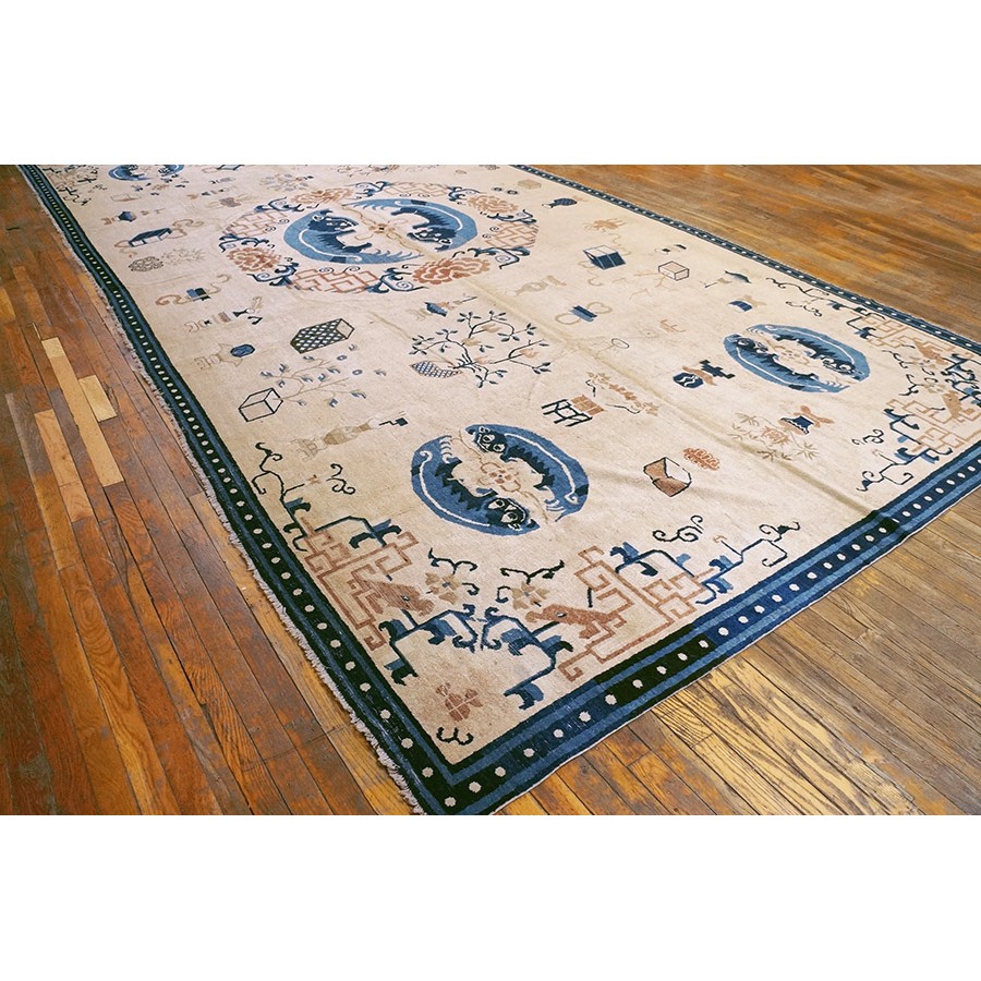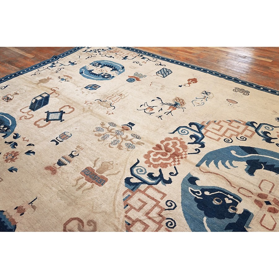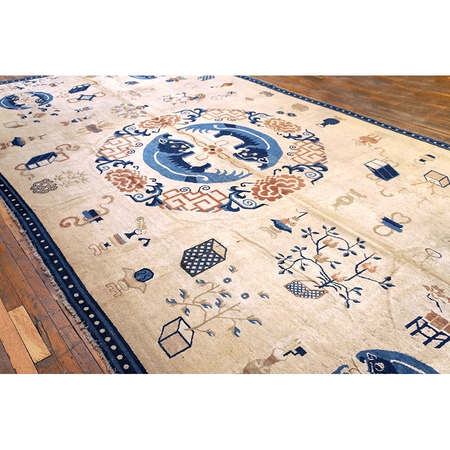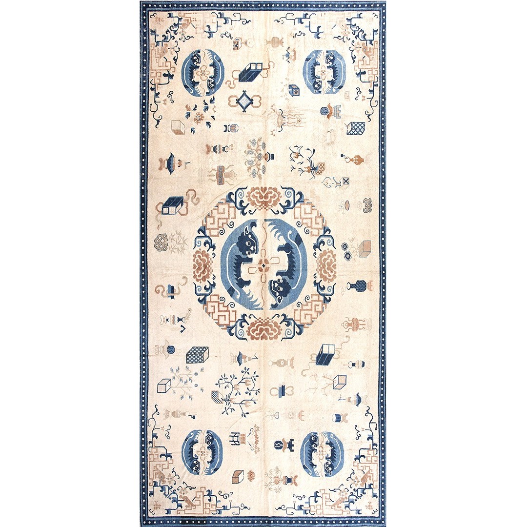 DescriptionChineseCarpets made in China proper. See entries Ningshia, Peking, Art Deco. Chinese - NingxiaThe western Chinese province of Ningshia has a mostly Muslim population and is the source of many of the oldest Chinese carpets of the modern (Ming Dynasty and later) era. The designs are typically Chinese: fretwork or Greek key boarders, pacony palmettes, bats, butterflies, Fu dogs, clouds, dragons, shou symbols, etc. Pollar carpets designed to wrap around monastery columns and displaying a dragon above waves are a specialty. The weave is coarse and soft, with several wefts between knot rows and a longish pile. Yellow golds, dark and light blues are common colors. The outer most plain border on pre 1800 examples is a corrosive brown. Formats include: large square throne carpets, paralleled meditation runners, chair seats and scalloped backs. | |