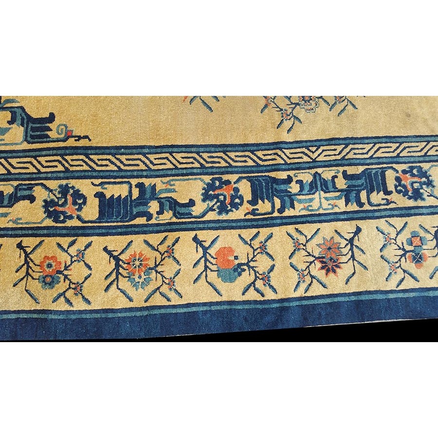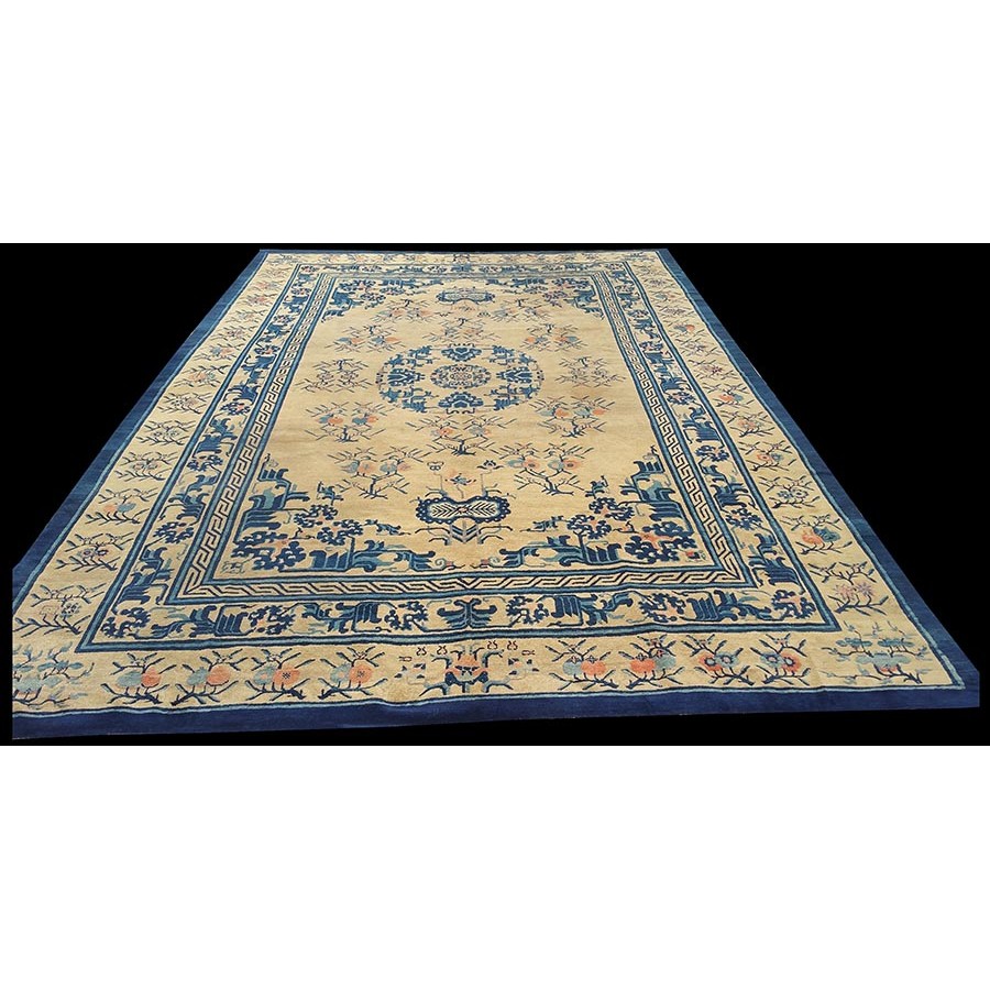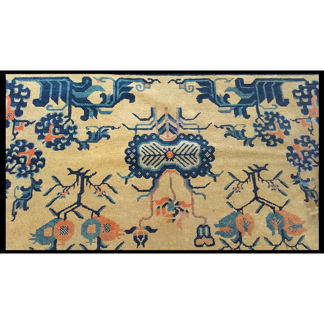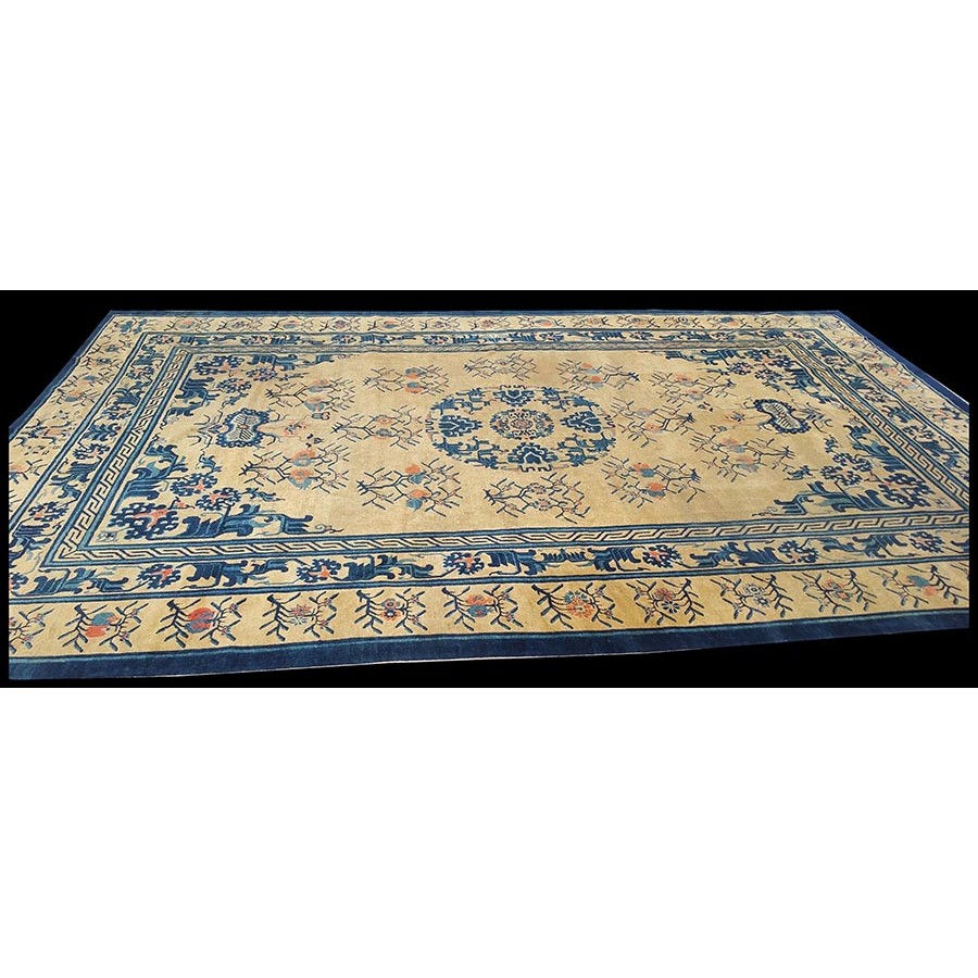 DescriptionChineseCarpets made in China proper. See entries Ningshia, Peking, Art Deco. Chinese - NingxiaThe western Chinese province of Ningshia has a mostly Muslim population and is the source of many of the oldest Chinese carpets of the modern (Ming Dynasty and later) era. The designs are typically Chinese: fretwork or Greek key boarders, pacony palmettes, bats, butterflies, Fu dogs, clouds, dragons, shou symbols, etc. Pollar carpets designed to wrap around monastery columns and displaying a dragon above waves are a specialty. The weave is coarse and soft, with several wefts between knot rows and a longish pile. Yellow golds, dark and light blues are common colors. The outer most plain border on pre 1800 examples is a corrosive brown. Formats include: large square throne carpets, paralleled meditation runners, chair seats and scalloped backs. | |