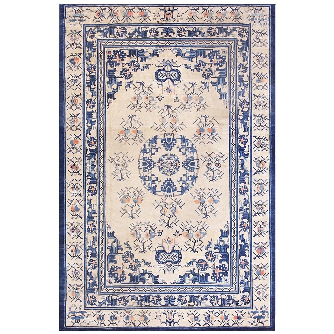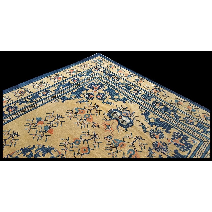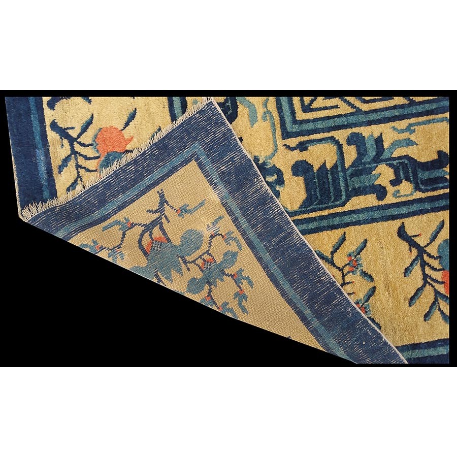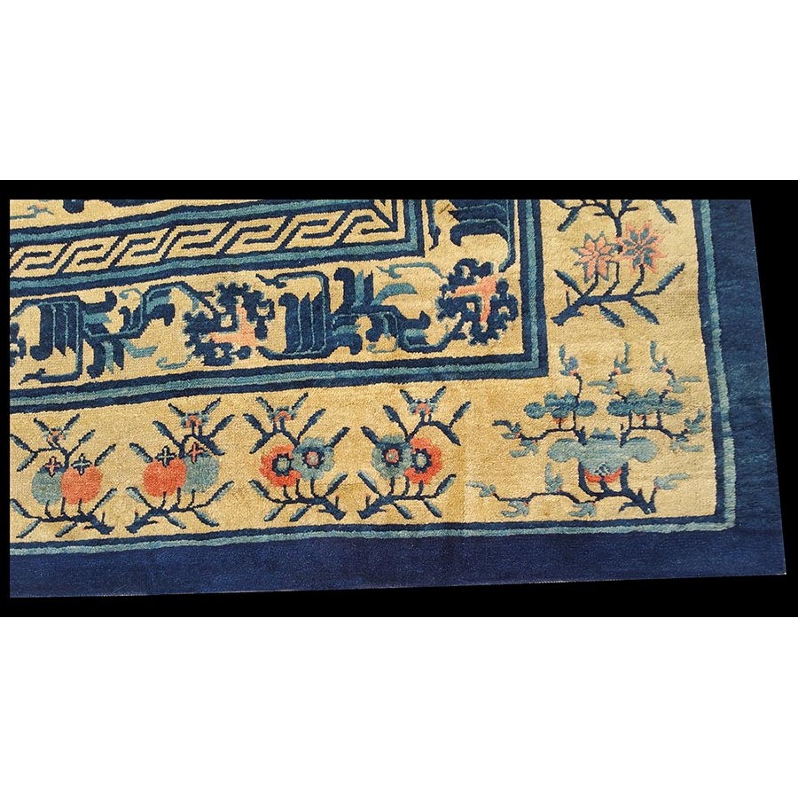 DescriptionChineseCarpets made in China proper. See entries Ningshia, Peking, Art Deco. Chinese - NingxiaThe western Chinese province of Ningshia has a mostly Muslim population and is the source of many of the oldest Chinese carpets of the modern (Ming Dynasty and later) era. The designs are typically Chinese: fretwork or Greek key boarders, pacony palmettes, bats, butterflies, Fu dogs, clouds, dragons, shou symbols, etc. Pollar carpets designed to wrap around monastery columns and displaying a dragon above waves are a specialty. The weave is coarse and soft, with several wefts between knot rows and a longish pile. Yellow golds, dark and light blues are common colors. The outer most plain border on pre 1800 examples is a corrosive brown. Formats include: large square throne carpets, paralleled meditation runners, chair seats and scalloped backs. | |