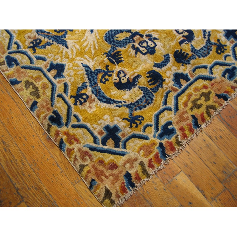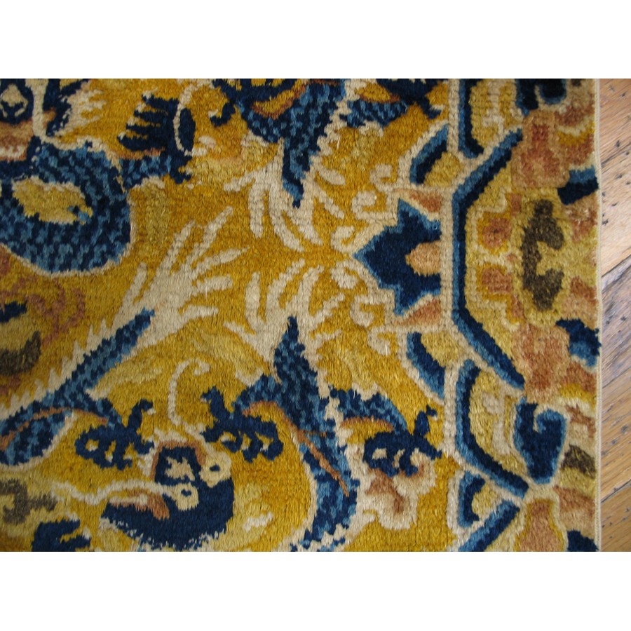 DescriptionChineseCarpets made in China proper. See entries Ningshia, Peking, Art Deco. Chinese - NingxiaThe western Chinese province of Ningshia has a mostly Muslim population and is the source of many of the oldest Chinese carpets of the modern (Ming Dynasty and later) era. The designs are typically Chinese: fretwork or Greek key boarders, pacony palmettes, bats, butterflies, Fu dogs, clouds, dragons, shou symbols, etc. Pollar carpets designed to wrap around monastery columns and displaying a dragon above waves are a specialty. The weave is coarse and soft, with several wefts between knot rows and a longish pile. Yellow golds, dark and light blues are common colors. The outer most plain border on pre 1800 examples is a corrosive brown. Formats include: large square throne carpets, paralleled meditation runners, chair seats and scalloped backs. | |