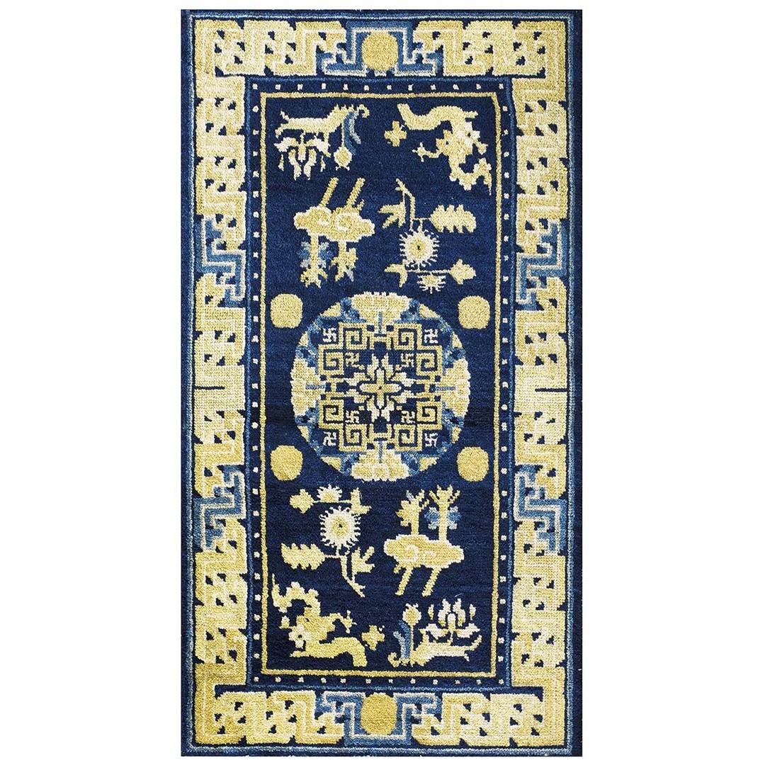 DescriptionChineseCarpets made in China proper. See entries Ningshia, Peking, Art Deco. Chinese - NingxiaThe western Chinese province of Ningshia has a mostly Muslim population and is the source of many of the oldest Chinese carpets of the modern (Ming Dynasty and later) era. The designs are typically Chinese: fretwork or Greek key boarders, pacony palmettes, bats, butterflies, Fu dogs, clouds, dragons, shou symbols, etc. Pollar carpets designed to wrap around monastery columns and displaying a dragon above waves are a specialty. The weave is coarse and soft, with several wefts between knot rows and a longish pile. Yellow golds, dark and light blues are common colors. The outer most plain border on pre 1800 examples is a corrosive brown. Formats include: large square throne carpets, paralleled meditation runners, chair seats and scalloped backs. | |