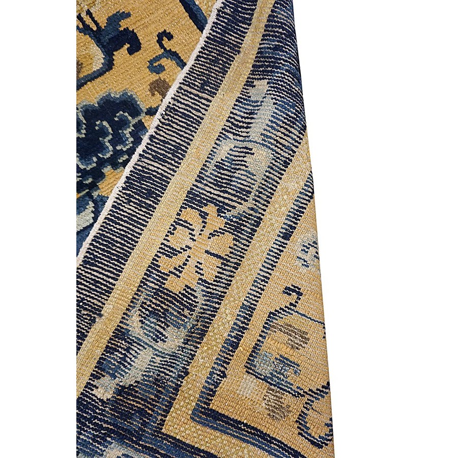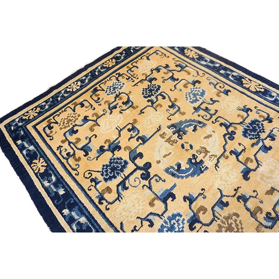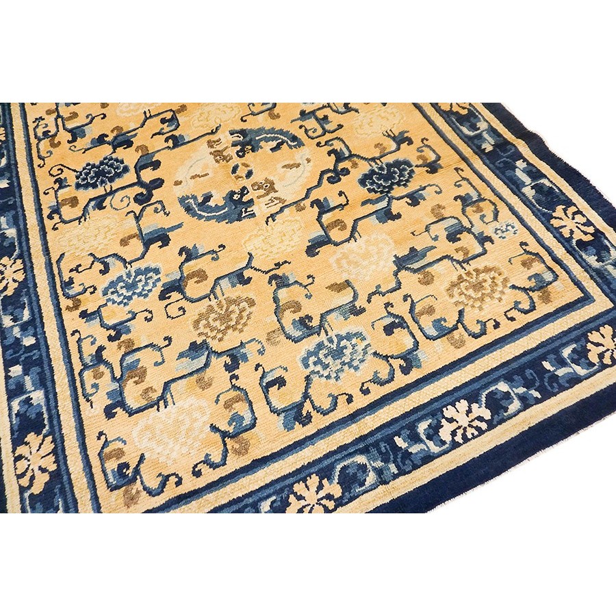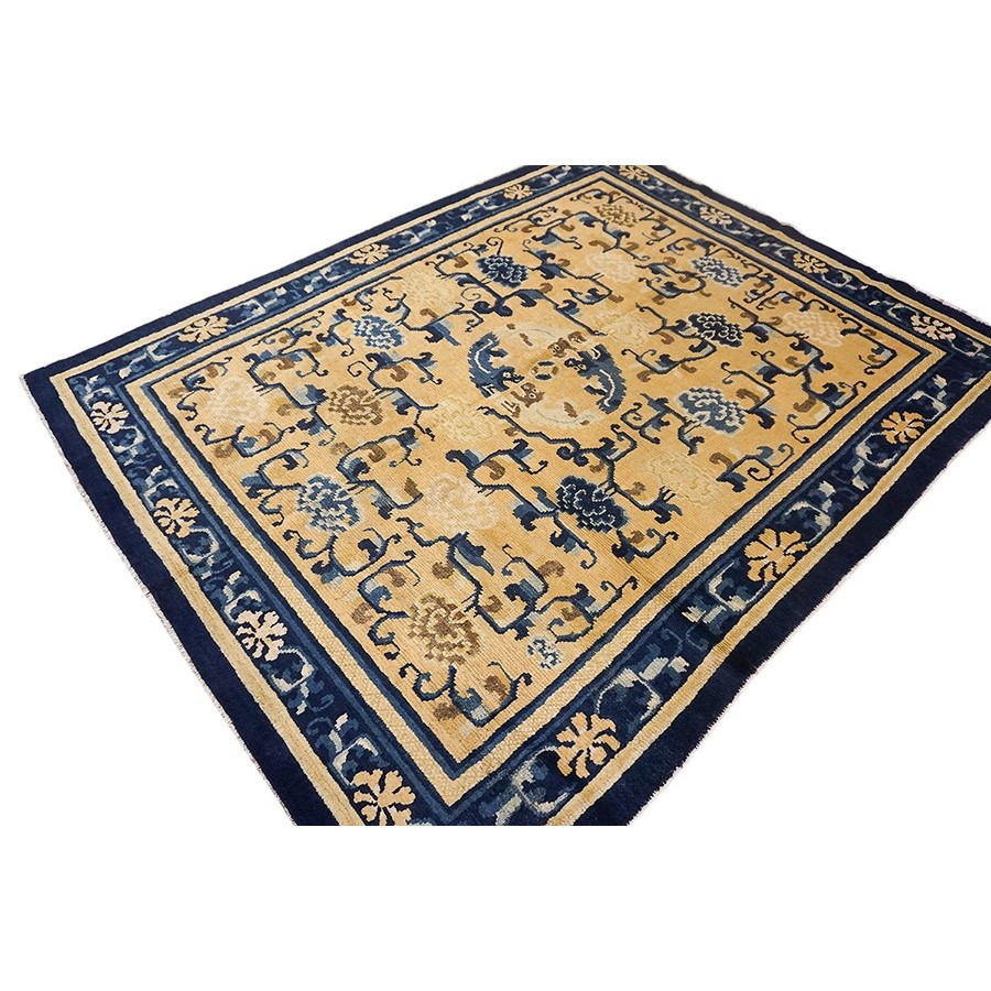 DescriptionChineseCarpets made in China proper. See entries Ningshia, Peking, Art Deco. Chinese - NingxiaThe western Chinese province of Ningshia has a mostly Muslim population and is the source of many of the oldest Chinese carpets of the modern (Ming Dynasty and later) era. The designs are typically Chinese: fretwork or Greek key boarders, pacony palmettes, bats, butterflies, Fu dogs, clouds, dragons, shou symbols, etc. Pollar carpets designed to wrap around monastery columns and displaying a dragon above waves are a specialty. The weave is coarse and soft, with several wefts between knot rows and a longish pile. Yellow golds, dark and light blues are common colors. The outer most plain border on pre 1800 examples is a corrosive brown. Formats include: large square throne carpets, paralleled meditation runners, chair seats and scalloped backs. | |