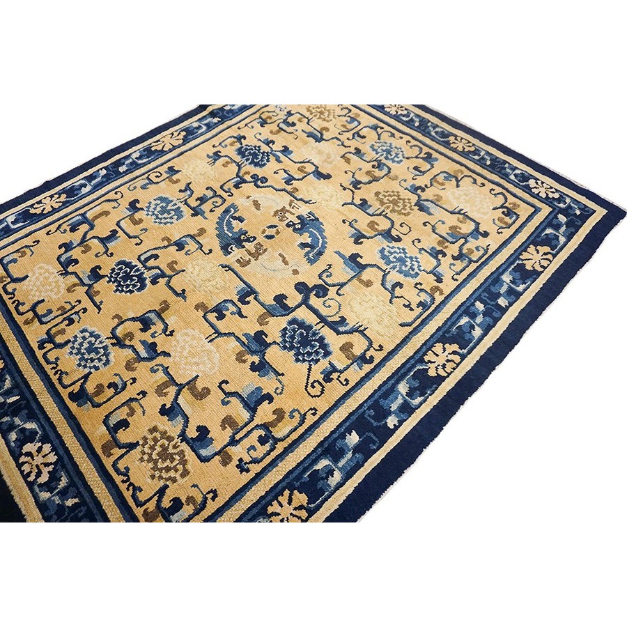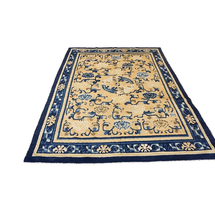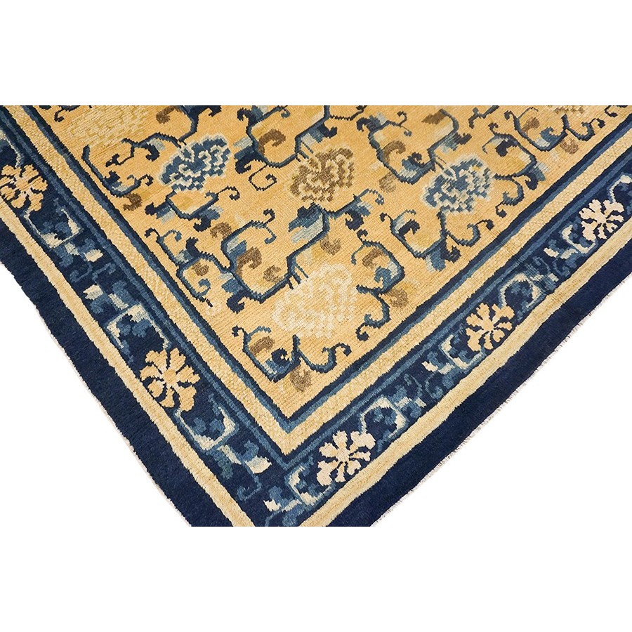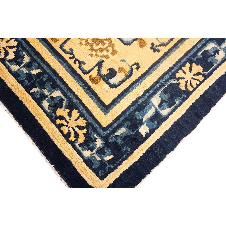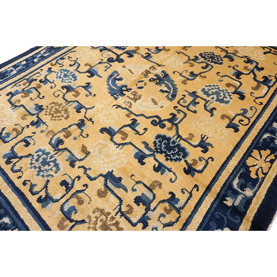 DescriptionChineseCarpets made in China proper. See entries Ningshia, Peking, Art Deco. Chinese - NingxiaThe western Chinese province of Ningshia has a mostly Muslim population and is the source of many of the oldest Chinese carpets of the modern (Ming Dynasty and later) era. The designs are typically Chinese: fretwork or Greek key boarders, pacony palmettes, bats, butterflies, Fu dogs, clouds, dragons, shou symbols, etc. Pollar carpets designed to wrap around monastery columns and displaying a dragon above waves are a specialty. The weave is coarse and soft, with several wefts between knot rows and a longish pile. Yellow golds, dark and light blues are common colors. The outer most plain border on pre 1800 examples is a corrosive brown. Formats include: large square throne carpets, paralleled meditation runners, chair seats and scalloped backs. | |