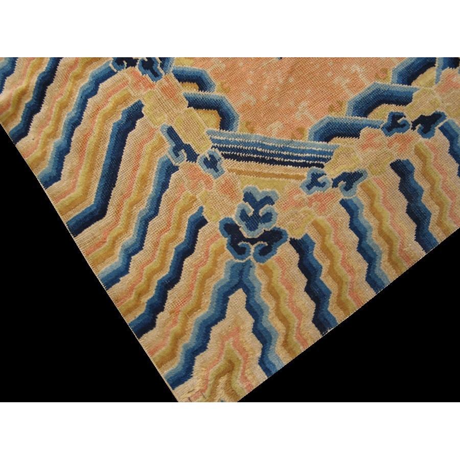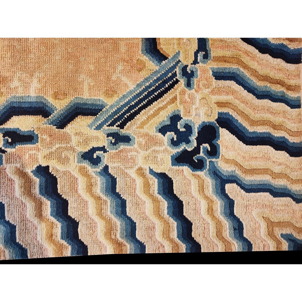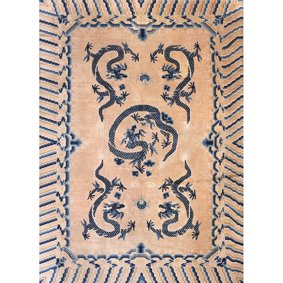 DescriptionChineseCarpets made in China proper. See entries Ningshia, Peking, Art Deco. Chinese - NingxiaThe western Chinese province of Ningshia has a mostly Muslim population and is the source of many of the oldest Chinese carpets of the modern (Ming Dynasty and later) era. The designs are typically Chinese: fretwork or Greek key boarders, pacony palmettes, bats, butterflies, Fu dogs, clouds, dragons, shou symbols, etc. Pollar carpets designed to wrap around monastery columns and displaying a dragon above waves are a specialty. The weave is coarse and soft, with several wefts between knot rows and a longish pile. Yellow golds, dark and light blues are common colors. The outer most plain border on pre 1800 examples is a corrosive brown. Formats include: large square throne carpets, paralleled meditation runners, chair seats and scalloped backs. | |