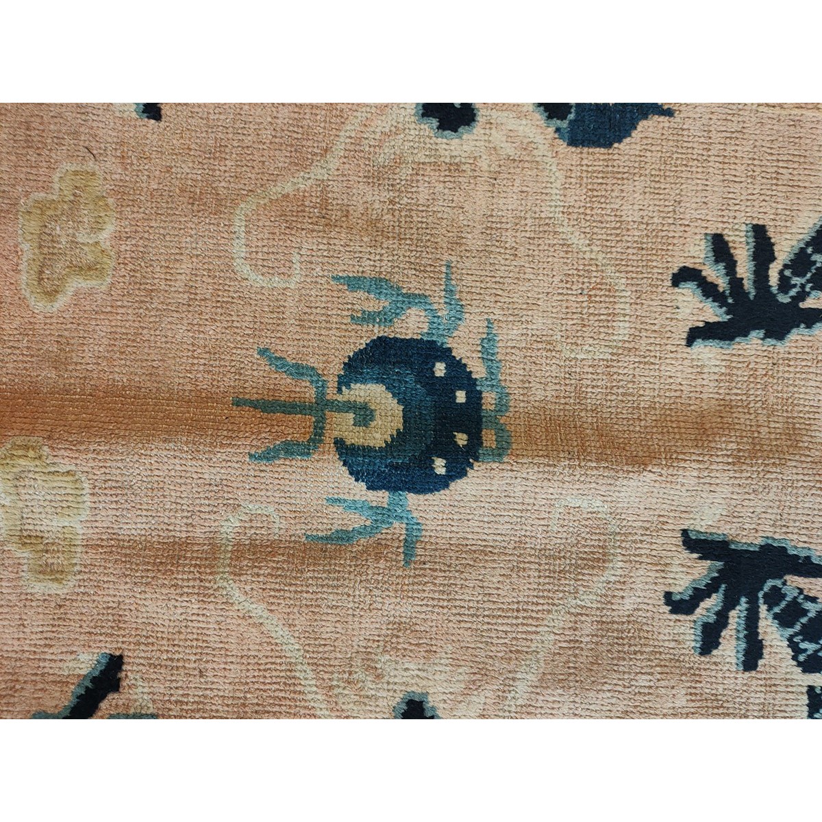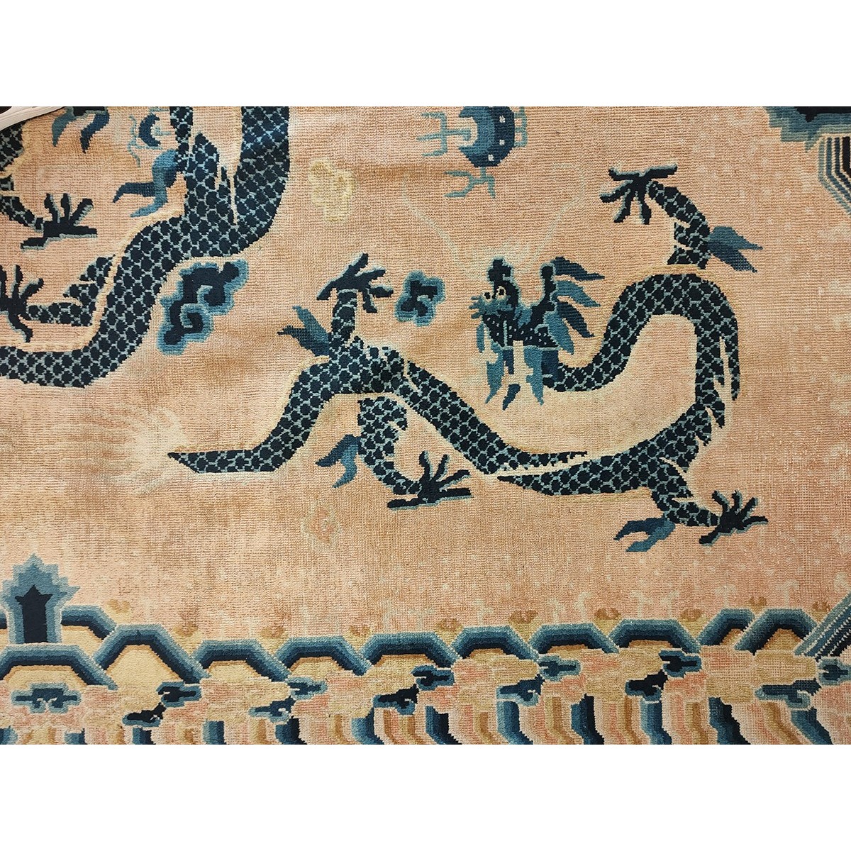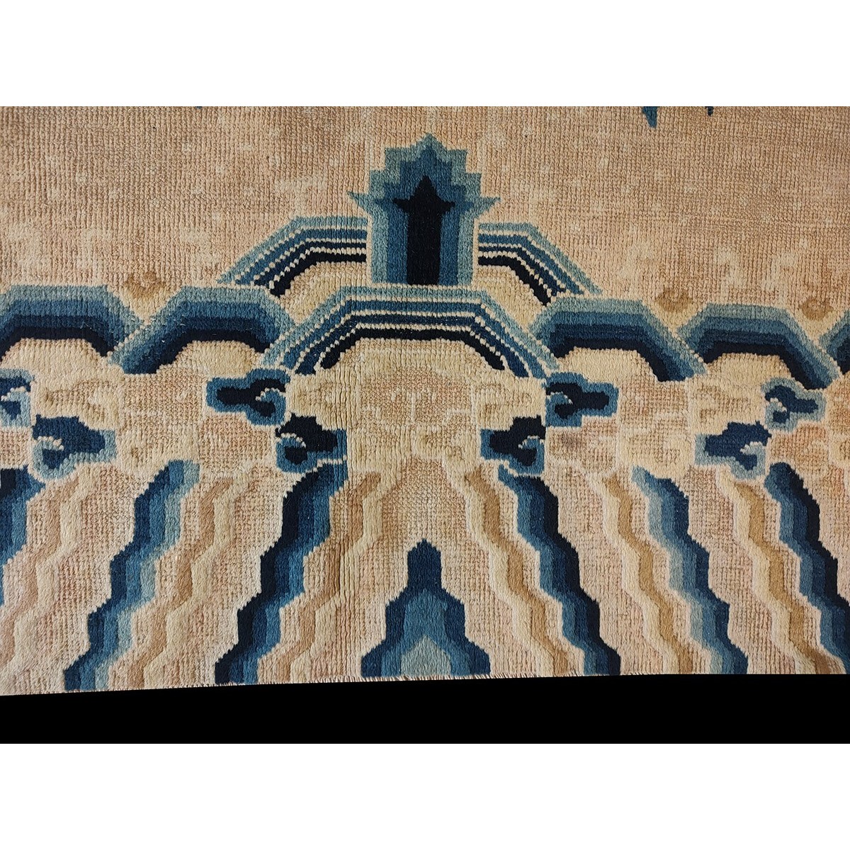 DescriptionChineseCarpets made in China proper. See entries Ningshia, Peking, Art Deco. Chinese - NingxiaThe western Chinese province of Ningshia has a mostly Muslim population and is the source of many of the oldest Chinese carpets of the modern (Ming Dynasty and later) era. The designs are typically Chinese: fretwork or Greek key boarders, pacony palmettes, bats, butterflies, Fu dogs, clouds, dragons, shou symbols, etc. Pollar carpets designed to wrap around monastery columns and displaying a dragon above waves are a specialty. The weave is coarse and soft, with several wefts between knot rows and a longish pile. Yellow golds, dark and light blues are common colors. The outer most plain border on pre 1800 examples is a corrosive brown. Formats include: large square throne carpets, paralleled meditation runners, chair seats and scalloped backs. | |