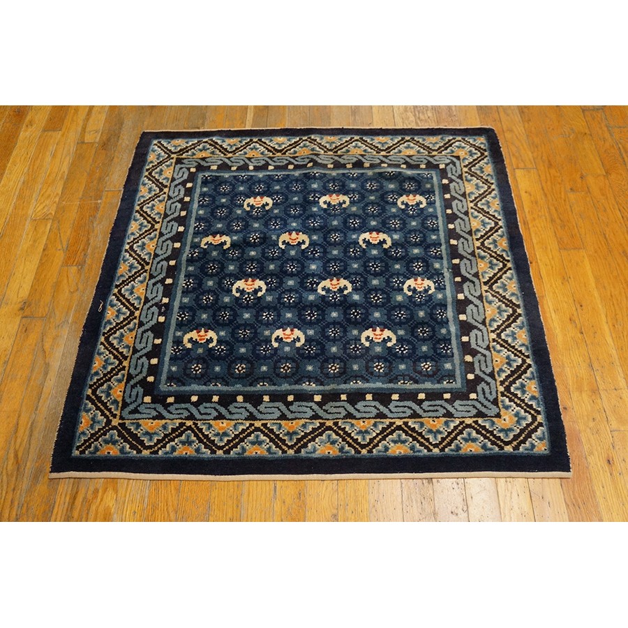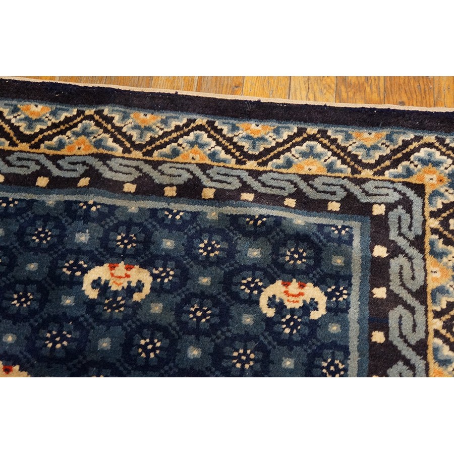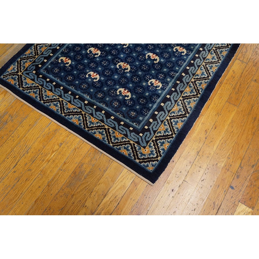 DescriptionChineseCarpets made in China proper. See entries Ningshia, Peking, Art Deco. Chinese - NingxiaThe western Chinese province of Ningshia has a mostly Muslim population and is the source of many of the oldest Chinese carpets of the modern (Ming Dynasty and later) era. The designs are typically Chinese: fretwork or Greek key boarders, pacony palmettes, bats, butterflies, Fu dogs, clouds, dragons, shou symbols, etc. Pollar carpets designed to wrap around monastery columns and displaying a dragon above waves are a specialty. The weave is coarse and soft, with several wefts between knot rows and a longish pile. Yellow golds, dark and light blues are common colors. The outer most plain border on pre 1800 examples is a corrosive brown. Formats include: large square throne carpets, paralleled meditation runners, chair seats and scalloped backs. | |