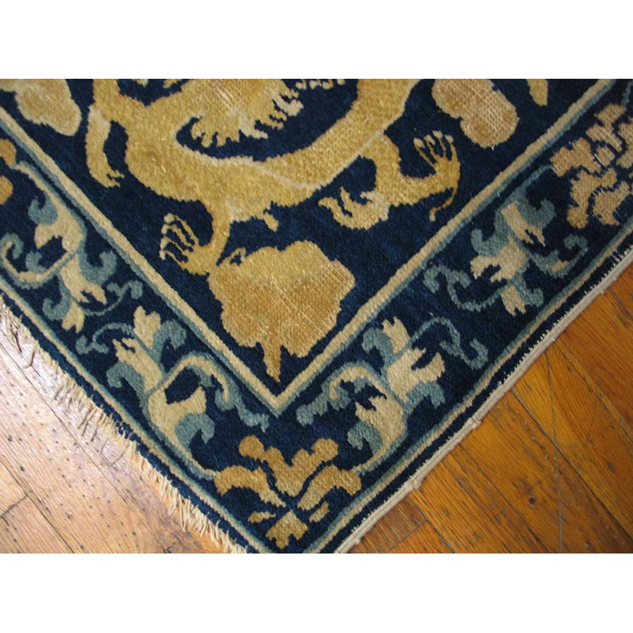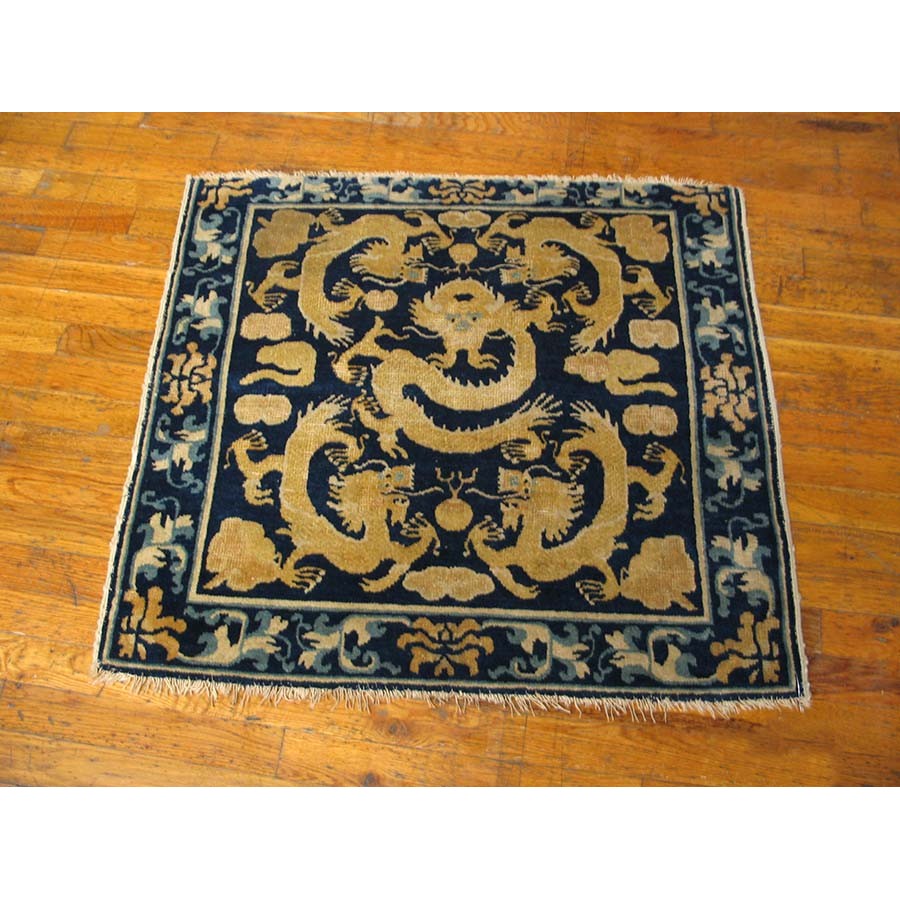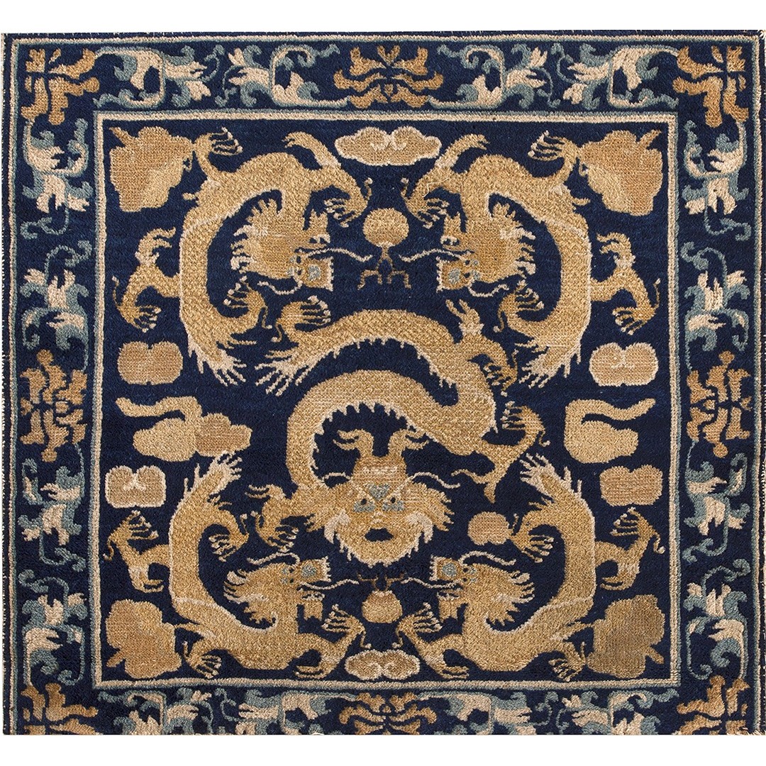 DescriptionChineseCarpets made in China proper. See entries Ningshia, Peking, Art Deco. Chinese - NingxiaThe western Chinese province of Ningshia has a mostly Muslim population and is the source of many of the oldest Chinese carpets of the modern (Ming Dynasty and later) era. The designs are typically Chinese: fretwork or Greek key boarders, pacony palmettes, bats, butterflies, Fu dogs, clouds, dragons, shou symbols, etc. Pollar carpets designed to wrap around monastery columns and displaying a dragon above waves are a specialty. The weave is coarse and soft, with several wefts between knot rows and a longish pile. Yellow golds, dark and light blues are common colors. The outer most plain border on pre 1800 examples is a corrosive brown. Formats include: large square throne carpets, paralleled meditation runners, chair seats and scalloped backs. | |