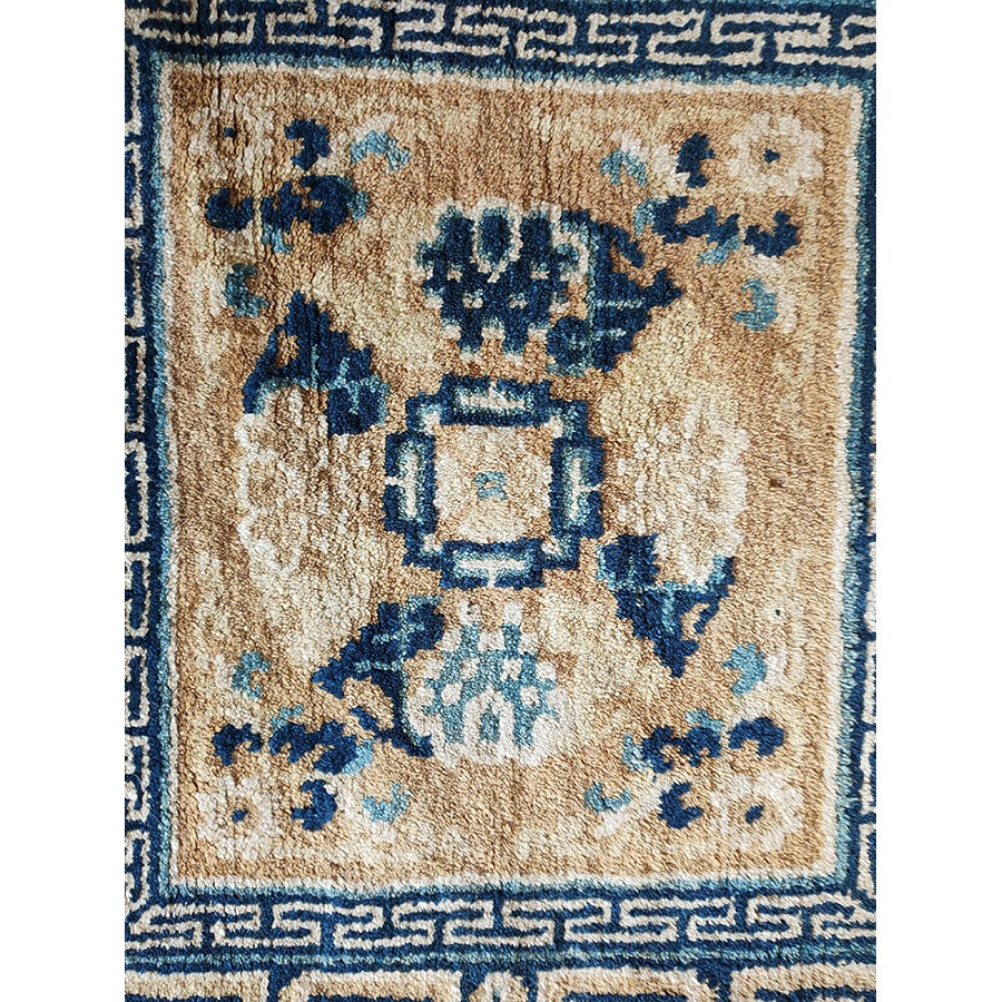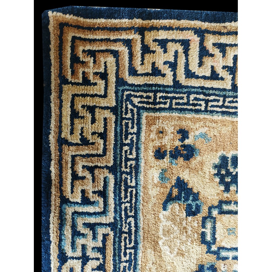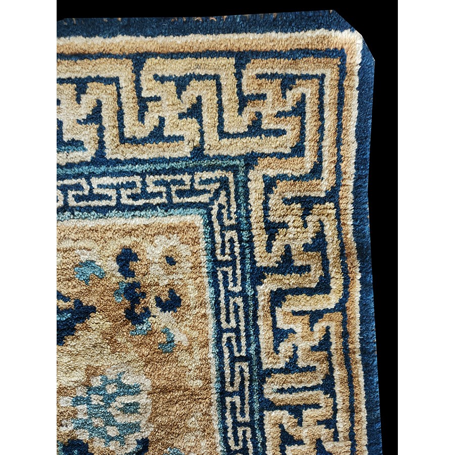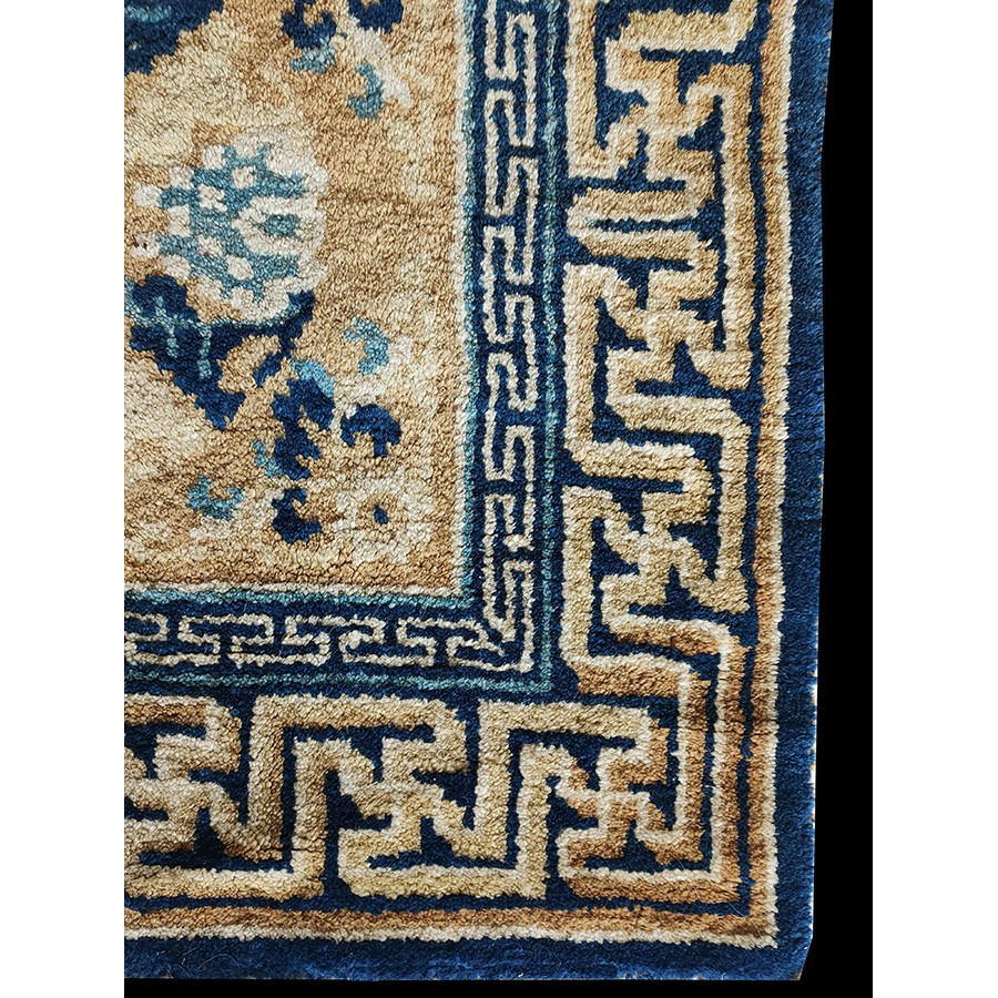 DescriptionChineseCarpets made in China proper. See entries Ningshia, Peking, Art Deco. Chinese - NingxiaThe western Chinese province of Ningshia has a mostly Muslim population and is the source of many of the oldest Chinese carpets of the modern (Ming Dynasty and later) era. The designs are typically Chinese: fretwork or Greek key boarders, pacony palmettes, bats, butterflies, Fu dogs, clouds, dragons, shou symbols, etc. Pollar carpets designed to wrap around monastery columns and displaying a dragon above waves are a specialty. The weave is coarse and soft, with several wefts between knot rows and a longish pile. Yellow golds, dark and light blues are common colors. The outer most plain border on pre 1800 examples is a corrosive brown. Formats include: large square throne carpets, paralleled meditation runners, chair seats and scalloped backs. | |