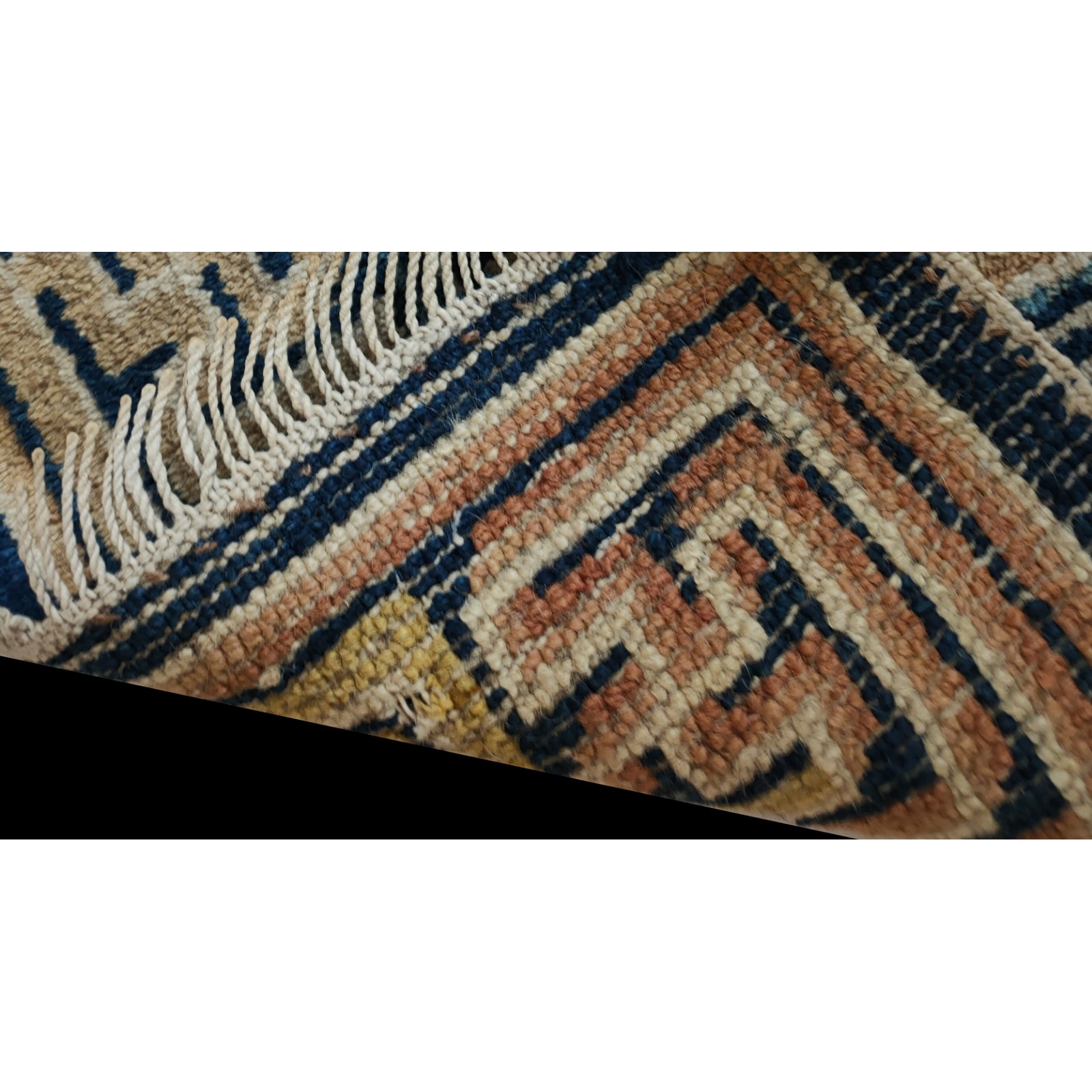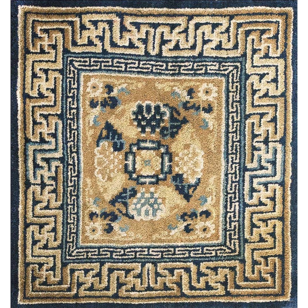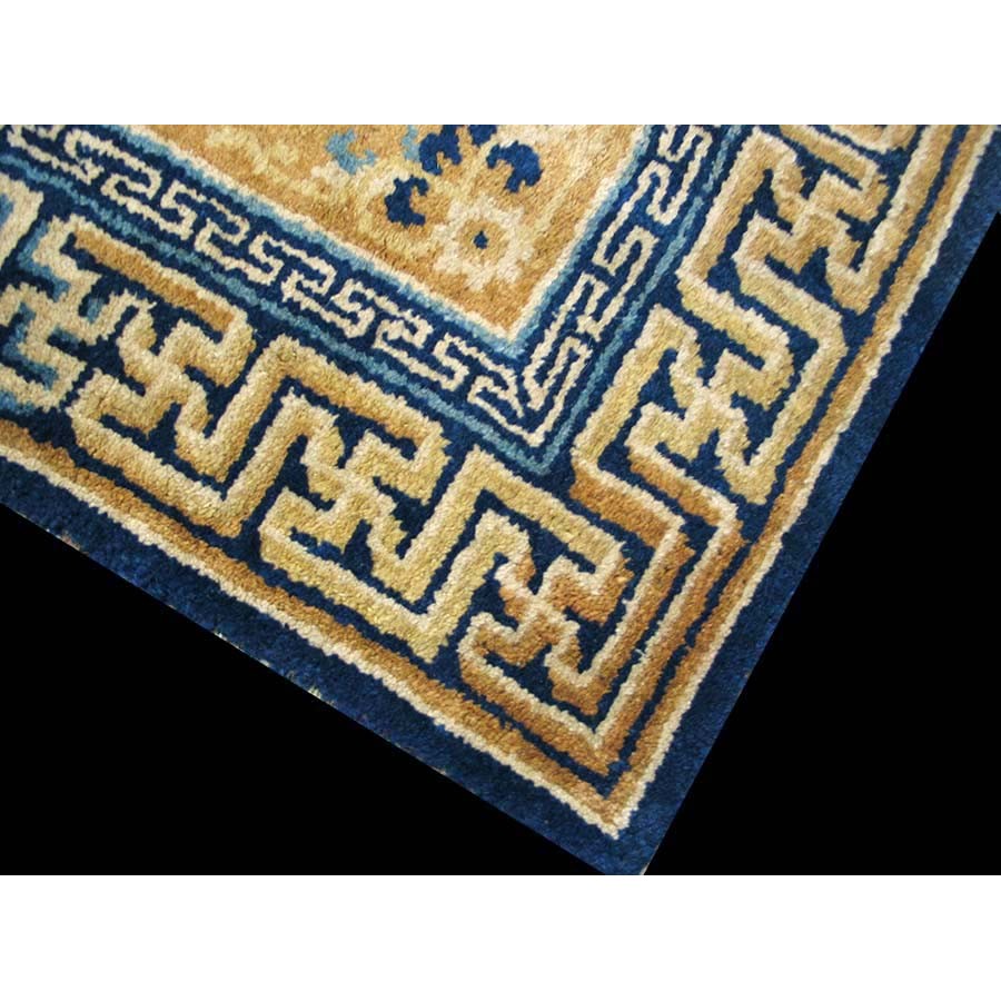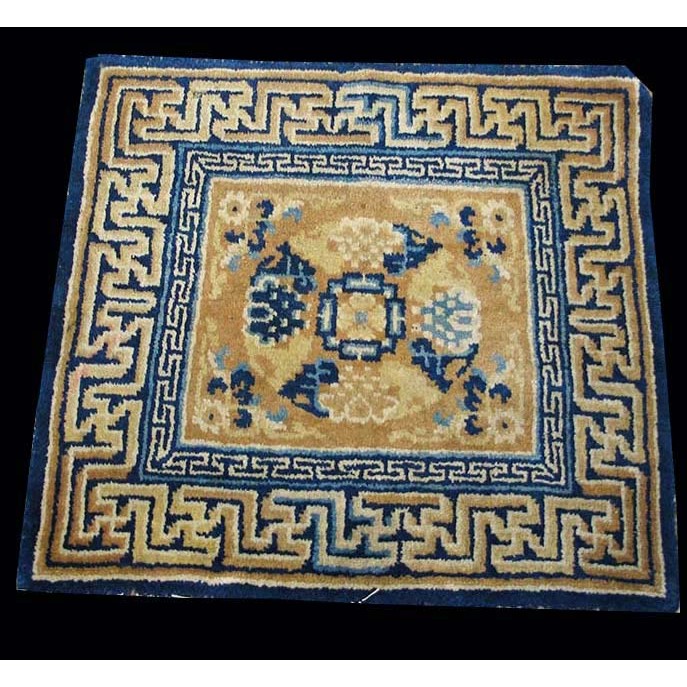 DescriptionChineseCarpets made in China proper. See entries Ningshia, Peking, Art Deco. Chinese - NingxiaThe western Chinese province of Ningshia has a mostly Muslim population and is the source of many of the oldest Chinese carpets of the modern (Ming Dynasty and later) era. The designs are typically Chinese: fretwork or Greek key boarders, pacony palmettes, bats, butterflies, Fu dogs, clouds, dragons, shou symbols, etc. Pollar carpets designed to wrap around monastery columns and displaying a dragon above waves are a specialty. The weave is coarse and soft, with several wefts between knot rows and a longish pile. Yellow golds, dark and light blues are common colors. The outer most plain border on pre 1800 examples is a corrosive brown. Formats include: large square throne carpets, paralleled meditation runners, chair seats and scalloped backs. | |