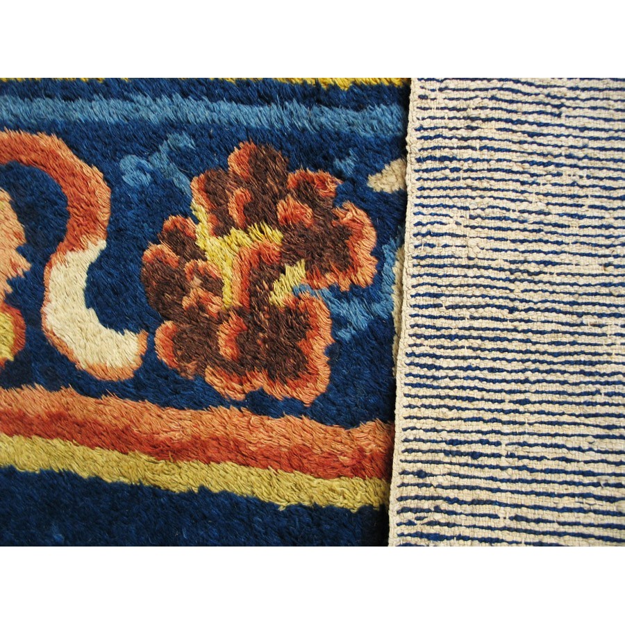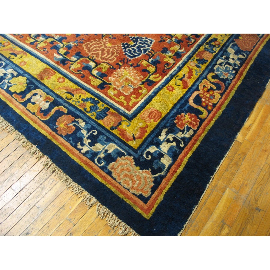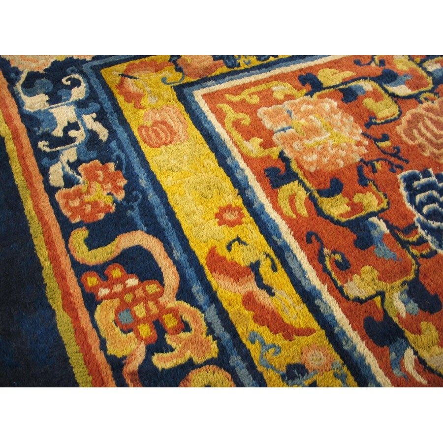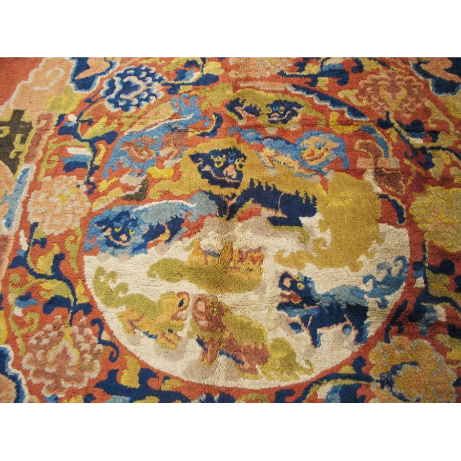 DescriptionChineseCarpets made in China proper. See entries Ningshia, Peking, Art Deco. Chinese - NingxiaThe western Chinese province of Ningshia has a mostly Muslim population and is the source of many of the oldest Chinese carpets of the modern (Ming Dynasty and later) era. The designs are typically Chinese: fretwork or Greek key boarders, pacony palmettes, bats, butterflies, Fu dogs, clouds, dragons, shou symbols, etc. Pollar carpets designed to wrap around monastery columns and displaying a dragon above waves are a specialty. The weave is coarse and soft, with several wefts between knot rows and a longish pile. Yellow golds, dark and light blues are common colors. The outer most plain border on pre 1800 examples is a corrosive brown. Formats include: large square throne carpets, paralleled meditation runners, chair seats and scalloped backs. | |