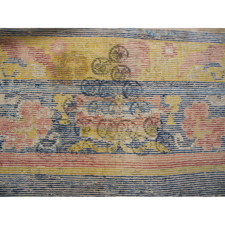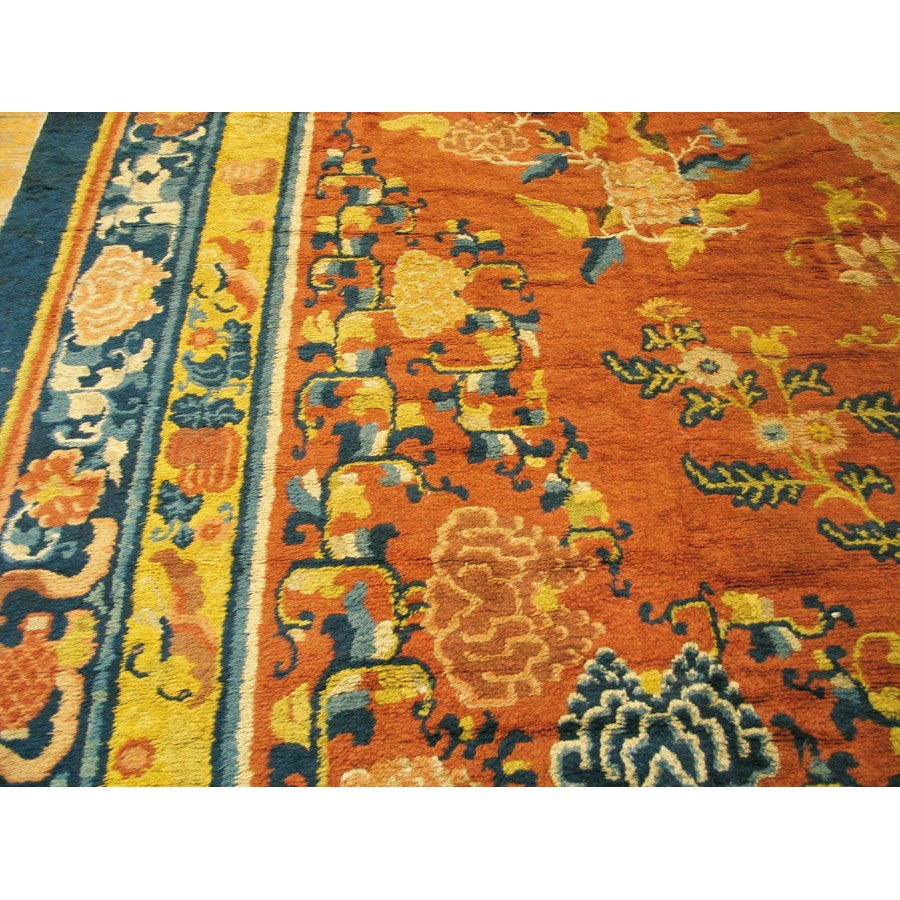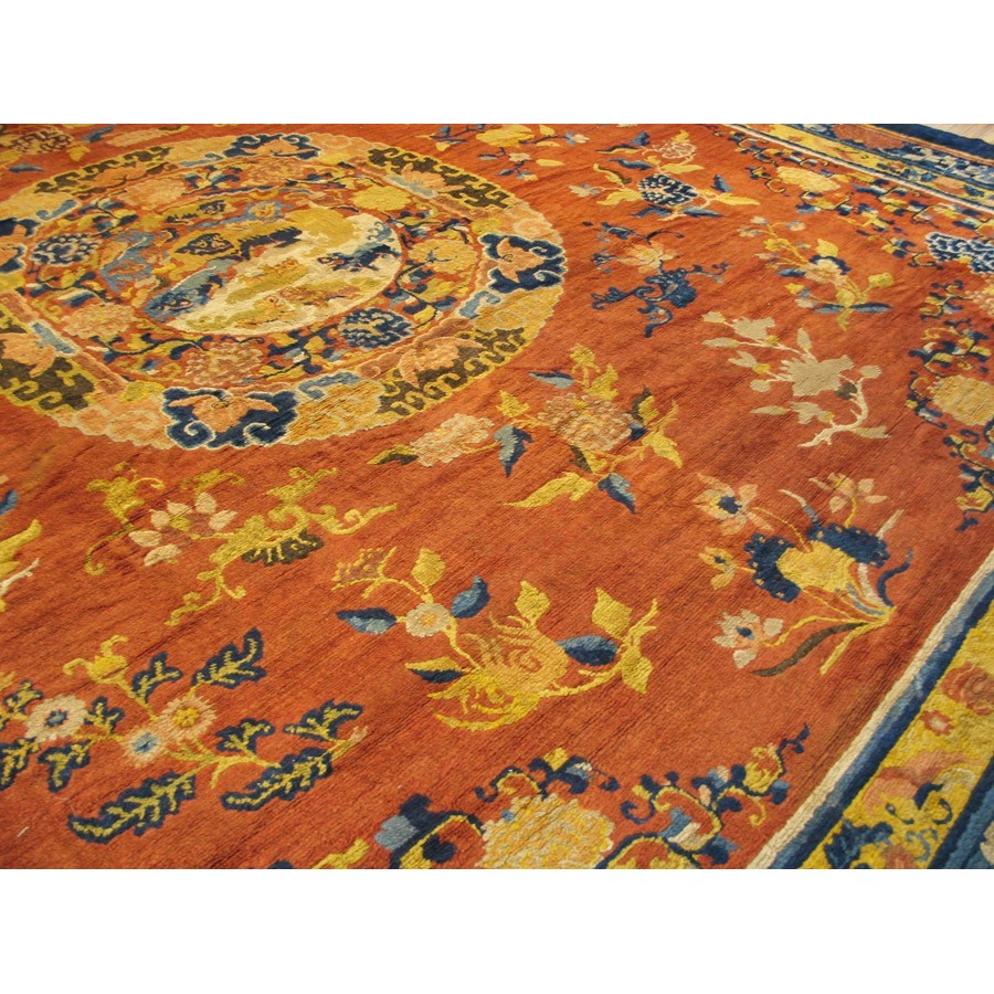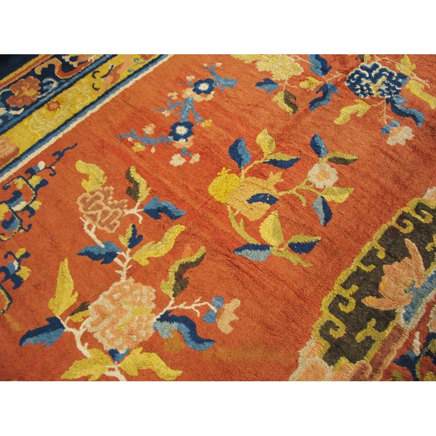 DescriptionChineseCarpets made in China proper. See entries Ningshia, Peking, Art Deco. Chinese - NingxiaThe western Chinese province of Ningshia has a mostly Muslim population and is the source of many of the oldest Chinese carpets of the modern (Ming Dynasty and later) era. The designs are typically Chinese: fretwork or Greek key boarders, pacony palmettes, bats, butterflies, Fu dogs, clouds, dragons, shou symbols, etc. Pollar carpets designed to wrap around monastery columns and displaying a dragon above waves are a specialty. The weave is coarse and soft, with several wefts between knot rows and a longish pile. Yellow golds, dark and light blues are common colors. The outer most plain border on pre 1800 examples is a corrosive brown. Formats include: large square throne carpets, paralleled meditation runners, chair seats and scalloped backs. | |