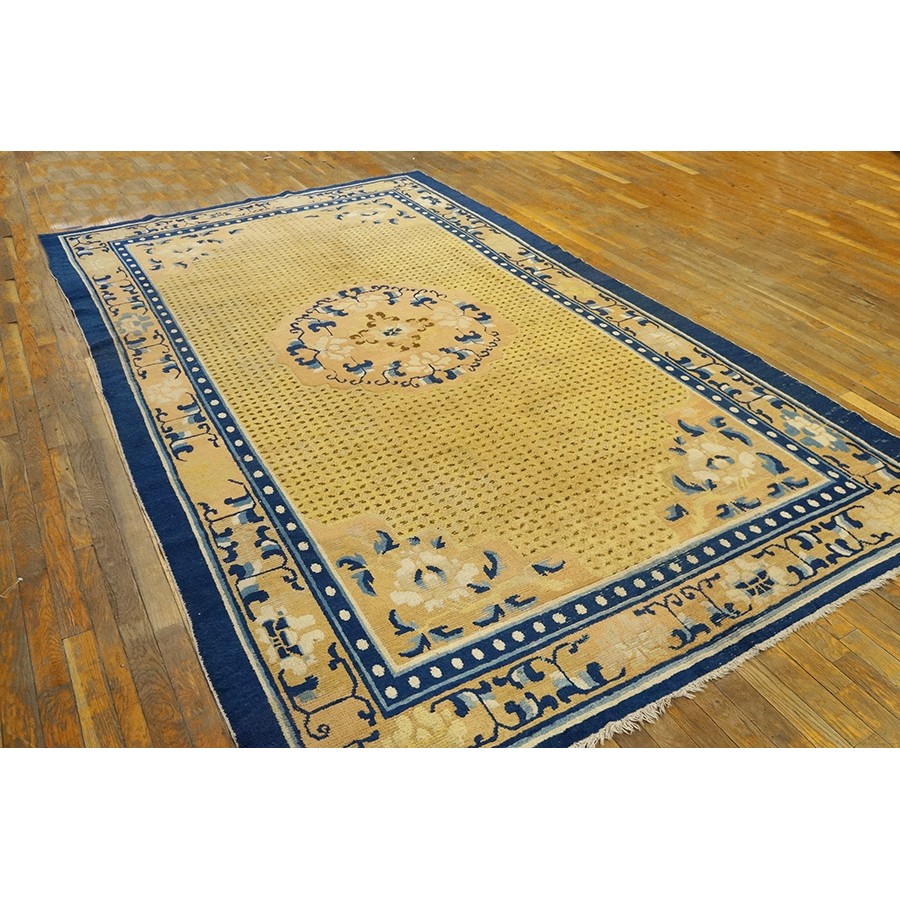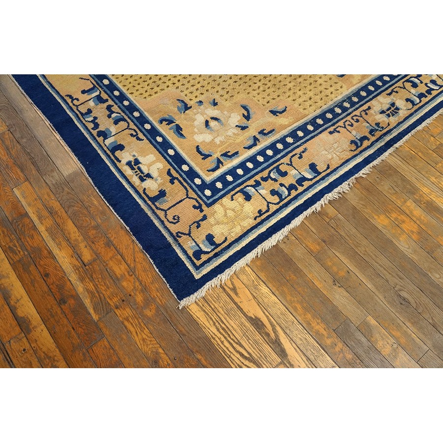 DescriptionChineseCarpets made in China proper. See entries Ningshia, Peking, Art Deco. Chinese - NingxiaThe western Chinese province of Ningshia has a mostly Muslim population and is the source of many of the oldest Chinese carpets of the modern (Ming Dynasty and later) era. The designs are typically Chinese: fretwork or Greek key boarders, pacony palmettes, bats, butterflies, Fu dogs, clouds, dragons, shou symbols, etc. Pollar carpets designed to wrap around monastery columns and displaying a dragon above waves are a specialty. The weave is coarse and soft, with several wefts between knot rows and a longish pile. Yellow golds, dark and light blues are common colors. The outer most plain border on pre 1800 examples is a corrosive brown. Formats include: large square throne carpets, paralleled meditation runners, chair seats and scalloped backs. | |