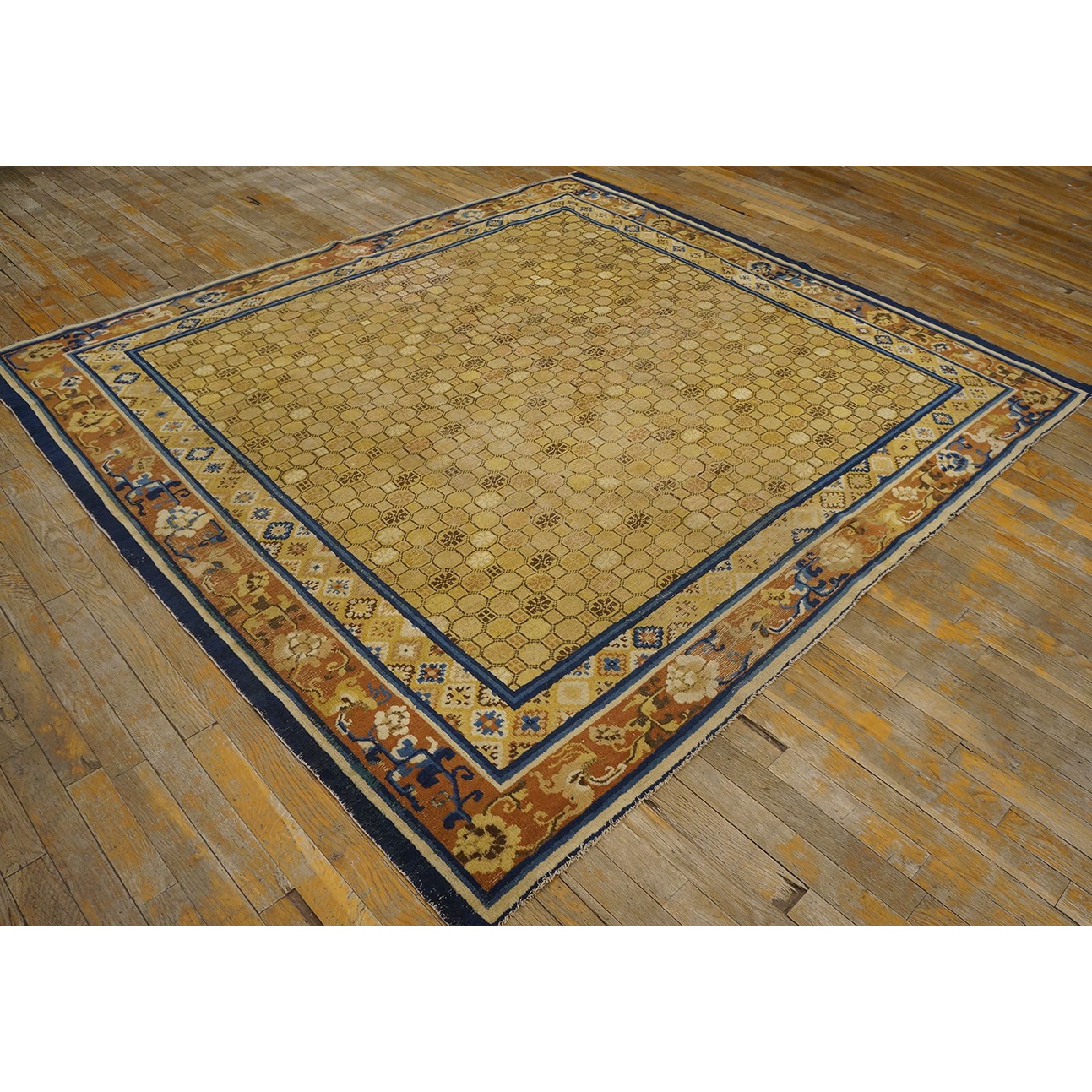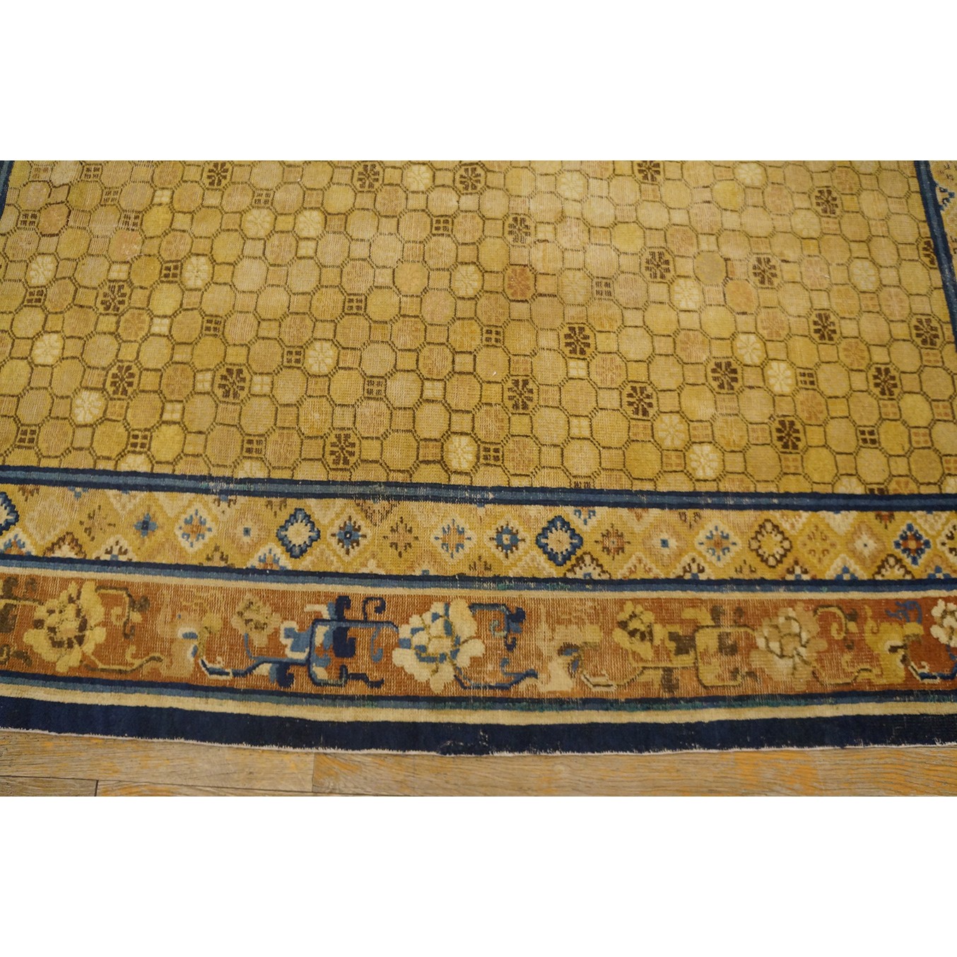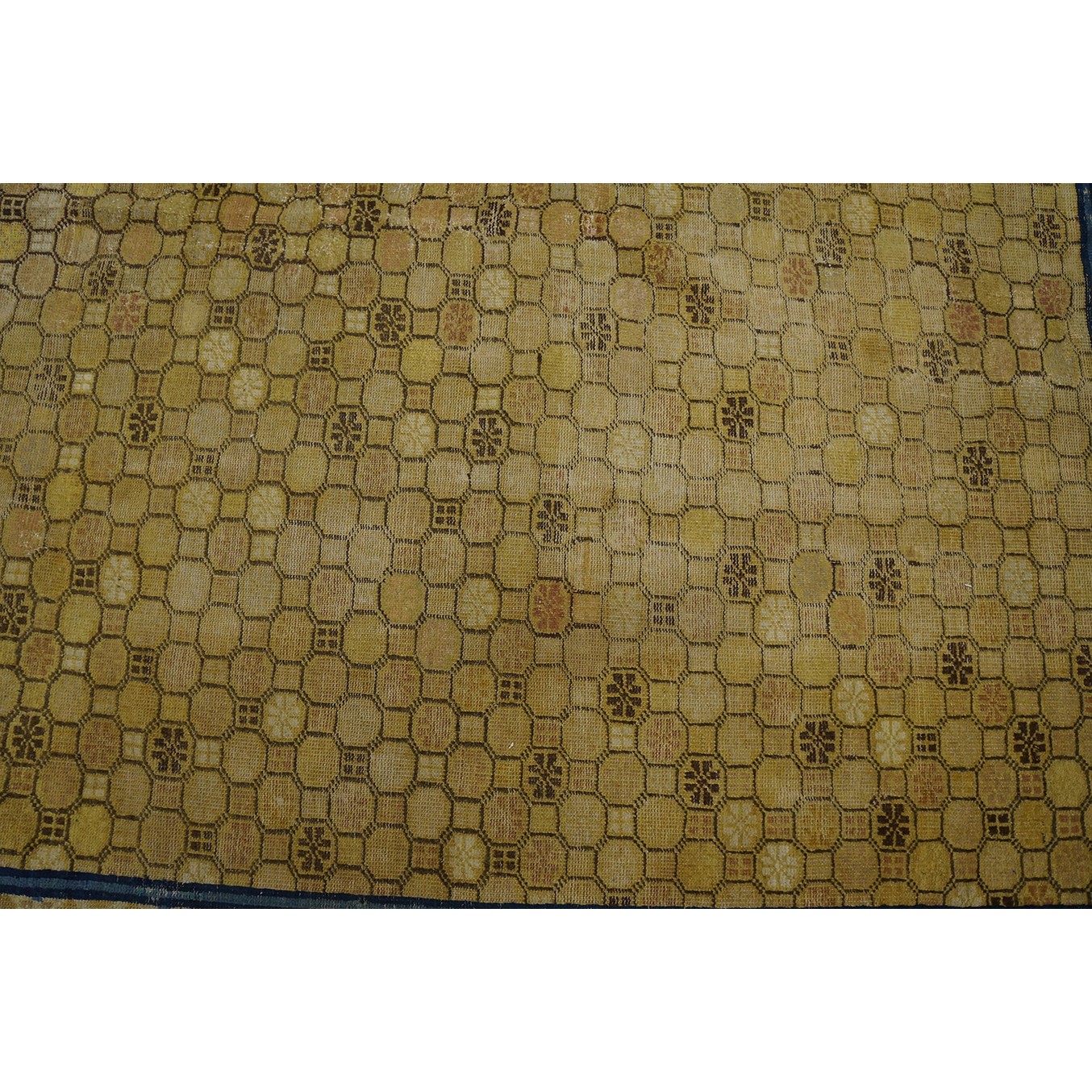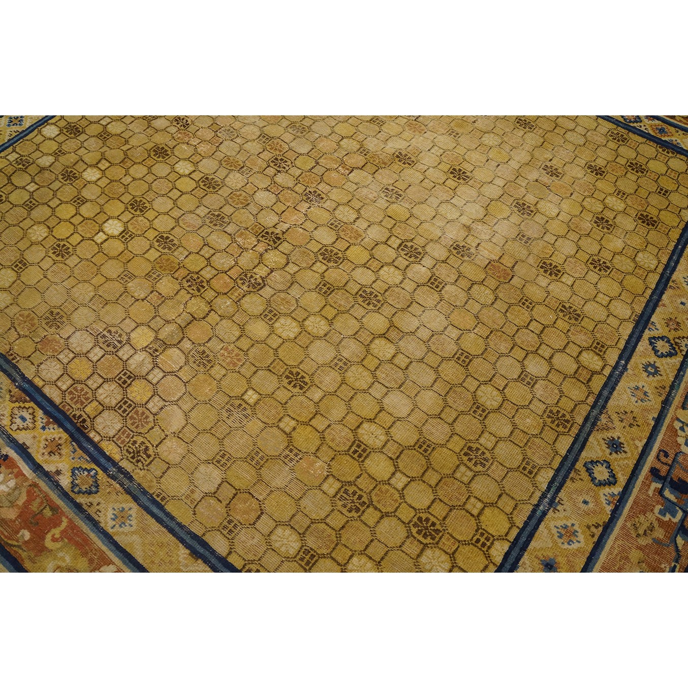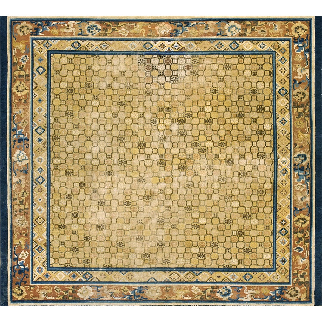 DescriptionChineseCarpets made in China proper. See entries Ningshia, Peking, Art Deco. Chinese - NingxiaThe western Chinese province of Ningshia has a mostly Muslim population and is the source of many of the oldest Chinese carpets of the modern (Ming Dynasty and later) era. The designs are typically Chinese: fretwork or Greek key boarders, pacony palmettes, bats, butterflies, Fu dogs, clouds, dragons, shou symbols, etc. Pollar carpets designed to wrap around monastery columns and displaying a dragon above waves are a specialty. The weave is coarse and soft, with several wefts between knot rows and a longish pile. Yellow golds, dark and light blues are common colors. The outer most plain border on pre 1800 examples is a corrosive brown. Formats include: large square throne carpets, paralleled meditation runners, chair seats and scalloped backs. | |