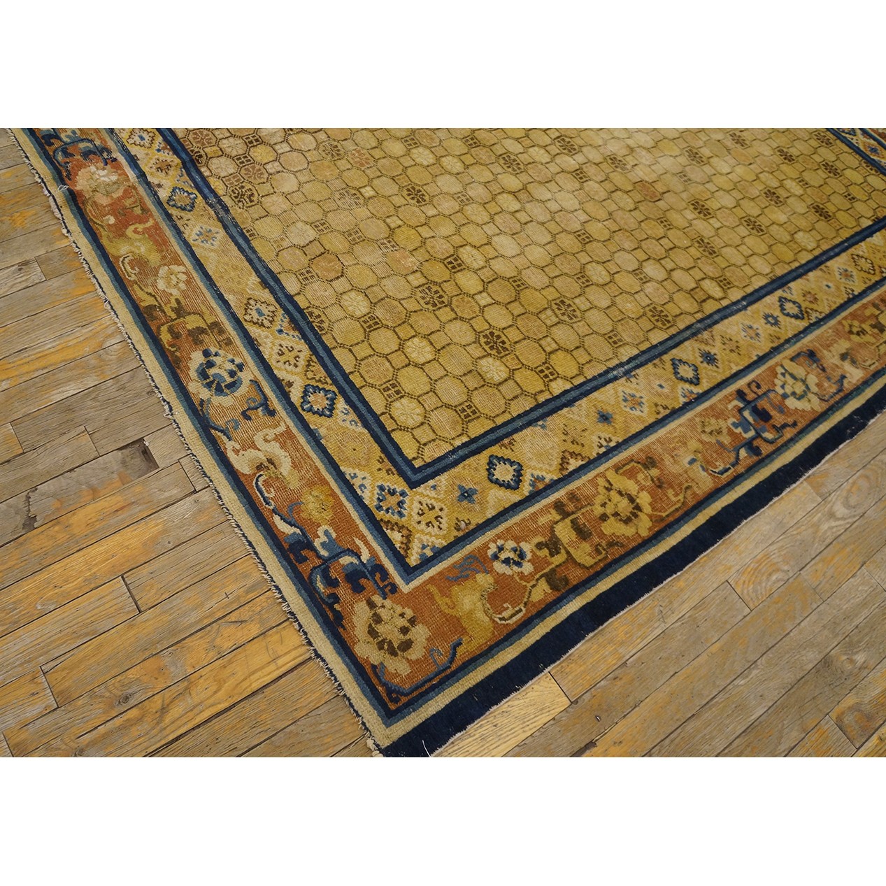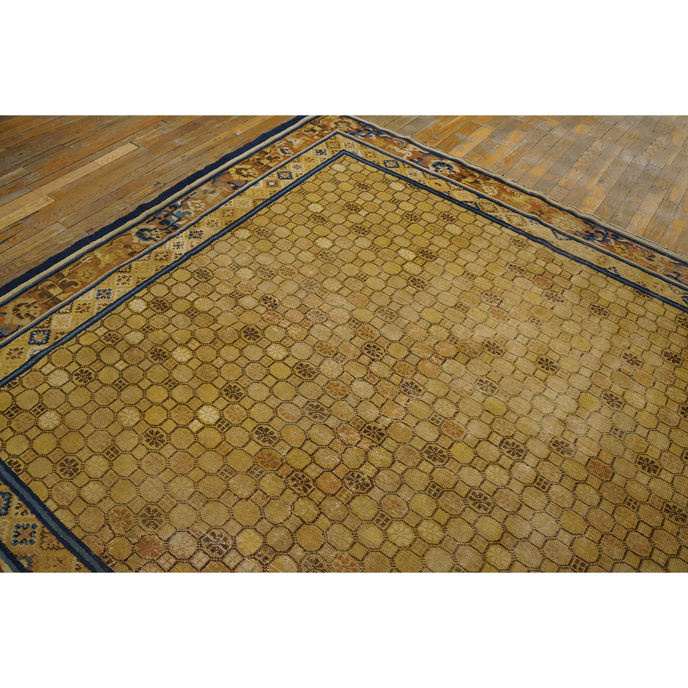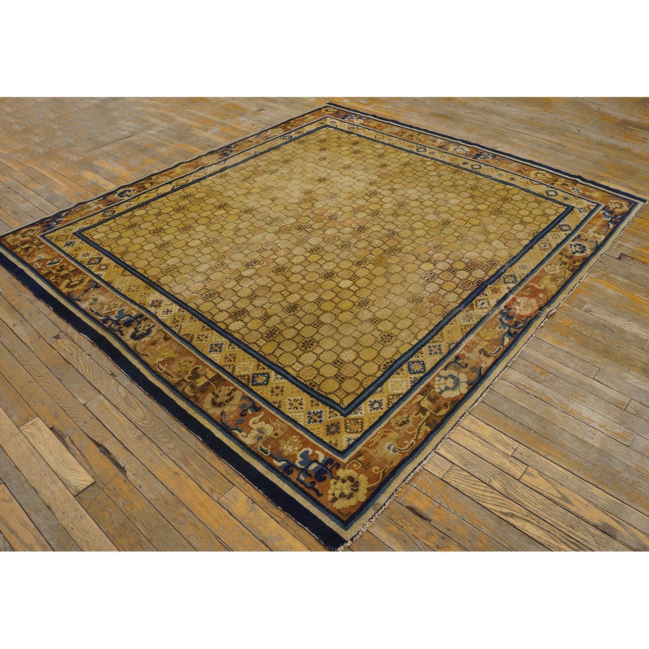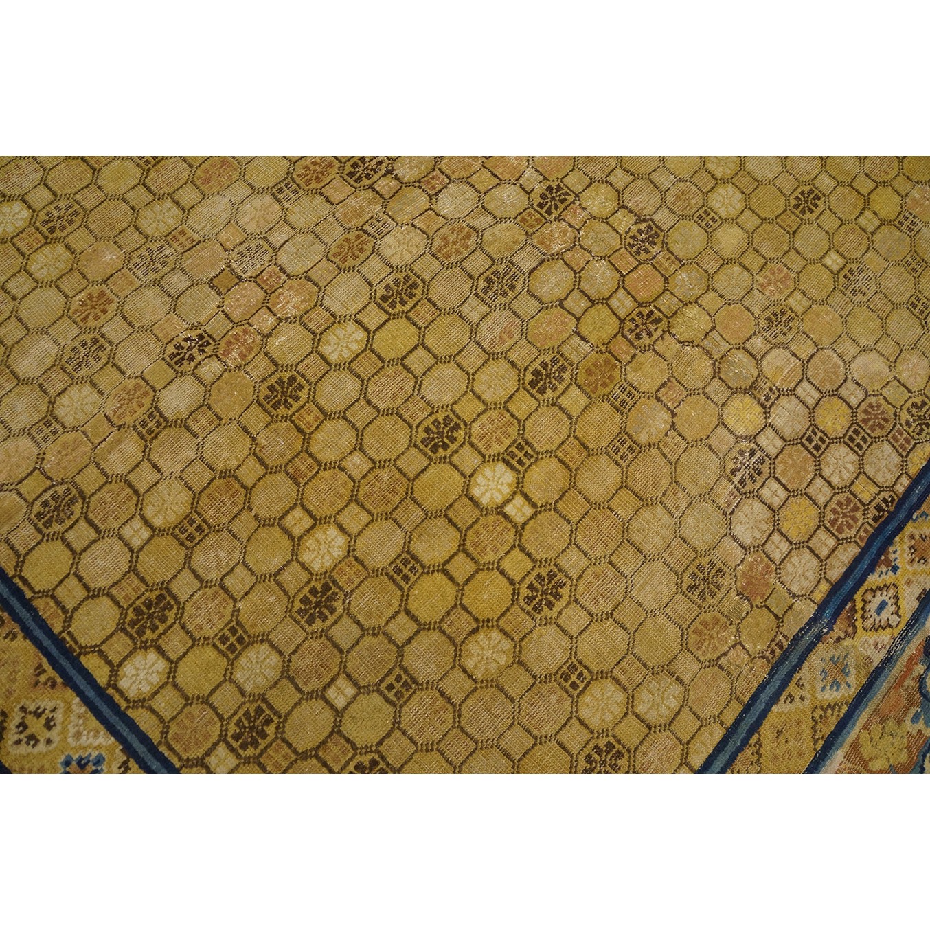 DescriptionChineseCarpets made in China proper. See entries Ningshia, Peking, Art Deco. Chinese - NingxiaThe western Chinese province of Ningshia has a mostly Muslim population and is the source of many of the oldest Chinese carpets of the modern (Ming Dynasty and later) era. The designs are typically Chinese: fretwork or Greek key boarders, pacony palmettes, bats, butterflies, Fu dogs, clouds, dragons, shou symbols, etc. Pollar carpets designed to wrap around monastery columns and displaying a dragon above waves are a specialty. The weave is coarse and soft, with several wefts between knot rows and a longish pile. Yellow golds, dark and light blues are common colors. The outer most plain border on pre 1800 examples is a corrosive brown. Formats include: large square throne carpets, paralleled meditation runners, chair seats and scalloped backs. | |