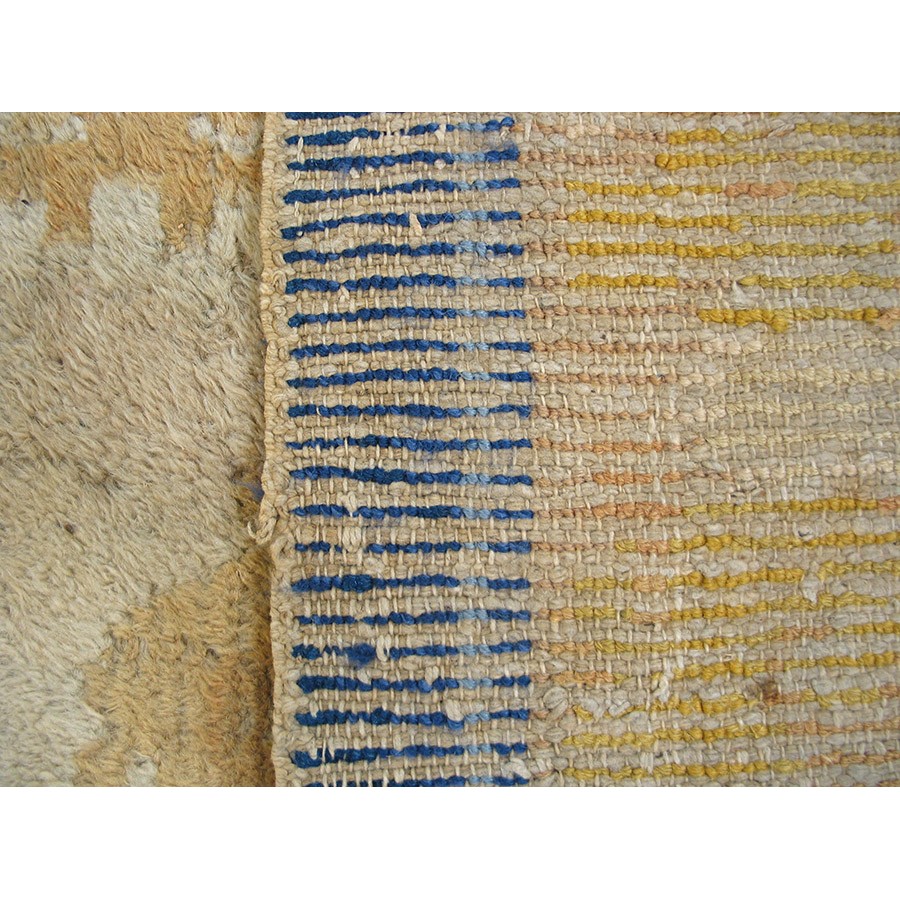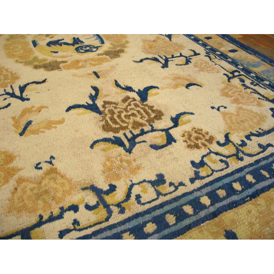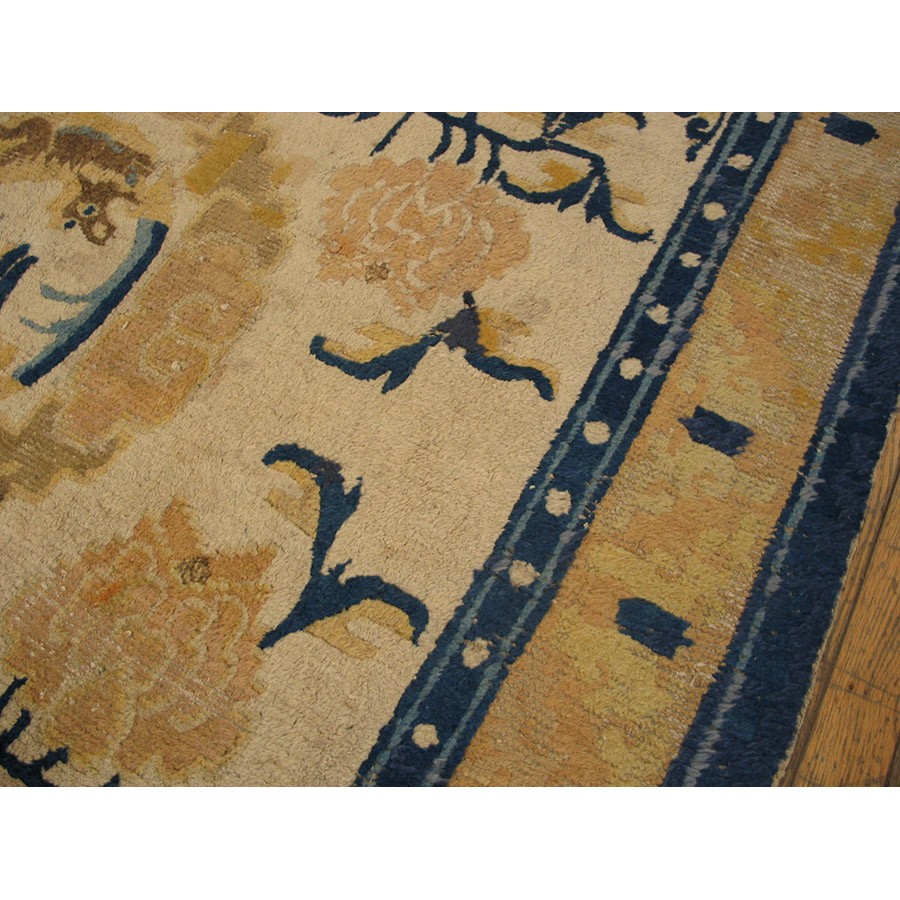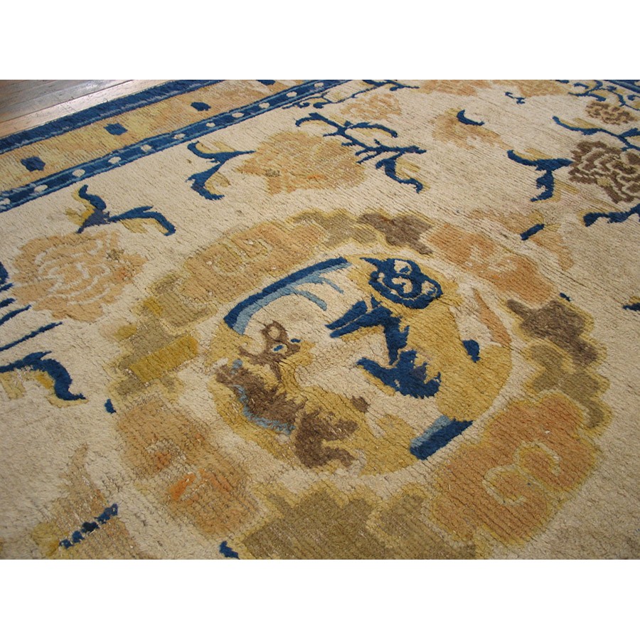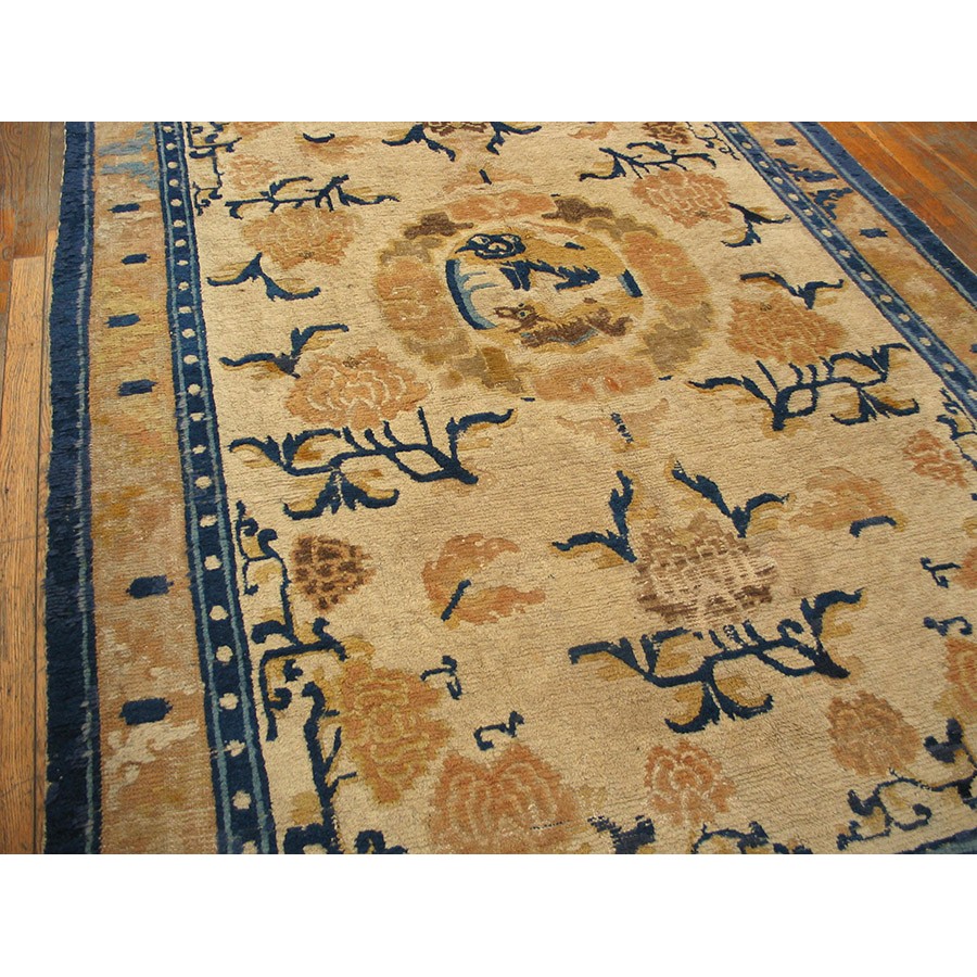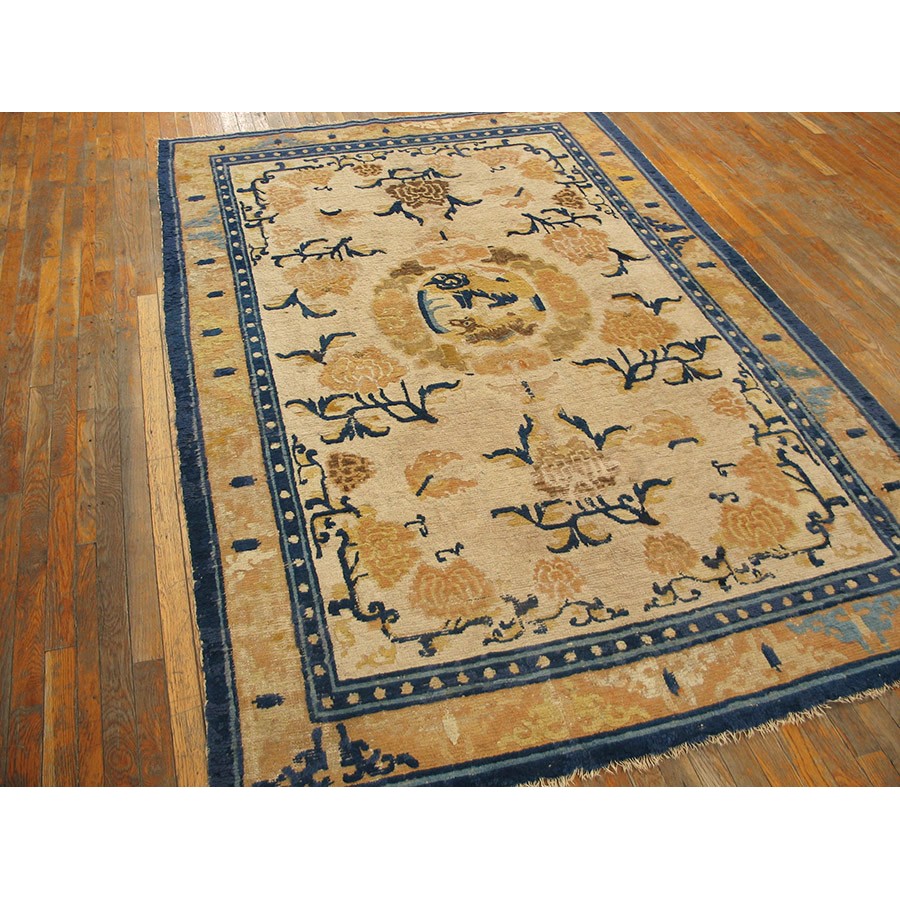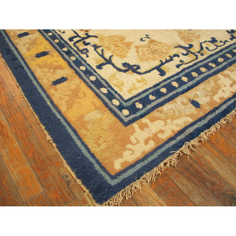 DescriptionChineseCarpets made in China proper. See entries Ningshia, Peking, Art Deco. Chinese - NingxiaThe western Chinese province of Ningshia has a mostly Muslim population and is the source of many of the oldest Chinese carpets of the modern (Ming Dynasty and later) era. The designs are typically Chinese: fretwork or Greek key boarders, pacony palmettes, bats, butterflies, Fu dogs, clouds, dragons, shou symbols, etc. Pollar carpets designed to wrap around monastery columns and displaying a dragon above waves are a specialty. The weave is coarse and soft, with several wefts between knot rows and a longish pile. Yellow golds, dark and light blues are common colors. The outer most plain border on pre 1800 examples is a corrosive brown. Formats include: large square throne carpets, paralleled meditation runners, chair seats and scalloped backs. | |