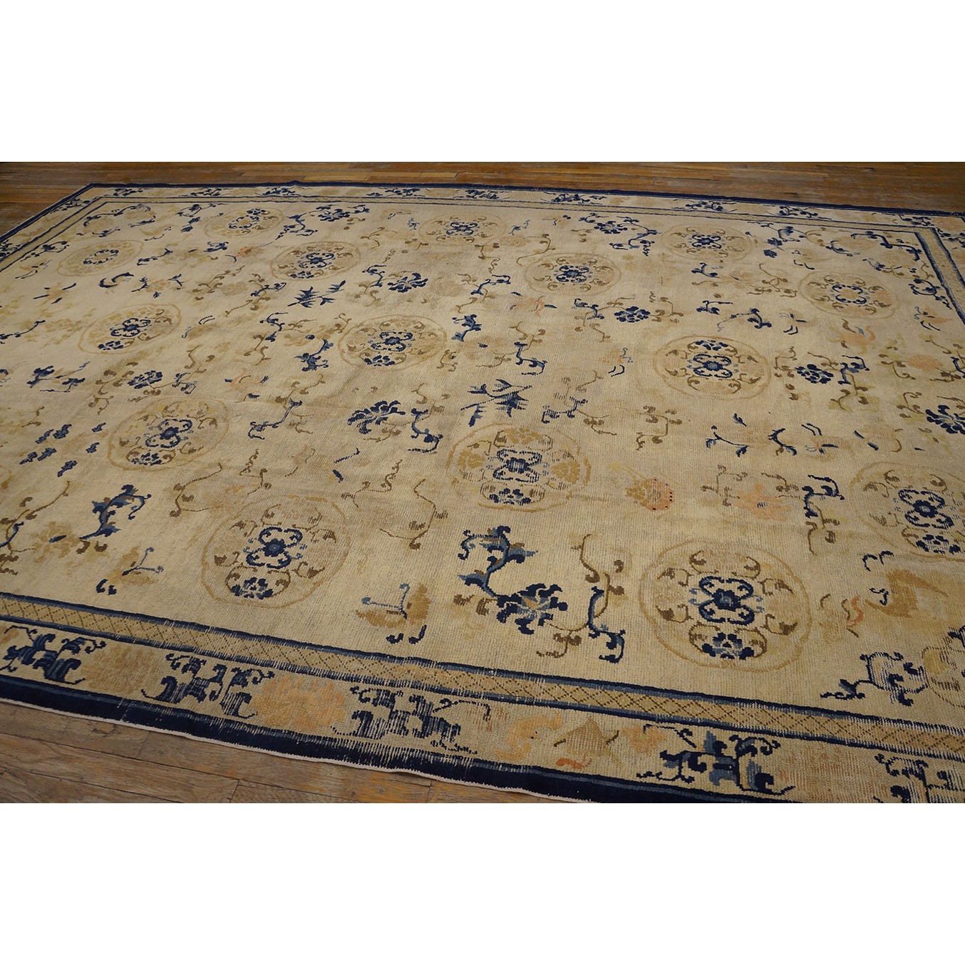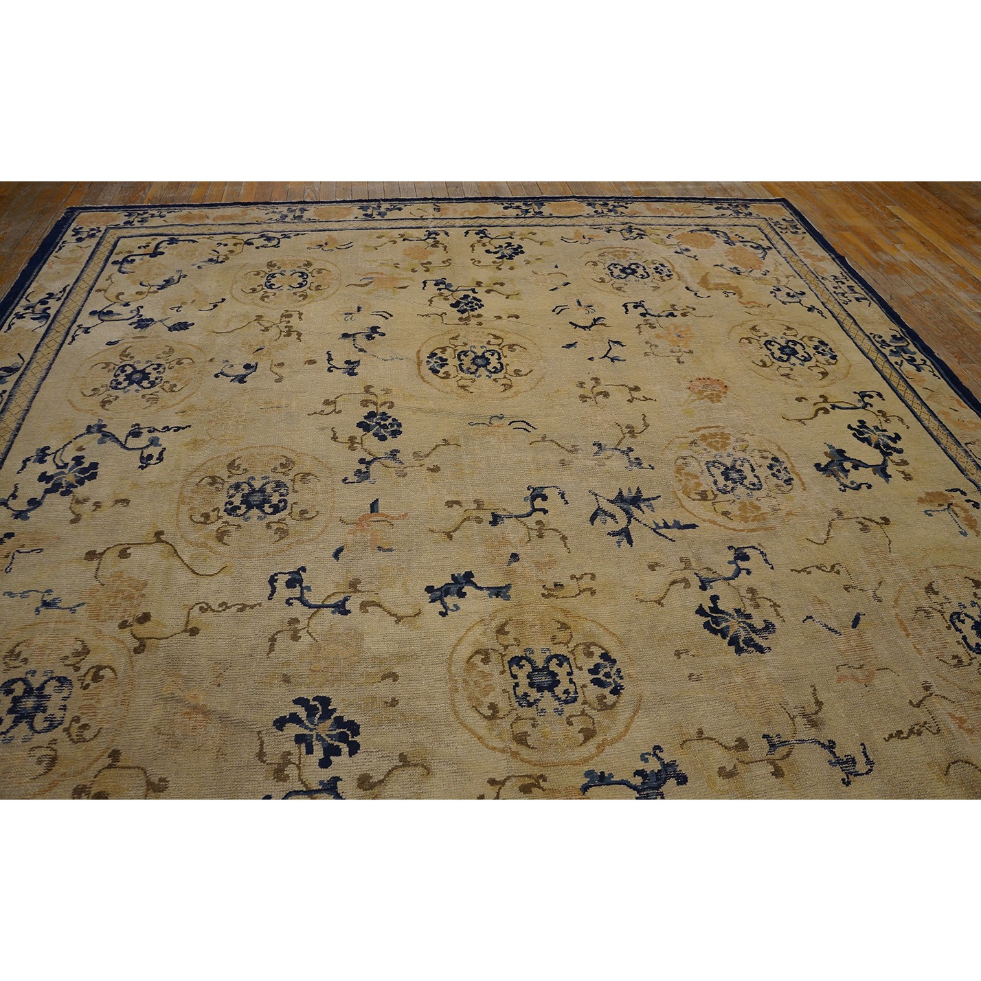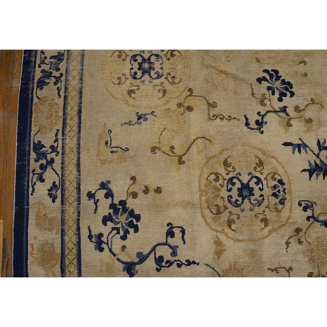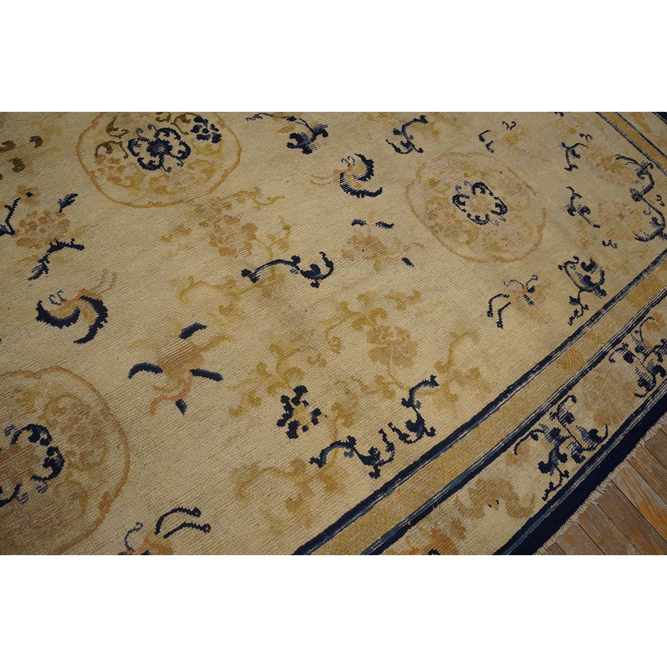 DescriptionChineseCarpets made in China proper. See entries Ningshia, Peking, Art Deco. Chinese - NingxiaThe western Chinese province of Ningshia has a mostly Muslim population and is the source of many of the oldest Chinese carpets of the modern (Ming Dynasty and later) era. The designs are typically Chinese: fretwork or Greek key boarders, pacony palmettes, bats, butterflies, Fu dogs, clouds, dragons, shou symbols, etc. Pollar carpets designed to wrap around monastery columns and displaying a dragon above waves are a specialty. The weave is coarse and soft, with several wefts between knot rows and a longish pile. Yellow golds, dark and light blues are common colors. The outer most plain border on pre 1800 examples is a corrosive brown. Formats include: large square throne carpets, paralleled meditation runners, chair seats and scalloped backs. | |