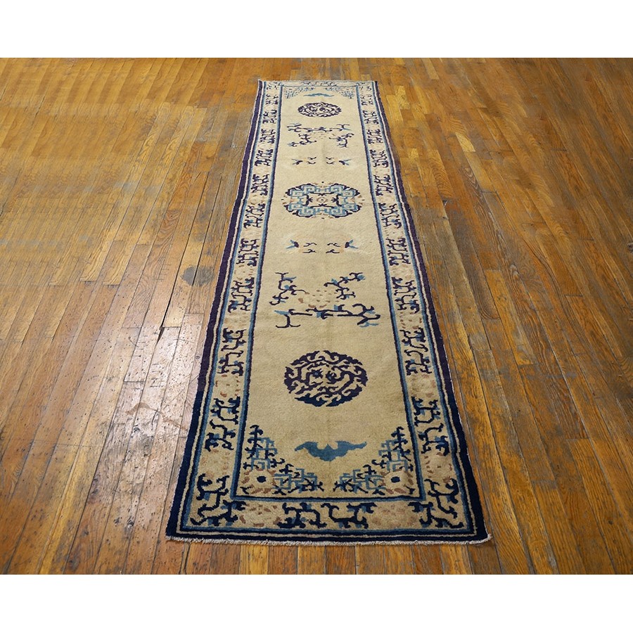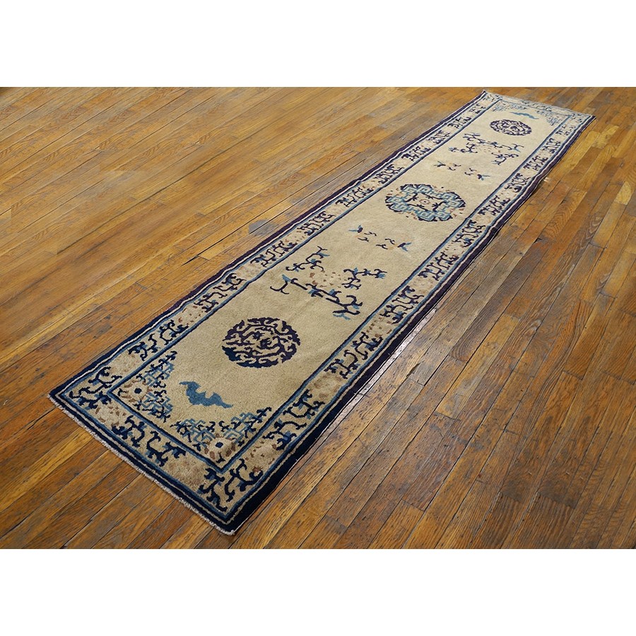 DescriptionChineseCarpets made in China proper. See entries Ningshia, Peking, Art Deco. Chinese - NingxiaThe western Chinese province of Ningshia has a mostly Muslim population and is the source of many of the oldest Chinese carpets of the modern (Ming Dynasty and later) era. The designs are typically Chinese: fretwork or Greek key boarders, pacony palmettes, bats, butterflies, Fu dogs, clouds, dragons, shou symbols, etc. Pollar carpets designed to wrap around monastery columns and displaying a dragon above waves are a specialty. The weave is coarse and soft, with several wefts between knot rows and a longish pile. Yellow golds, dark and light blues are common colors. The outer most plain border on pre 1800 examples is a corrosive brown. Formats include: large square throne carpets, paralleled meditation runners, chair seats and scalloped backs. | |
