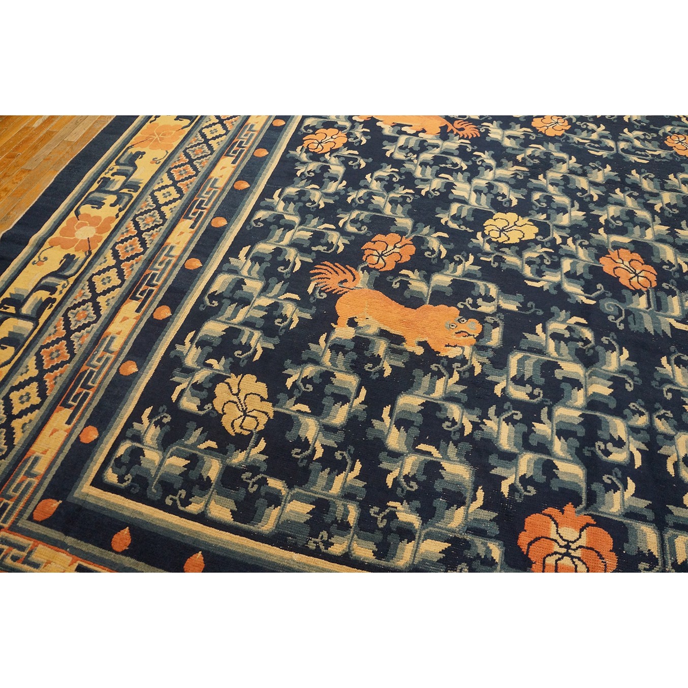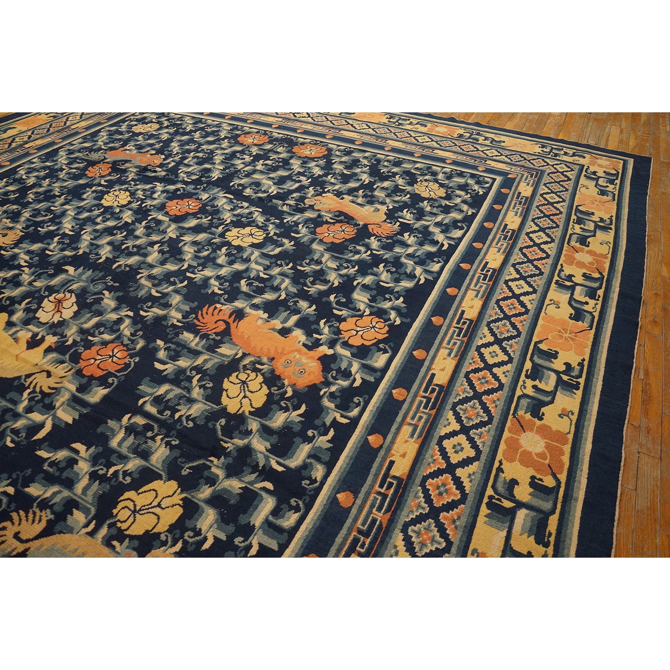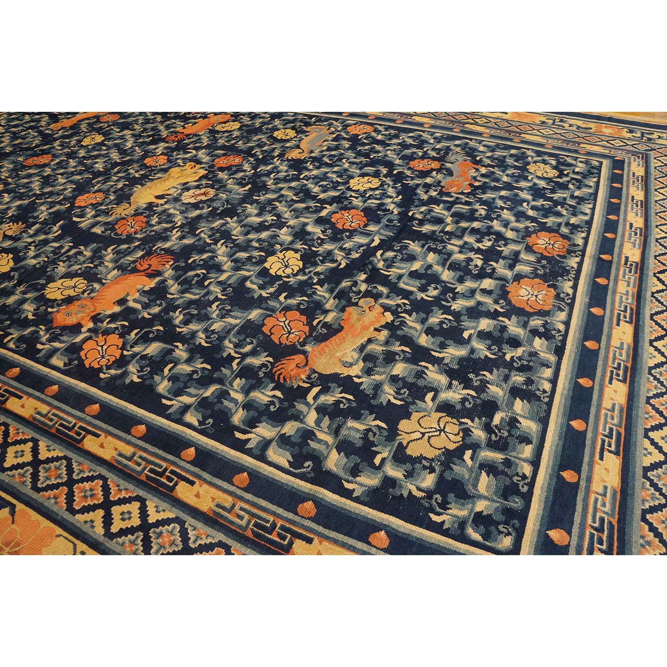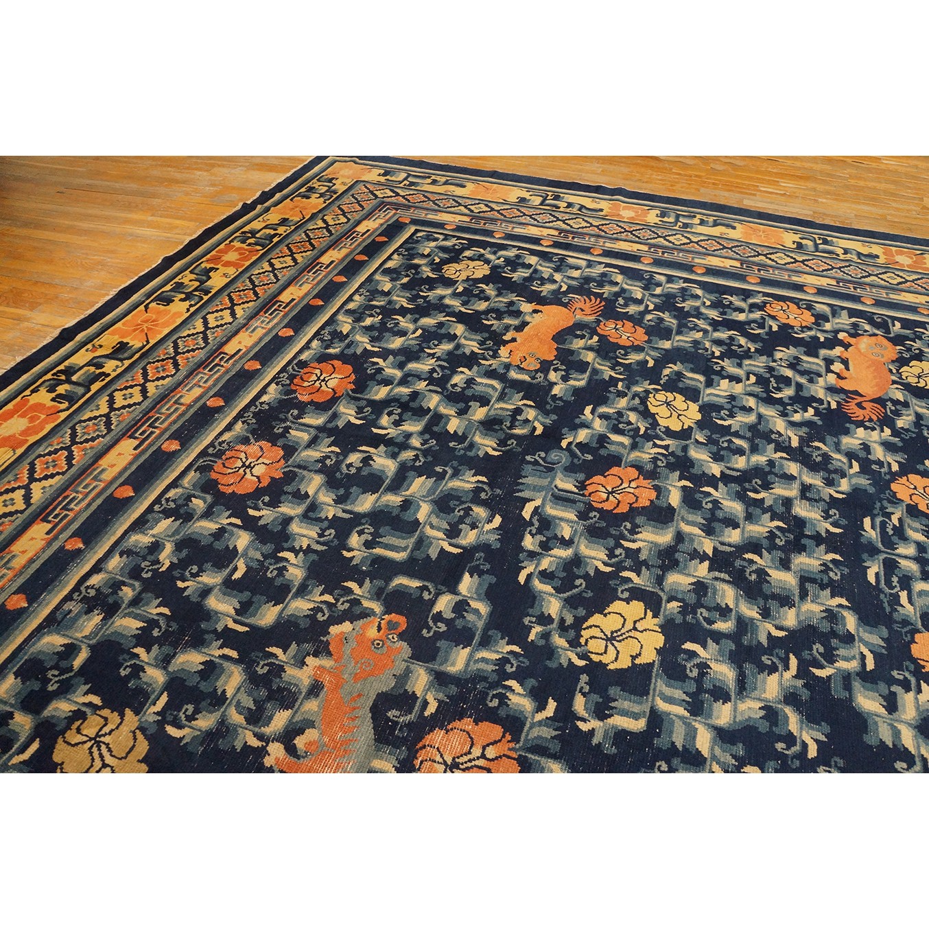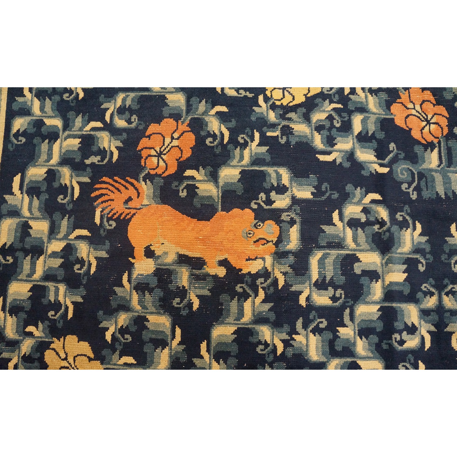 DescriptionChineseCarpets made in China proper. See entries Ningshia, Peking, Art Deco. Chinese - NingxiaThe western Chinese province of Ningshia has a mostly Muslim population and is the source of many of the oldest Chinese carpets of the modern (Ming Dynasty and later) era. The designs are typically Chinese: fretwork or Greek key boarders, pacony palmettes, bats, butterflies, Fu dogs, clouds, dragons, shou symbols, etc. Pollar carpets designed to wrap around monastery columns and displaying a dragon above waves are a specialty. The weave is coarse and soft, with several wefts between knot rows and a longish pile. Yellow golds, dark and light blues are common colors. The outer most plain border on pre 1800 examples is a corrosive brown. Formats include: large square throne carpets, paralleled meditation runners, chair seats and scalloped backs. | |