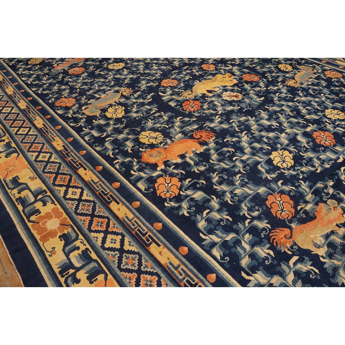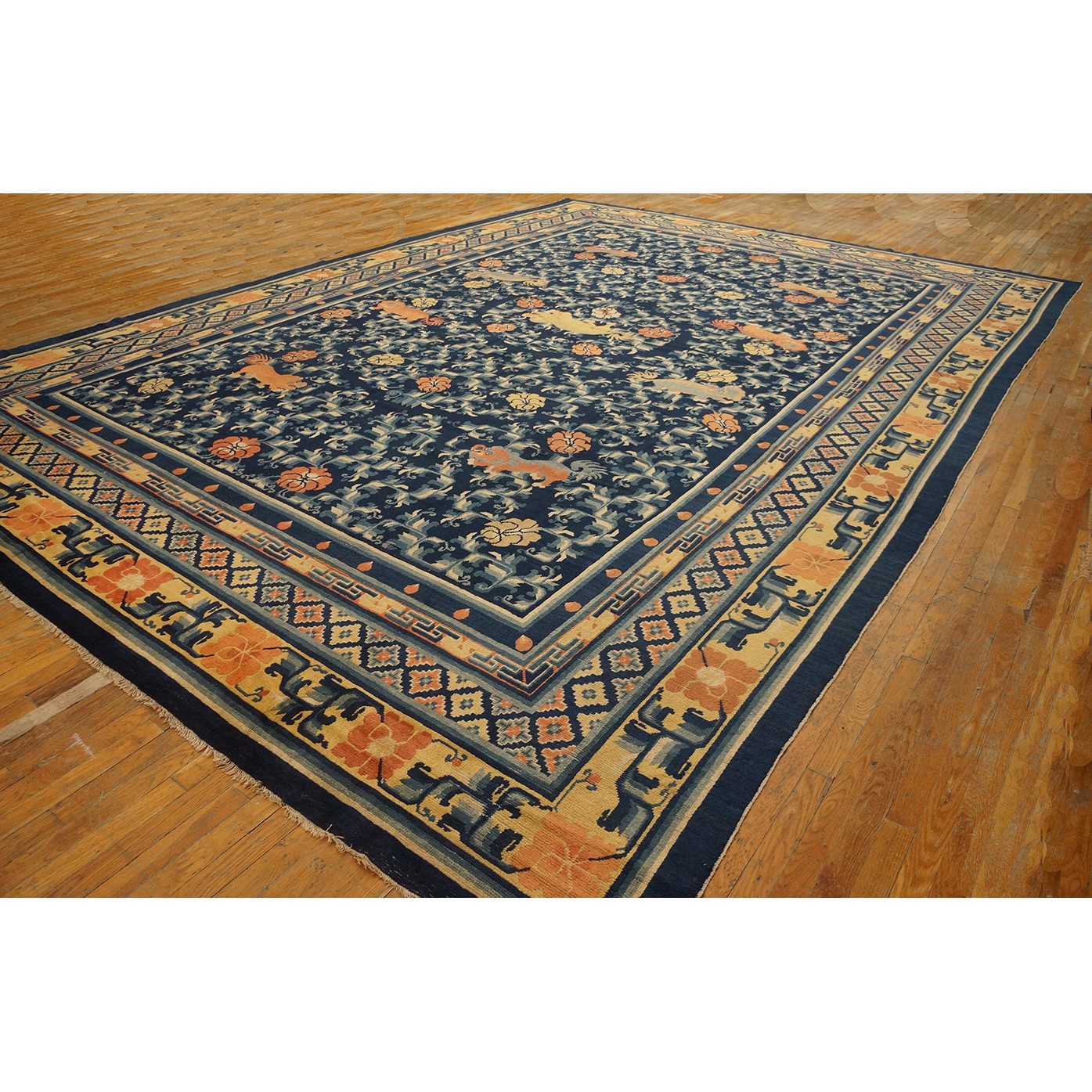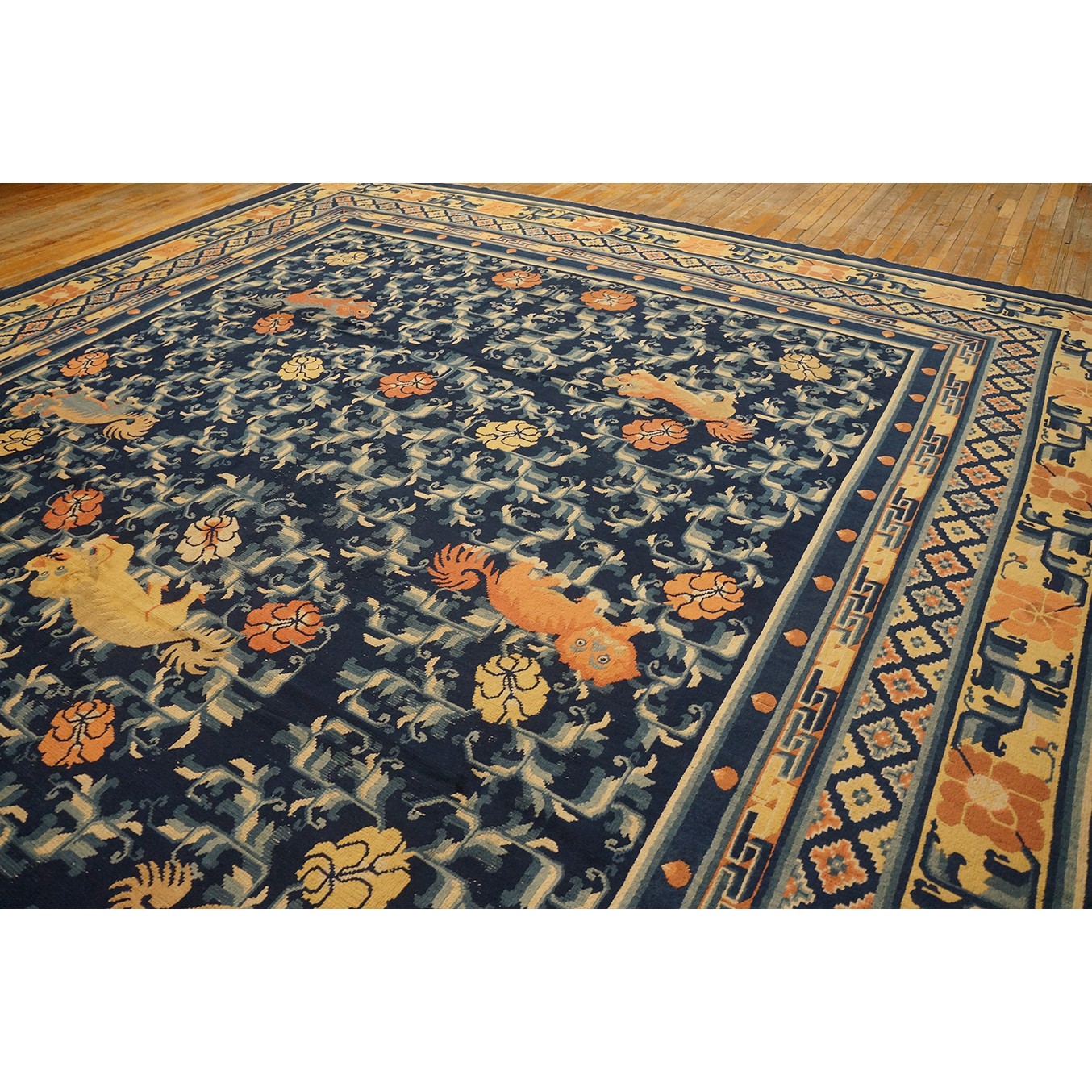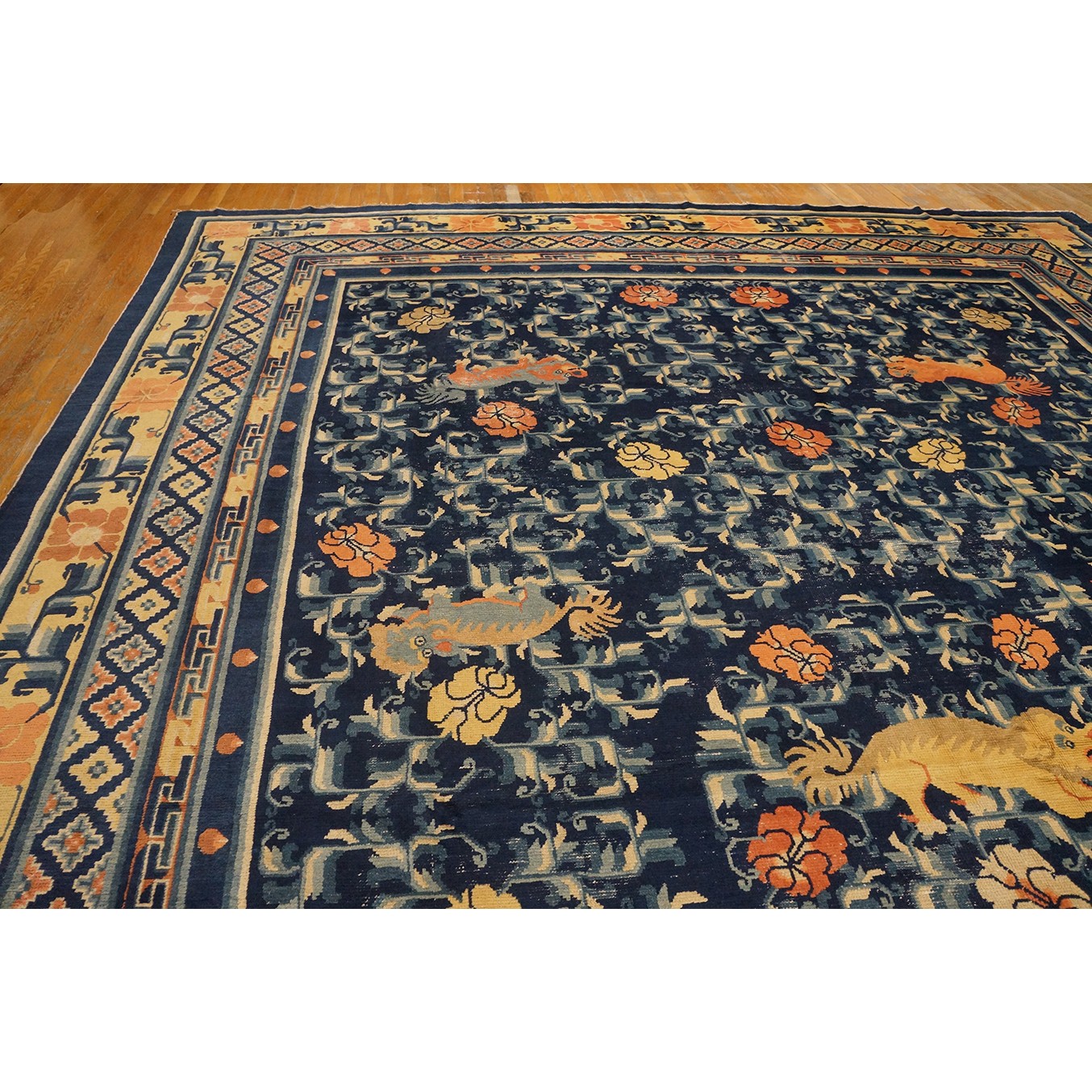 DescriptionChineseCarpets made in China proper. See entries Ningshia, Peking, Art Deco. Chinese - NingxiaThe western Chinese province of Ningshia has a mostly Muslim population and is the source of many of the oldest Chinese carpets of the modern (Ming Dynasty and later) era. The designs are typically Chinese: fretwork or Greek key boarders, pacony palmettes, bats, butterflies, Fu dogs, clouds, dragons, shou symbols, etc. Pollar carpets designed to wrap around monastery columns and displaying a dragon above waves are a specialty. The weave is coarse and soft, with several wefts between knot rows and a longish pile. Yellow golds, dark and light blues are common colors. The outer most plain border on pre 1800 examples is a corrosive brown. Formats include: large square throne carpets, paralleled meditation runners, chair seats and scalloped backs. | |