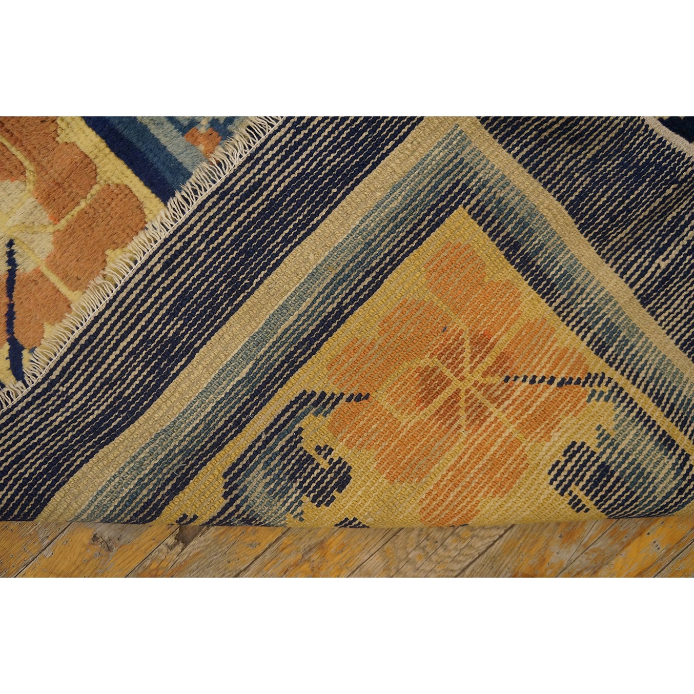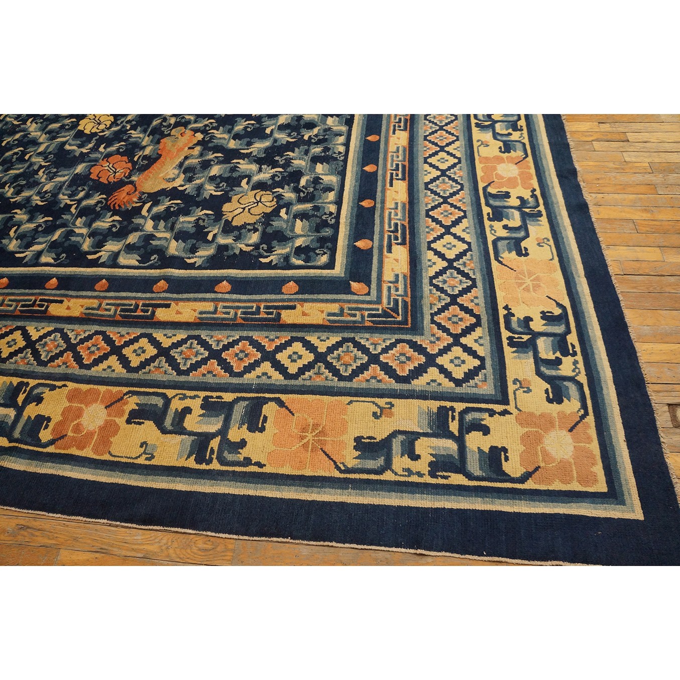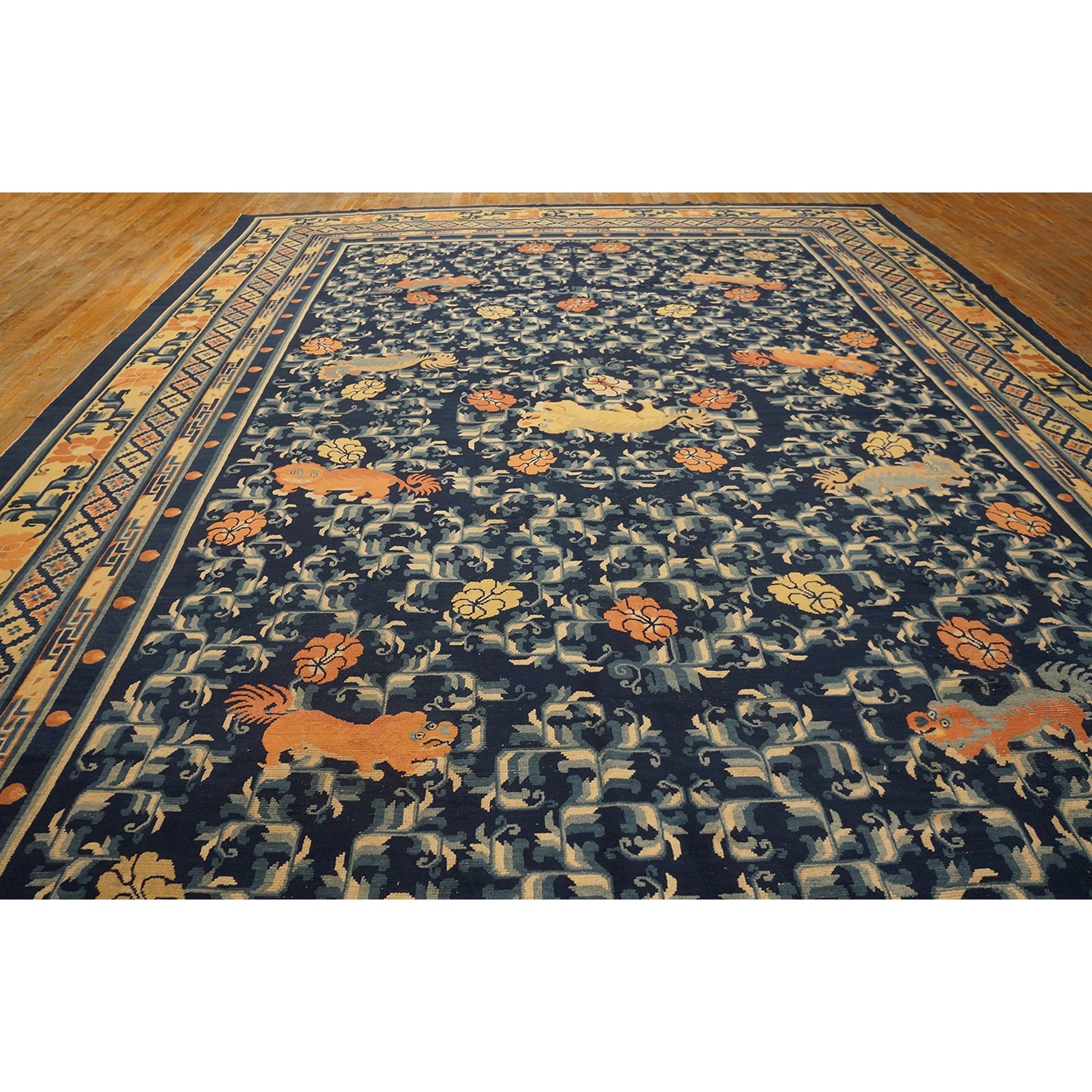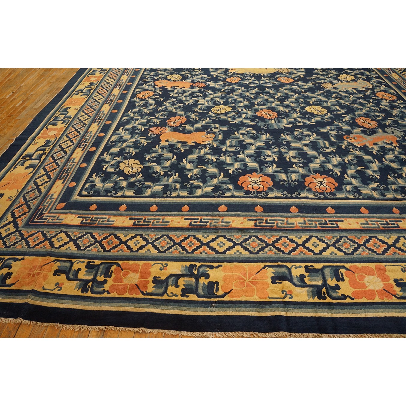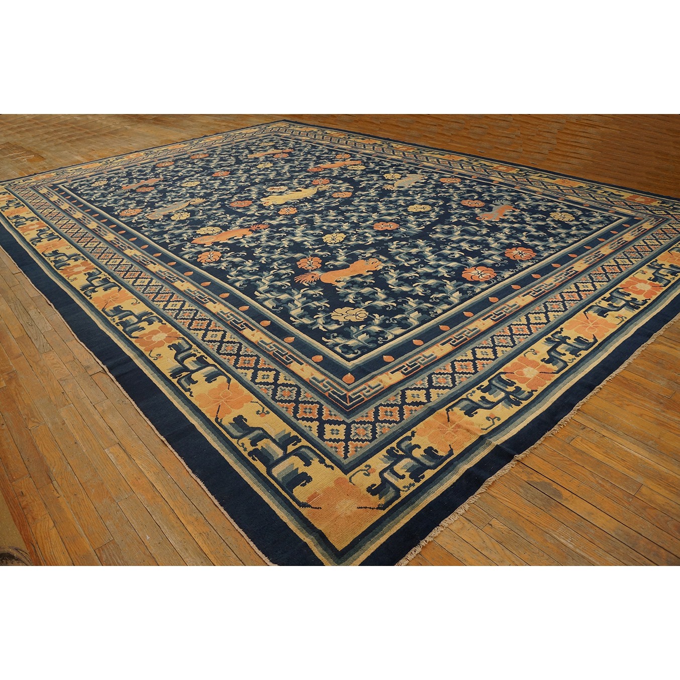 DescriptionChineseCarpets made in China proper. See entries Ningshia, Peking, Art Deco. Chinese - NingxiaThe western Chinese province of Ningshia has a mostly Muslim population and is the source of many of the oldest Chinese carpets of the modern (Ming Dynasty and later) era. The designs are typically Chinese: fretwork or Greek key boarders, pacony palmettes, bats, butterflies, Fu dogs, clouds, dragons, shou symbols, etc. Pollar carpets designed to wrap around monastery columns and displaying a dragon above waves are a specialty. The weave is coarse and soft, with several wefts between knot rows and a longish pile. Yellow golds, dark and light blues are common colors. The outer most plain border on pre 1800 examples is a corrosive brown. Formats include: large square throne carpets, paralleled meditation runners, chair seats and scalloped backs. | |