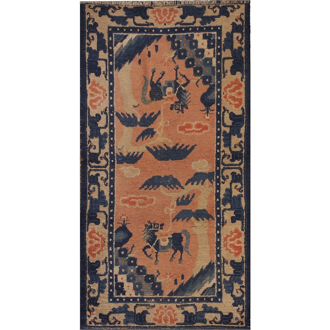DescriptionChineseCarpets made in China proper. See entries Ningshia, Peking, Art Deco. Chinese - NingxiaThe western Chinese province of Ningshia has a mostly Muslim population and is the source of many of the oldest Chinese carpets of the modern (Ming Dynasty and later) era. The designs are typically Chinese: fretwork or Greek key boarders, pacony palmettes, bats, butterflies, Fu dogs, clouds, dragons, shou symbols, etc. Pollar carpets designed to wrap around monastery columns and displaying a dragon above waves are a specialty. The weave is coarse and soft, with several wefts between knot rows and a longish pile. Yellow golds, dark and light blues are common colors. The outer most plain border on pre 1800 examples is a corrosive brown. Formats include: large square throne carpets, paralleled meditation runners, chair seats and scalloped backs. | |