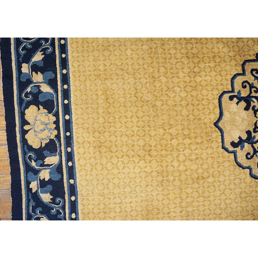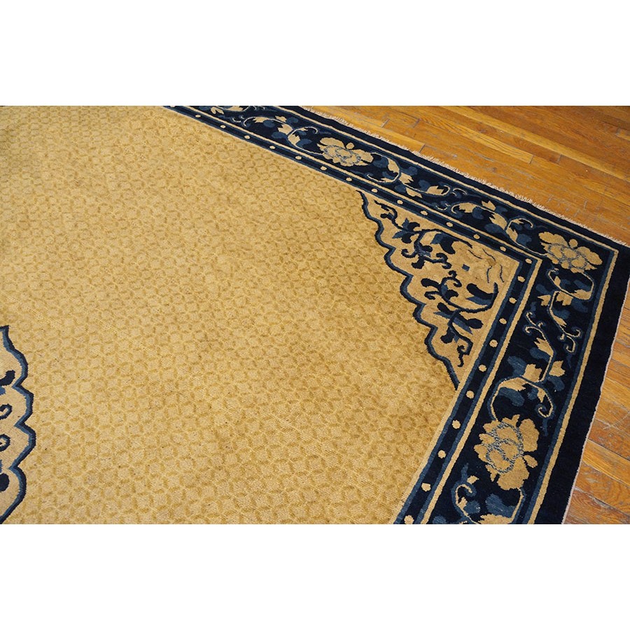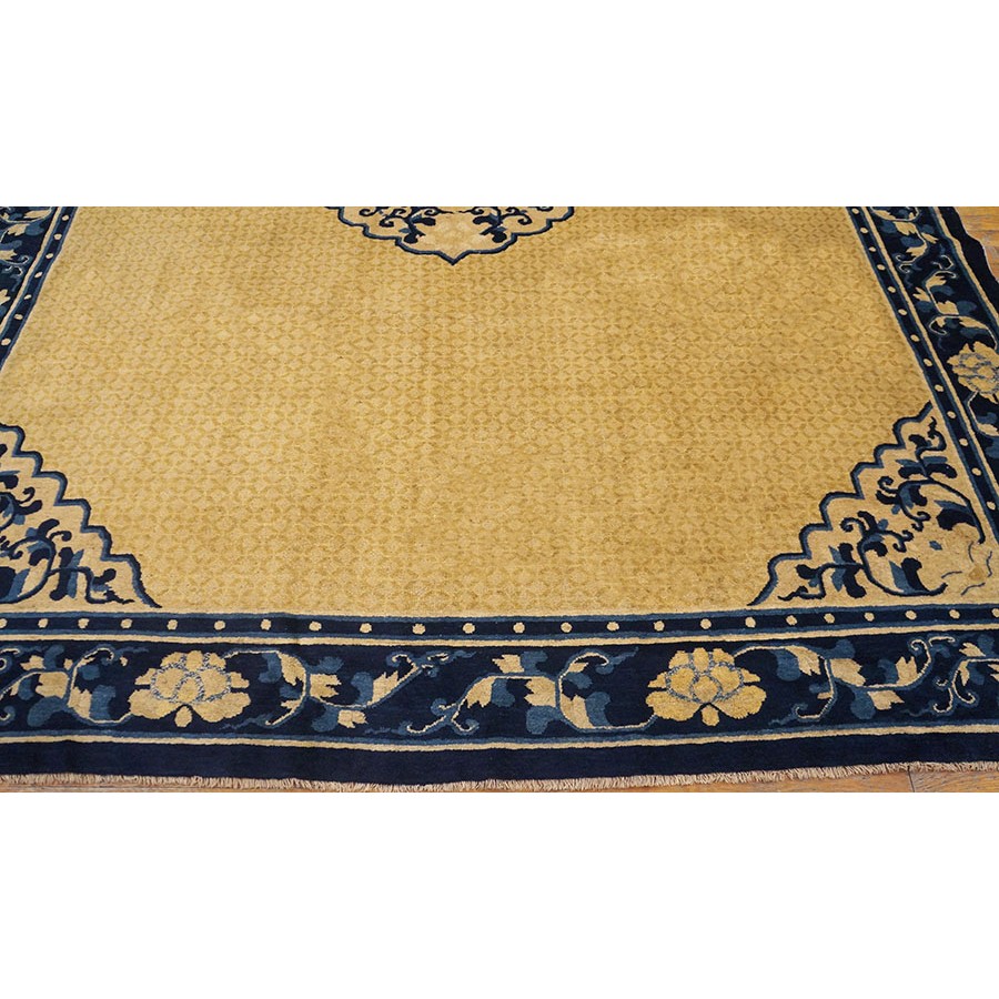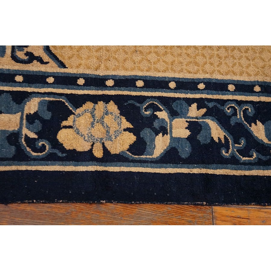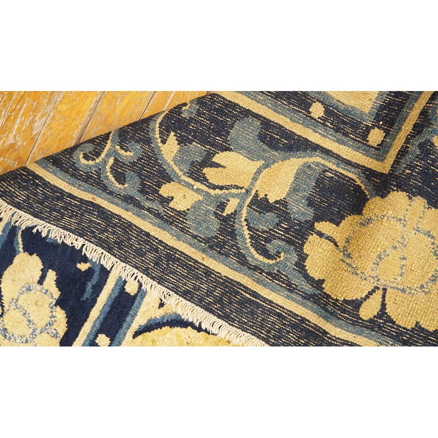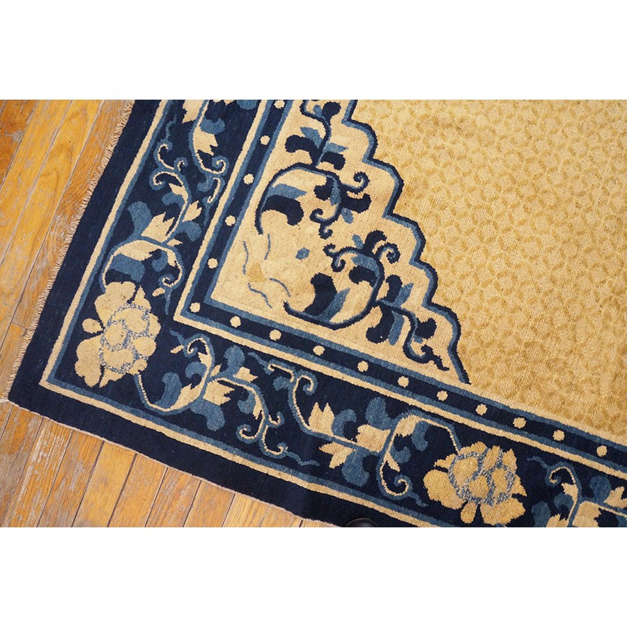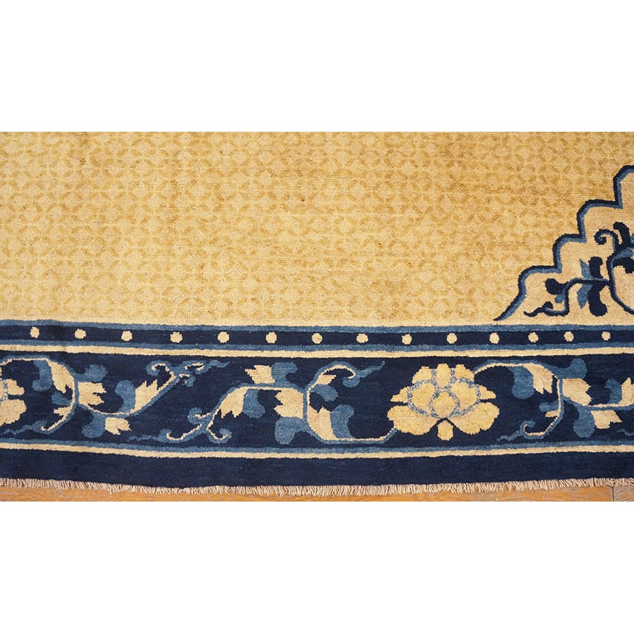 DescriptionChineseCarpets made in China proper. See entries Ningshia, Peking, Art Deco. Chinese - NingxiaThe western Chinese province of Ningshia has a mostly Muslim population and is the source of many of the oldest Chinese carpets of the modern (Ming Dynasty and later) era. The designs are typically Chinese: fretwork or Greek key boarders, pacony palmettes, bats, butterflies, Fu dogs, clouds, dragons, shou symbols, etc. Pollar carpets designed to wrap around monastery columns and displaying a dragon above waves are a specialty. The weave is coarse and soft, with several wefts between knot rows and a longish pile. Yellow golds, dark and light blues are common colors. The outer most plain border on pre 1800 examples is a corrosive brown. Formats include: large square throne carpets, paralleled meditation runners, chair seats and scalloped backs. | |