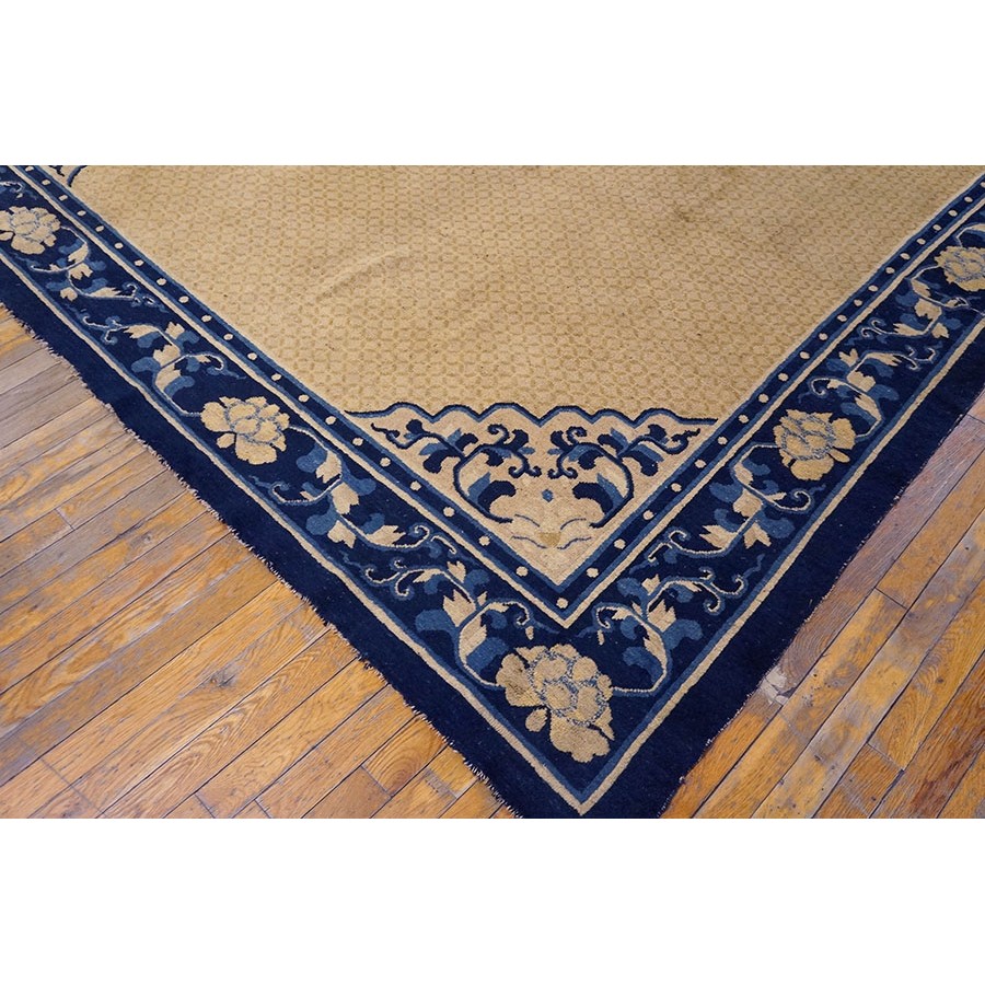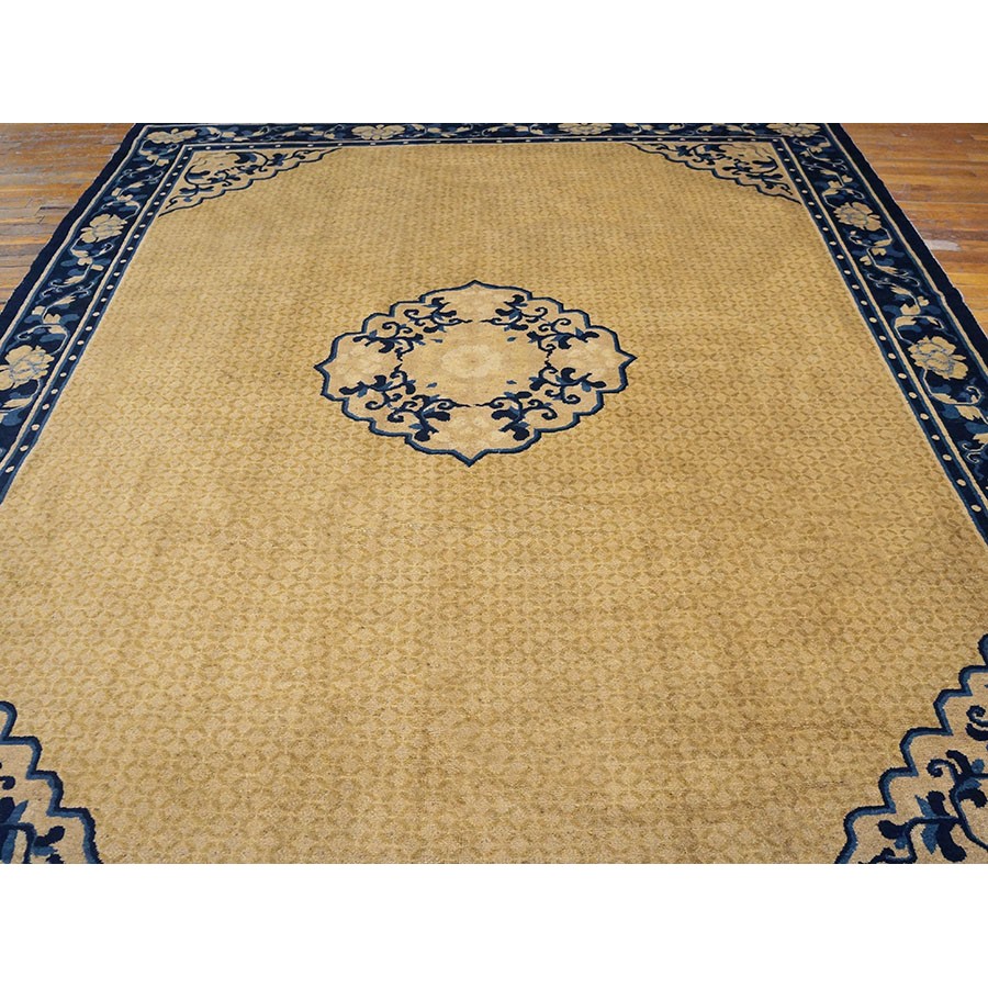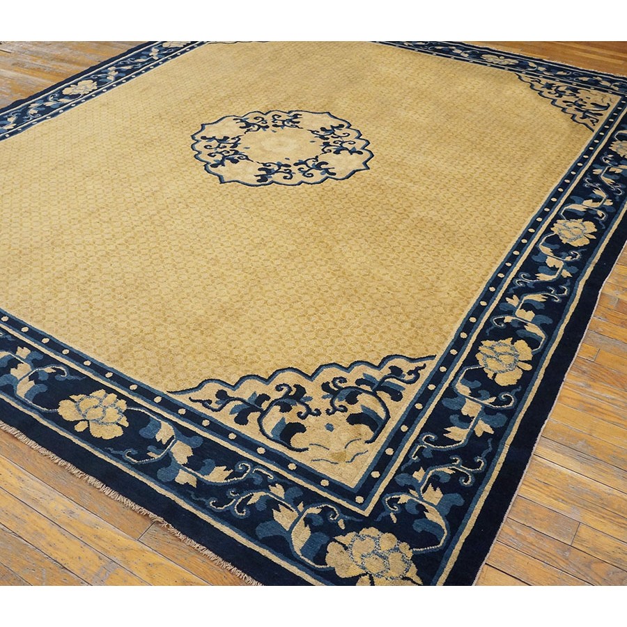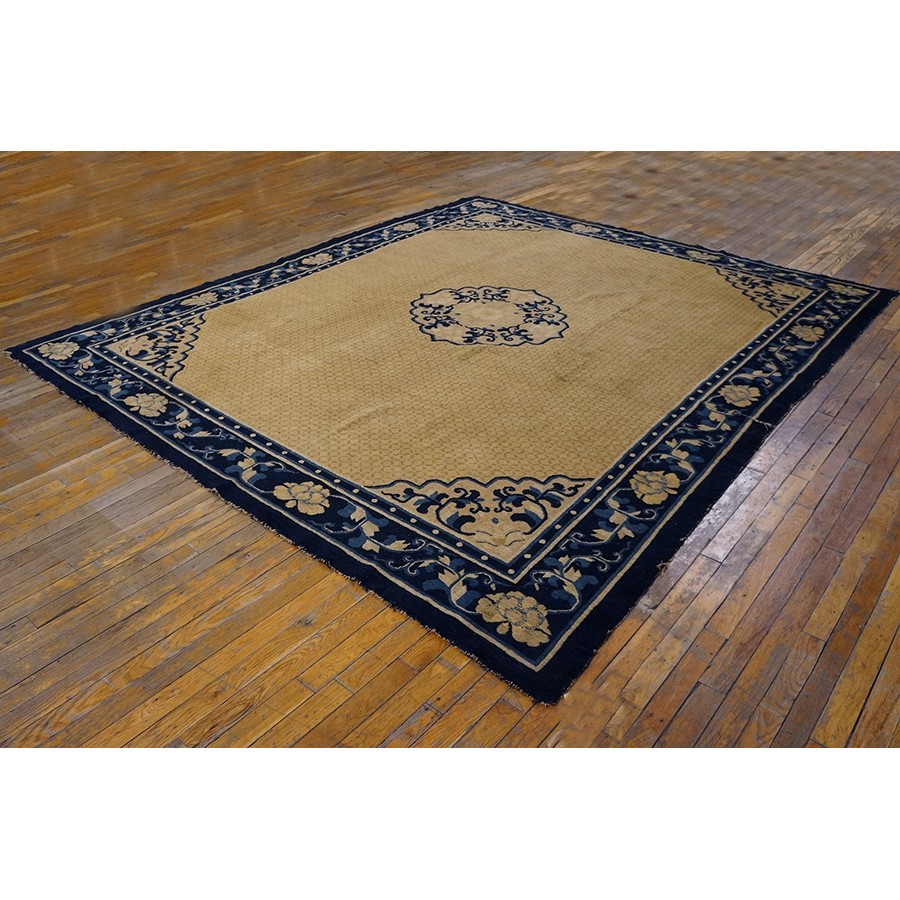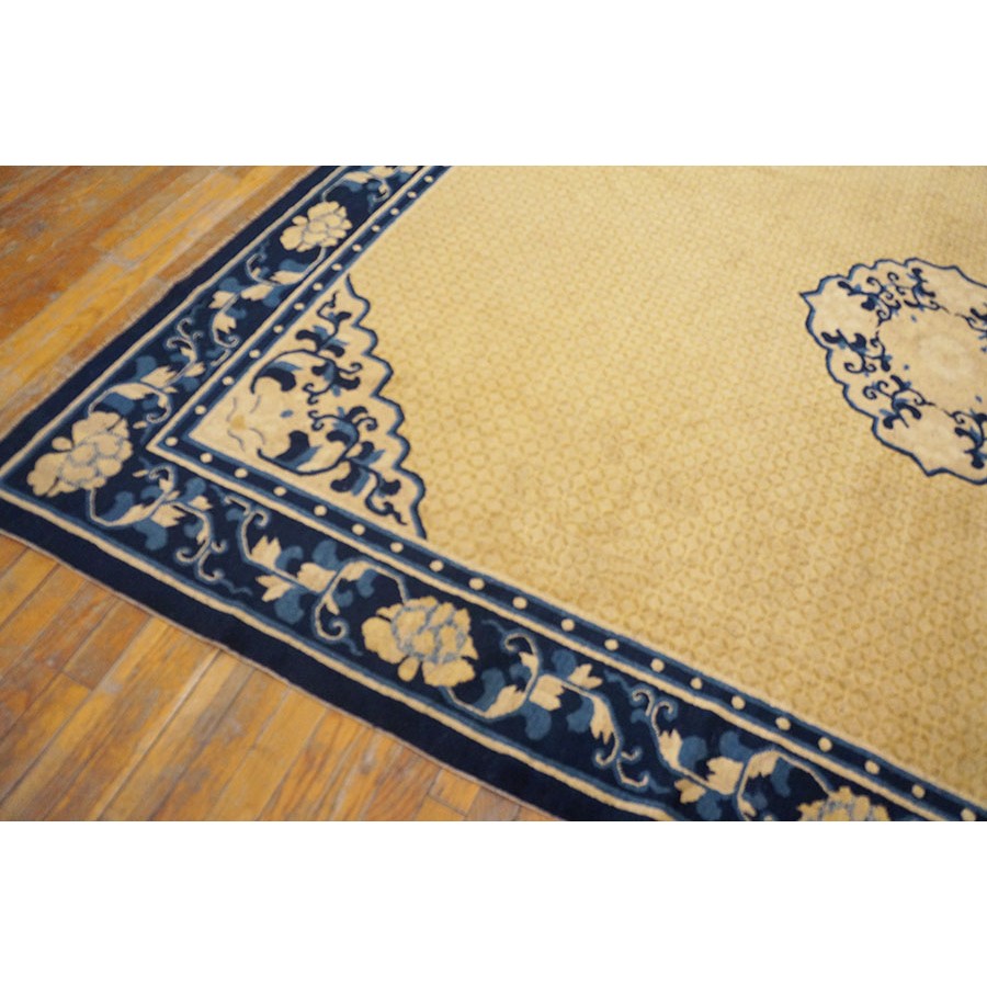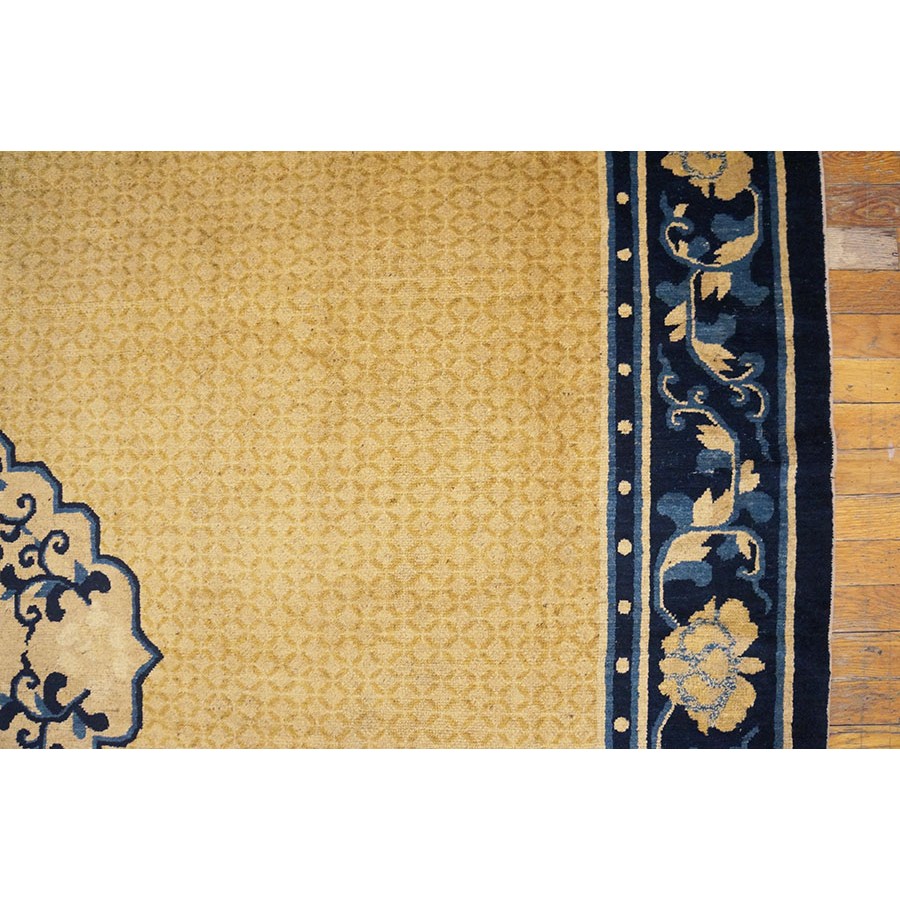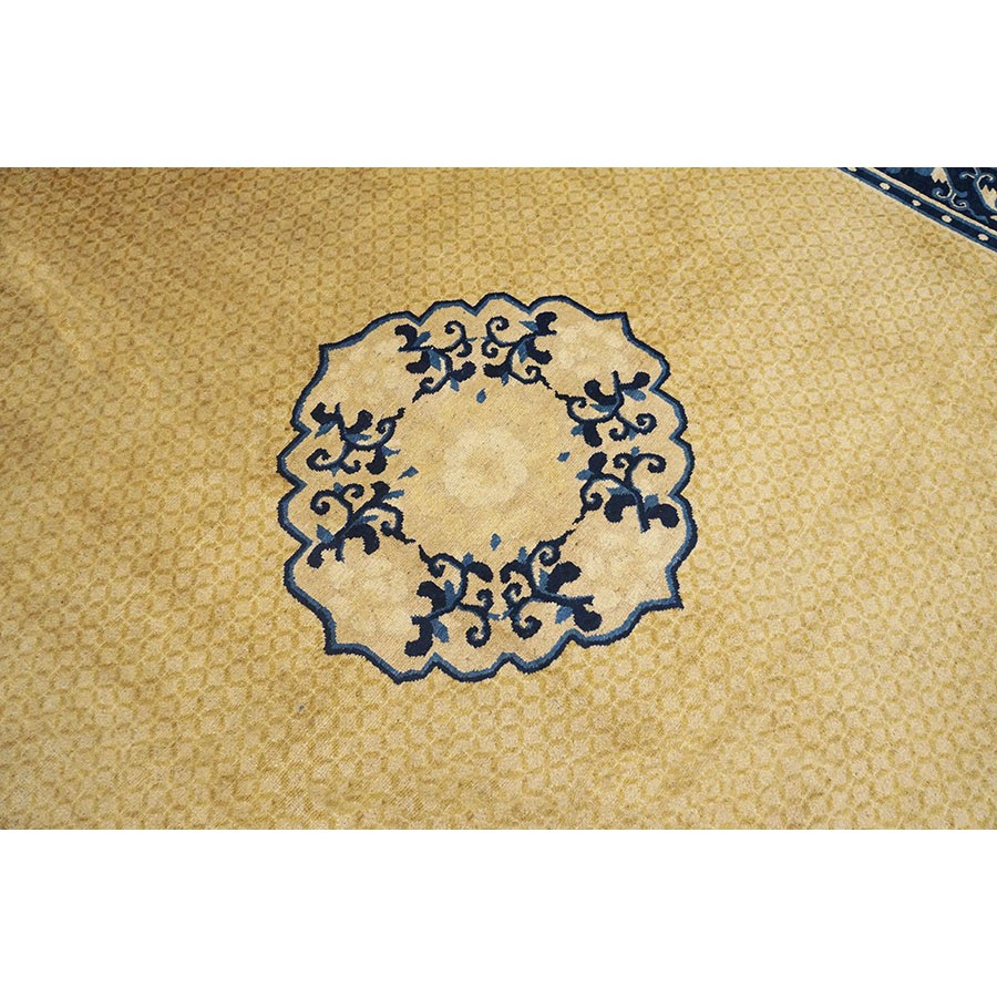 DescriptionChineseCarpets made in China proper. See entries Ningshia, Peking, Art Deco. Chinese - NingxiaThe western Chinese province of Ningshia has a mostly Muslim population and is the source of many of the oldest Chinese carpets of the modern (Ming Dynasty and later) era. The designs are typically Chinese: fretwork or Greek key boarders, pacony palmettes, bats, butterflies, Fu dogs, clouds, dragons, shou symbols, etc. Pollar carpets designed to wrap around monastery columns and displaying a dragon above waves are a specialty. The weave is coarse and soft, with several wefts between knot rows and a longish pile. Yellow golds, dark and light blues are common colors. The outer most plain border on pre 1800 examples is a corrosive brown. Formats include: large square throne carpets, paralleled meditation runners, chair seats and scalloped backs. | |
