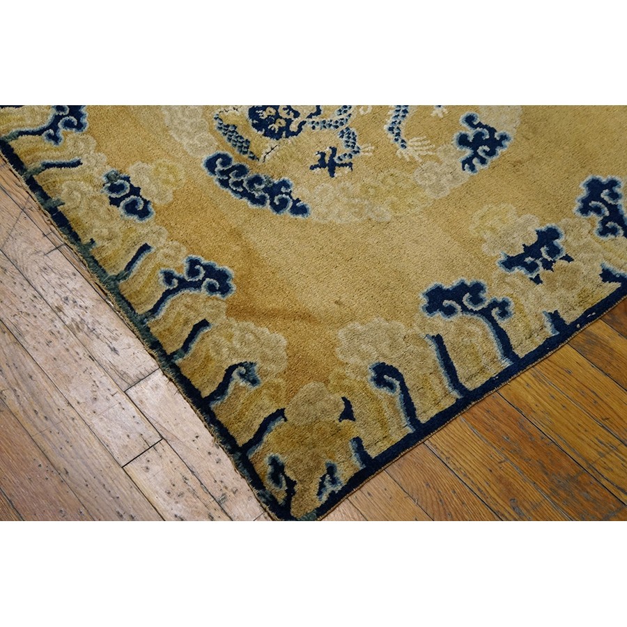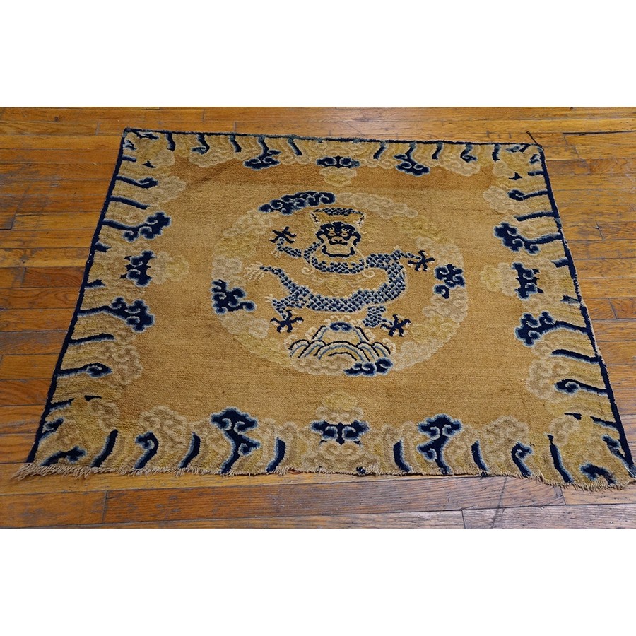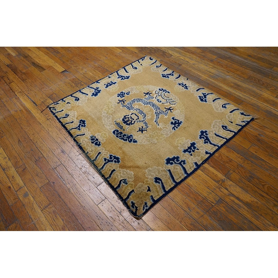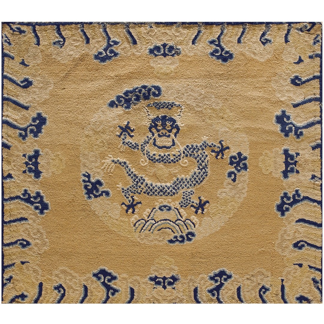 DescriptionChineseCarpets made in China proper. See entries Ningshia, Peking, Art Deco. Chinese - NingxiaThe western Chinese province of Ningshia has a mostly Muslim population and is the source of many of the oldest Chinese carpets of the modern (Ming Dynasty and later) era. The designs are typically Chinese: fretwork or Greek key boarders, pacony palmettes, bats, butterflies, Fu dogs, clouds, dragons, shou symbols, etc. Pollar carpets designed to wrap around monastery columns and displaying a dragon above waves are a specialty. The weave is coarse and soft, with several wefts between knot rows and a longish pile. Yellow golds, dark and light blues are common colors. The outer most plain border on pre 1800 examples is a corrosive brown. Formats include: large square throne carpets, paralleled meditation runners, chair seats and scalloped backs. | |