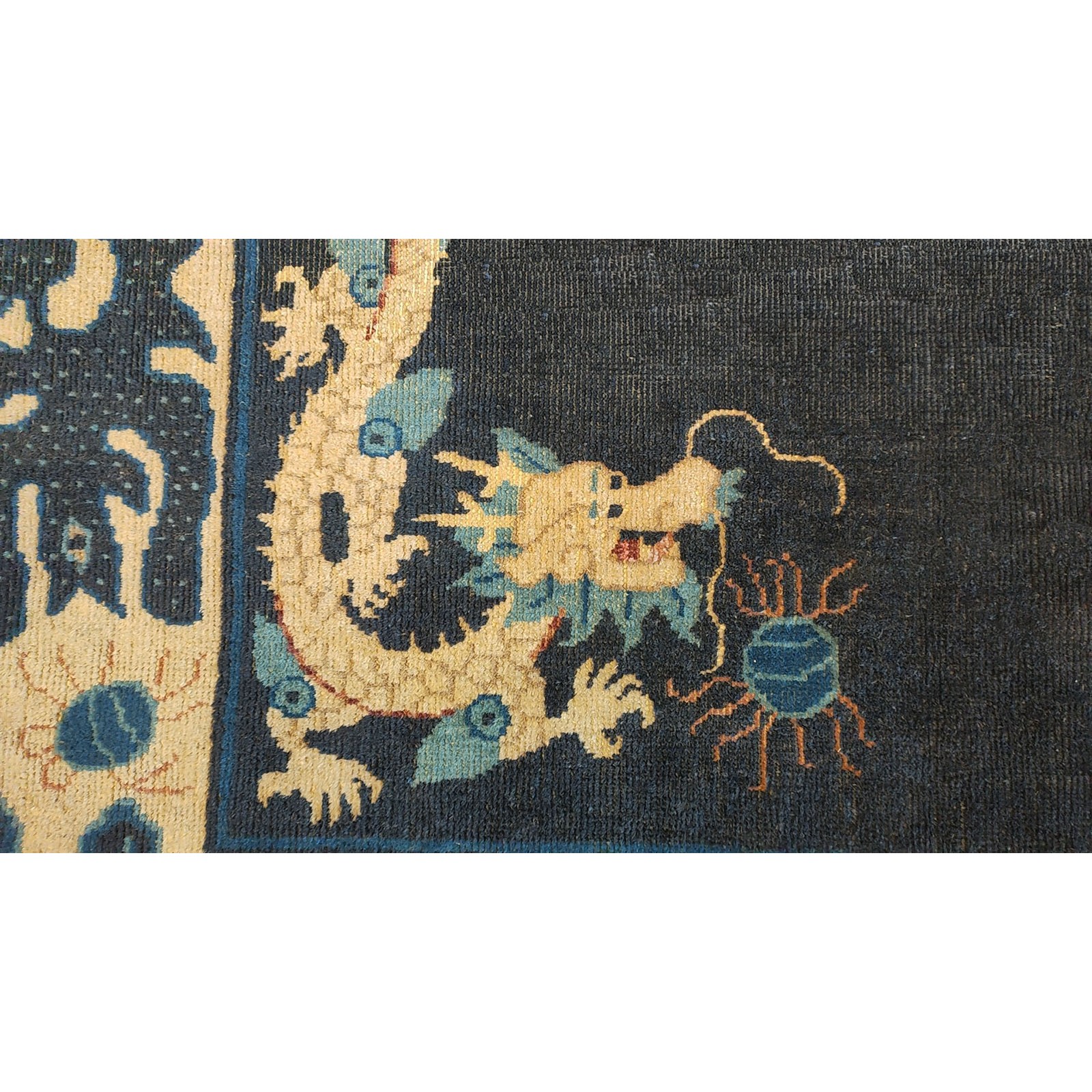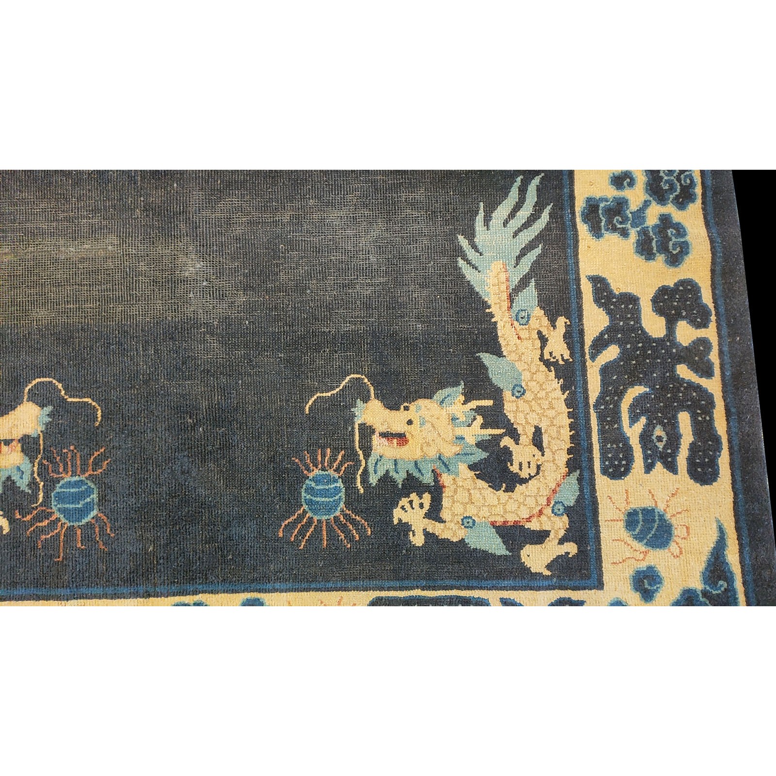 DescriptionChineseCarpets made in China proper. See entries Ningshia, Peking, Art Deco. Chinese - NingxiaThe western Chinese province of Ningshia has a mostly Muslim population and is the source of many of the oldest Chinese carpets of the modern (Ming Dynasty and later) era. The designs are typically Chinese: fretwork or Greek key boarders, pacony palmettes, bats, butterflies, Fu dogs, clouds, dragons, shou symbols, etc. Pollar carpets designed to wrap around monastery columns and displaying a dragon above waves are a specialty. The weave is coarse and soft, with several wefts between knot rows and a longish pile. Yellow golds, dark and light blues are common colors. The outer most plain border on pre 1800 examples is a corrosive brown. Formats include: large square throne carpets, paralleled meditation runners, chair seats and scalloped backs. | |