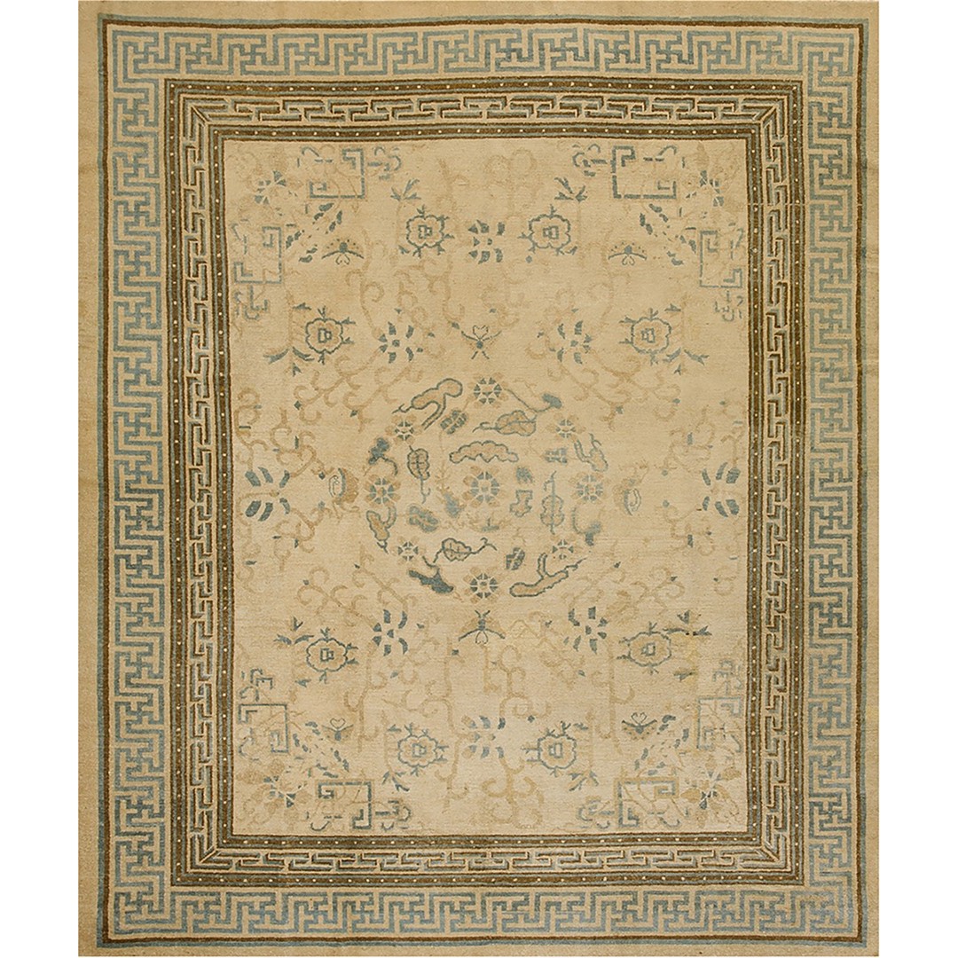 DescriptionChineseCarpets made in China proper. See entries Ningshia, Peking, Art Deco. Chinese - NingxiaThe western Chinese province of Ningshia has a mostly Muslim population and is the source of many of the oldest Chinese carpets of the modern (Ming Dynasty and later) era. The designs are typically Chinese: fretwork or Greek key boarders, pacony palmettes, bats, butterflies, Fu dogs, clouds, dragons, shou symbols, etc. Pollar carpets designed to wrap around monastery columns and displaying a dragon above waves are a specialty. The weave is coarse and soft, with several wefts between knot rows and a longish pile. Yellow golds, dark and light blues are common colors. The outer most plain border on pre 1800 examples is a corrosive brown. Formats include: large square throne carpets, paralleled meditation runners, chair seats and scalloped backs. | |