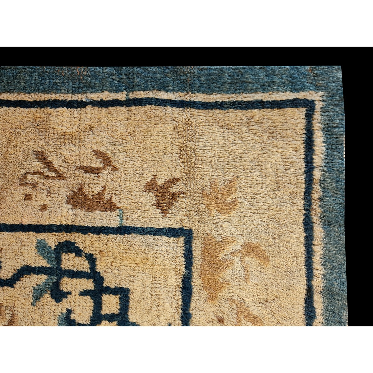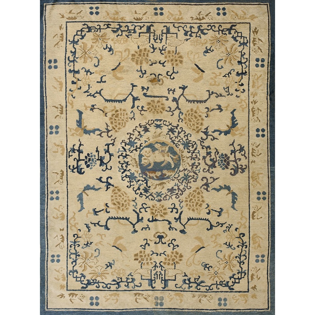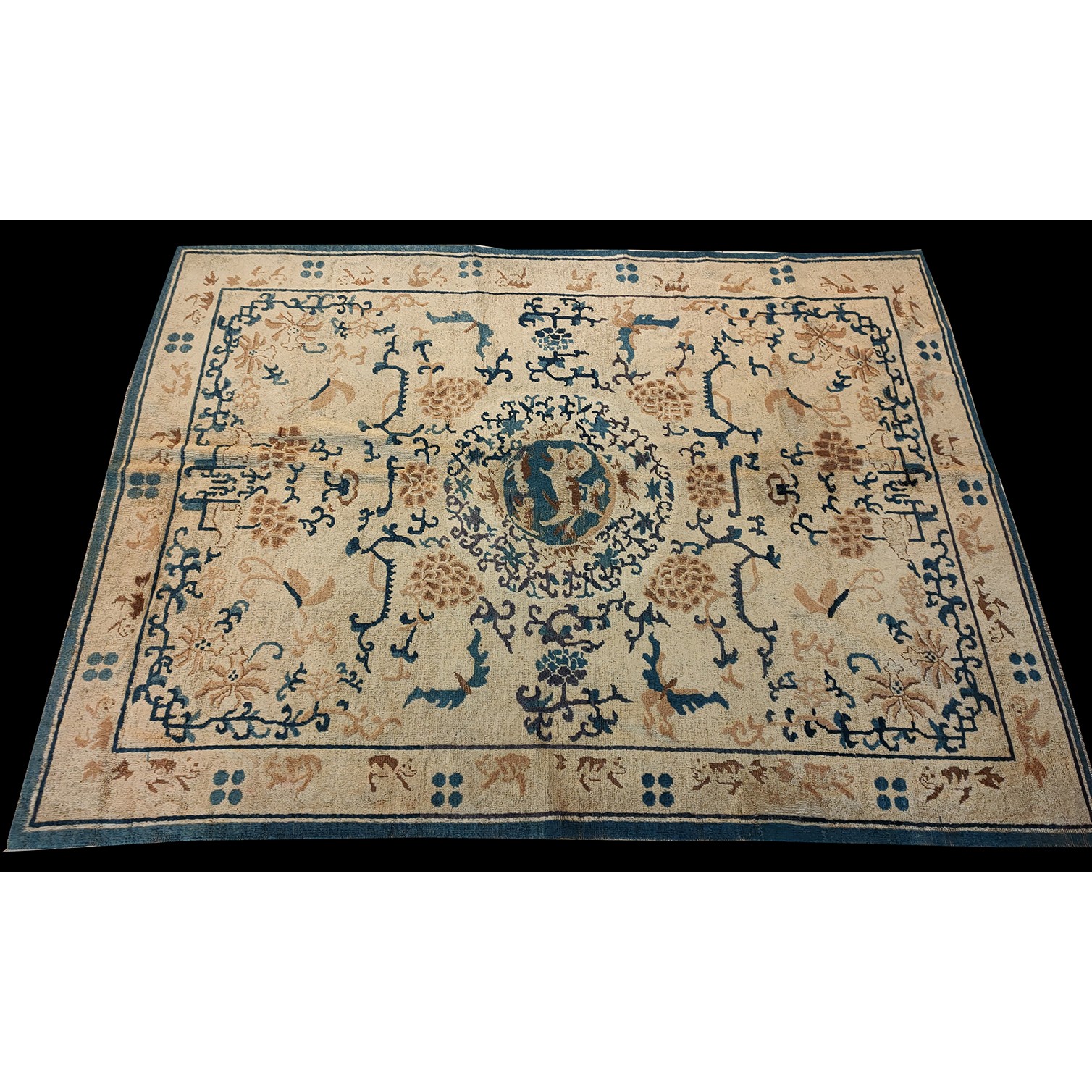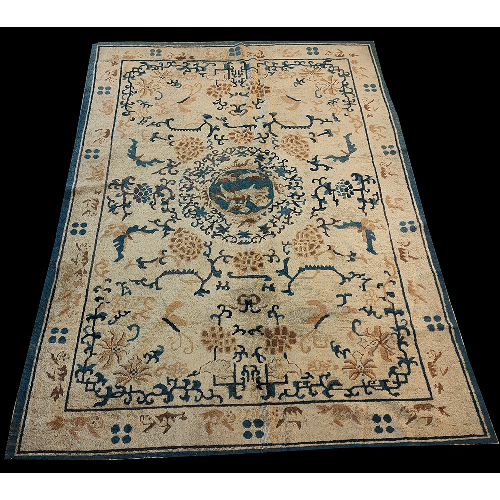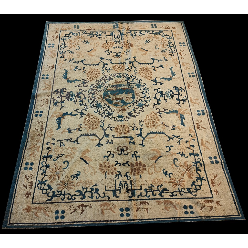 DescriptionChineseCarpets made in China proper. See entries Ningshia, Peking, Art Deco. Chinese - NingxiaThe western Chinese province of Ningshia has a mostly Muslim population and is the source of many of the oldest Chinese carpets of the modern (Ming Dynasty and later) era. The designs are typically Chinese: fretwork or Greek key boarders, pacony palmettes, bats, butterflies, Fu dogs, clouds, dragons, shou symbols, etc. Pollar carpets designed to wrap around monastery columns and displaying a dragon above waves are a specialty. The weave is coarse and soft, with several wefts between knot rows and a longish pile. Yellow golds, dark and light blues are common colors. The outer most plain border on pre 1800 examples is a corrosive brown. Formats include: large square throne carpets, paralleled meditation runners, chair seats and scalloped backs. | |