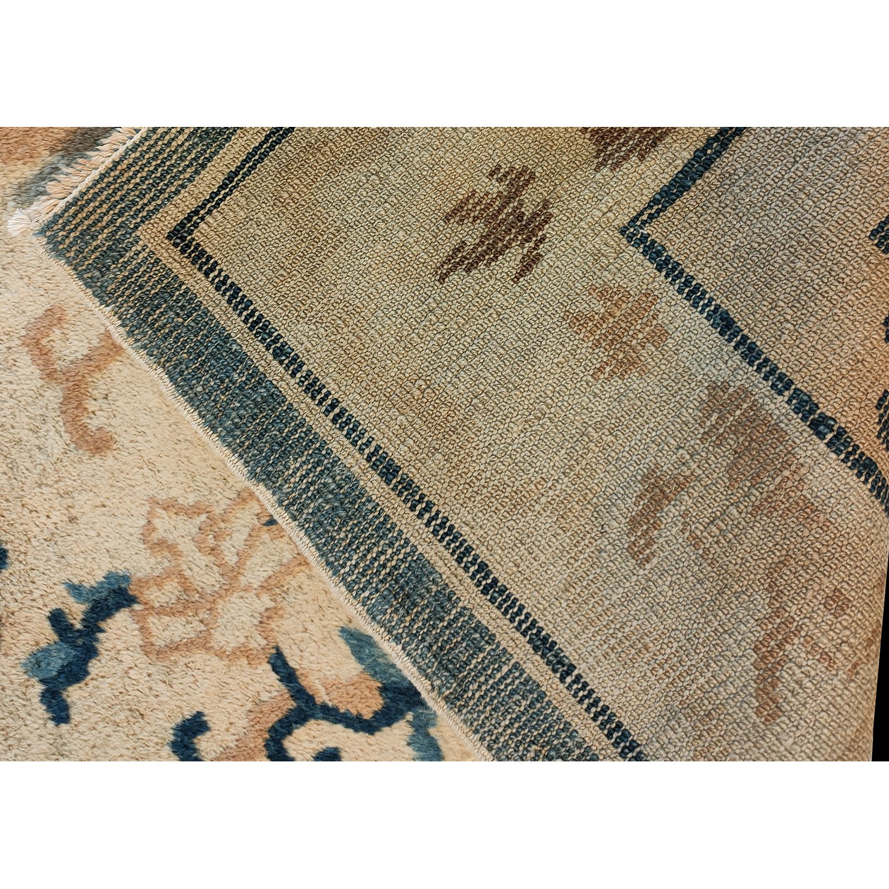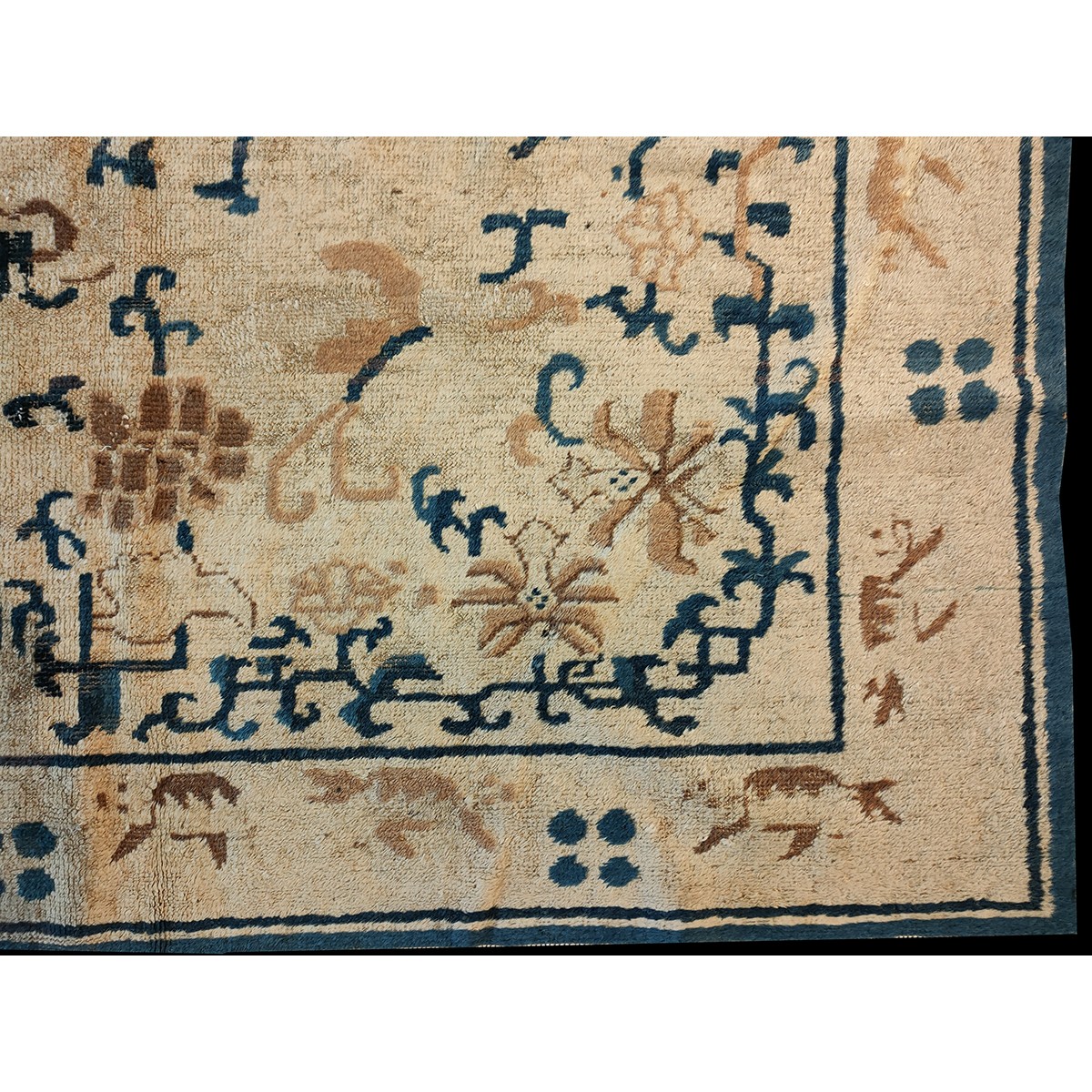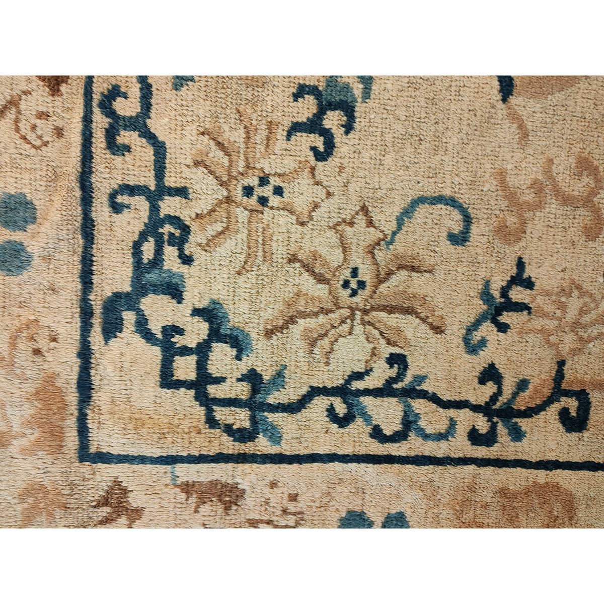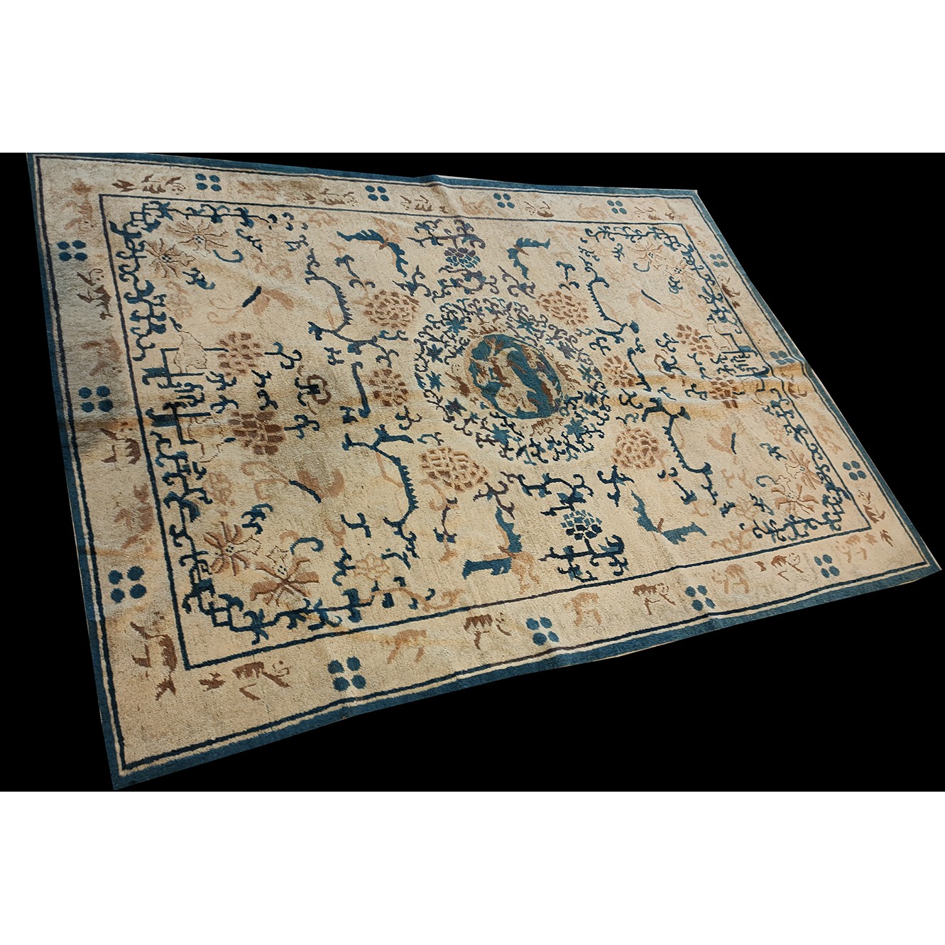 DescriptionChineseCarpets made in China proper. See entries Ningshia, Peking, Art Deco. Chinese - NingxiaThe western Chinese province of Ningshia has a mostly Muslim population and is the source of many of the oldest Chinese carpets of the modern (Ming Dynasty and later) era. The designs are typically Chinese: fretwork or Greek key boarders, pacony palmettes, bats, butterflies, Fu dogs, clouds, dragons, shou symbols, etc. Pollar carpets designed to wrap around monastery columns and displaying a dragon above waves are a specialty. The weave is coarse and soft, with several wefts between knot rows and a longish pile. Yellow golds, dark and light blues are common colors. The outer most plain border on pre 1800 examples is a corrosive brown. Formats include: large square throne carpets, paralleled meditation runners, chair seats and scalloped backs. | |