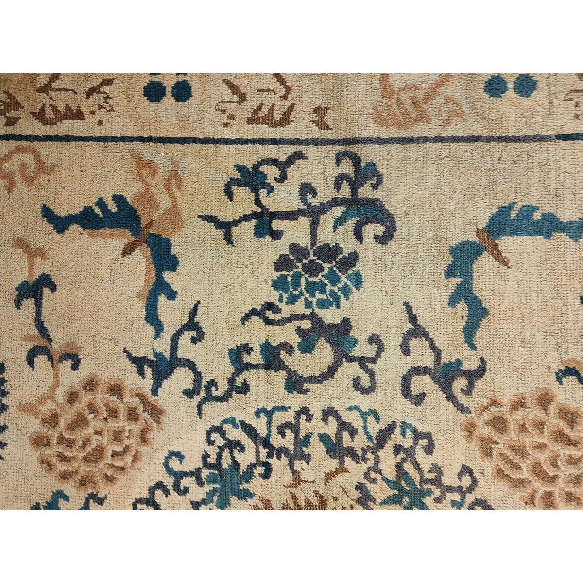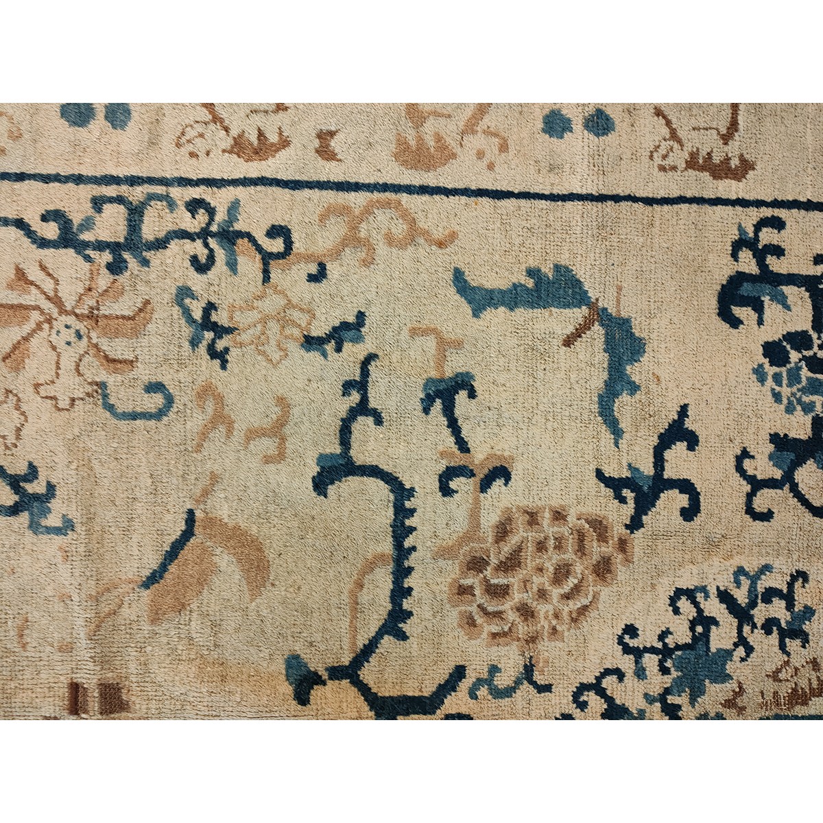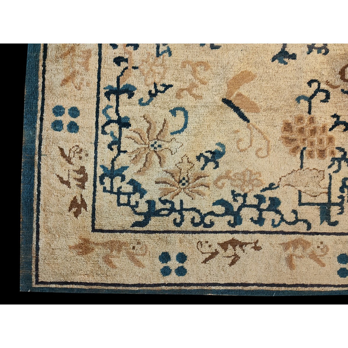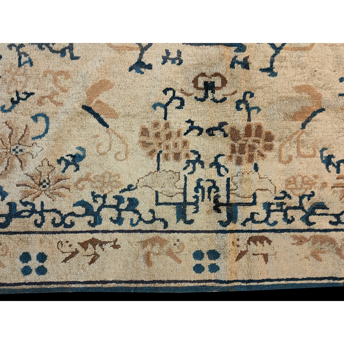 DescriptionChineseCarpets made in China proper. See entries Ningshia, Peking, Art Deco. Chinese - NingxiaThe western Chinese province of Ningshia has a mostly Muslim population and is the source of many of the oldest Chinese carpets of the modern (Ming Dynasty and later) era. The designs are typically Chinese: fretwork or Greek key boarders, pacony palmettes, bats, butterflies, Fu dogs, clouds, dragons, shou symbols, etc. Pollar carpets designed to wrap around monastery columns and displaying a dragon above waves are a specialty. The weave is coarse and soft, with several wefts between knot rows and a longish pile. Yellow golds, dark and light blues are common colors. The outer most plain border on pre 1800 examples is a corrosive brown. Formats include: large square throne carpets, paralleled meditation runners, chair seats and scalloped backs. | |