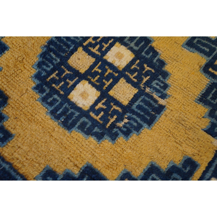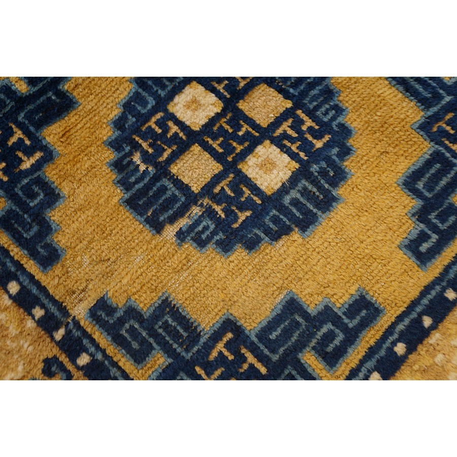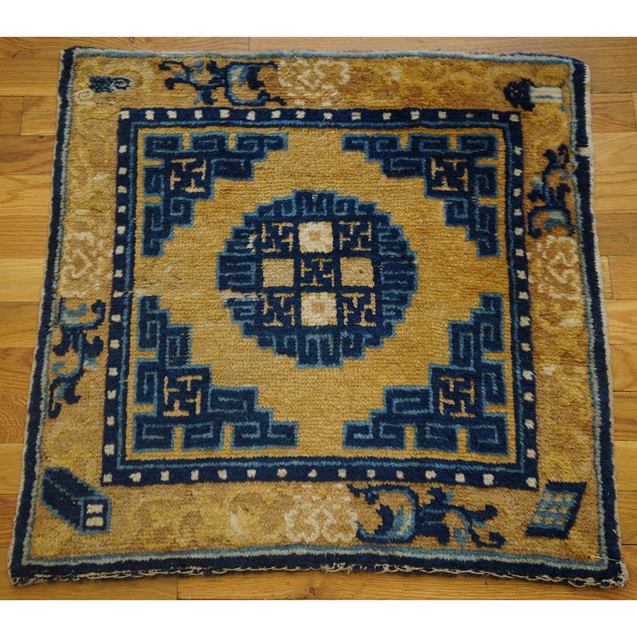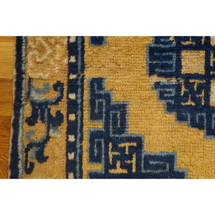 DescriptionChineseCarpets made in China proper. See entries Ningshia, Peking, Art Deco. Chinese - NingxiaThe western Chinese province of Ningshia has a mostly Muslim population and is the source of many of the oldest Chinese carpets of the modern (Ming Dynasty and later) era. The designs are typically Chinese: fretwork or Greek key boarders, pacony palmettes, bats, butterflies, Fu dogs, clouds, dragons, shou symbols, etc. Pollar carpets designed to wrap around monastery columns and displaying a dragon above waves are a specialty. The weave is coarse and soft, with several wefts between knot rows and a longish pile. Yellow golds, dark and light blues are common colors. The outer most plain border on pre 1800 examples is a corrosive brown. Formats include: large square throne carpets, paralleled meditation runners, chair seats and scalloped backs. | |
