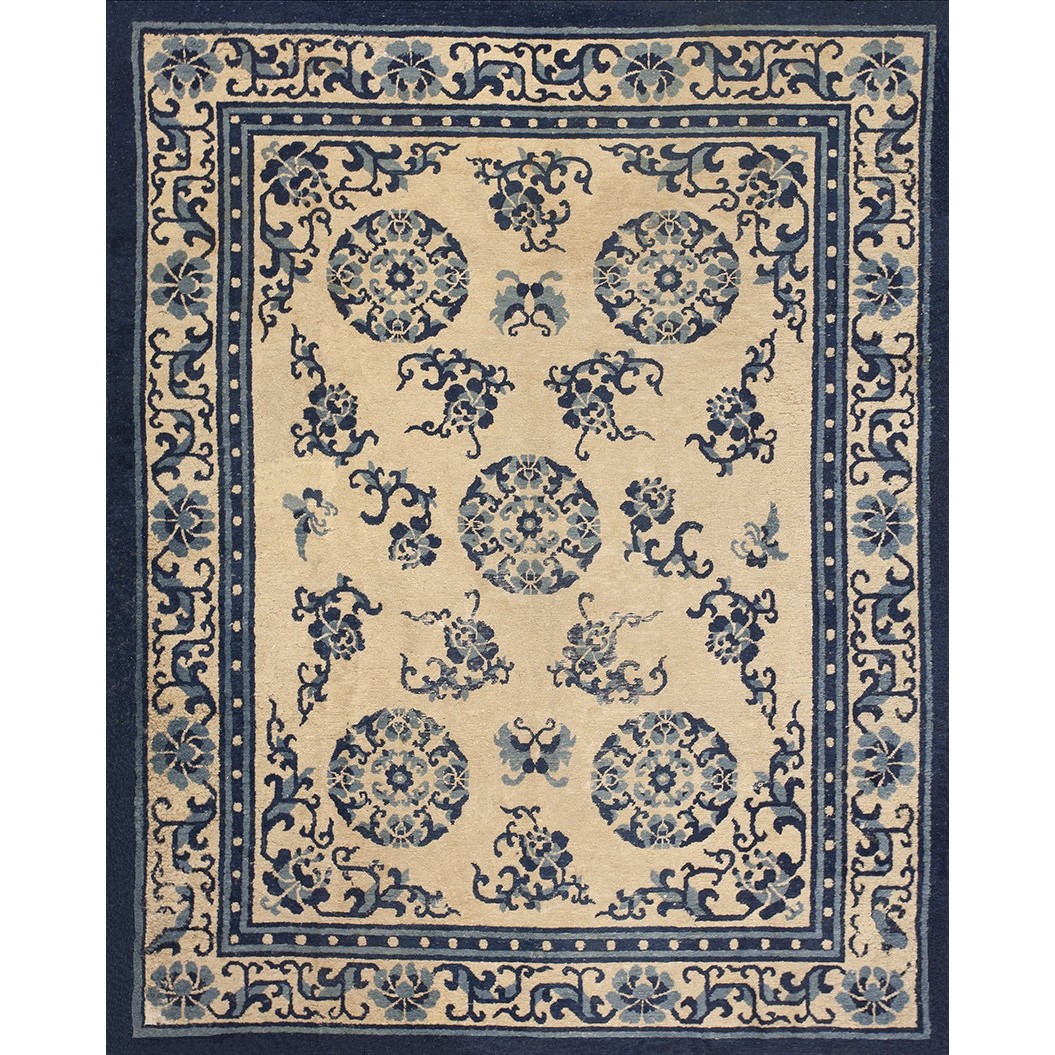DescriptionChineseCarpets made in China proper. See entries Ningshia, Peking, Art Deco. Chinese - NingxiaThe western Chinese province of Ningshia has a mostly Muslim population and is the source of many of the oldest Chinese carpets of the modern (Ming Dynasty and later) era. The designs are typically Chinese: fretwork or Greek key boarders, pacony palmettes, bats, butterflies, Fu dogs, clouds, dragons, shou symbols, etc. Pollar carpets designed to wrap around monastery columns and displaying a dragon above waves are a specialty. The weave is coarse and soft, with several wefts between knot rows and a longish pile. Yellow golds, dark and light blues are common colors. The outer most plain border on pre 1800 examples is a corrosive brown. Formats include: large square throne carpets, paralleled meditation runners, chair seats and scalloped backs. | |