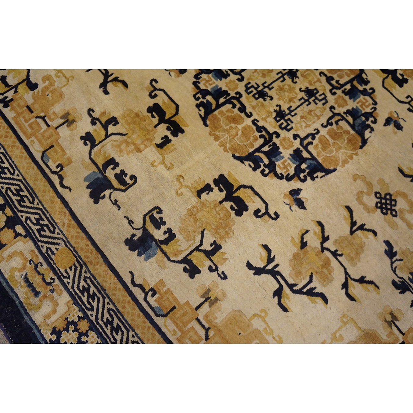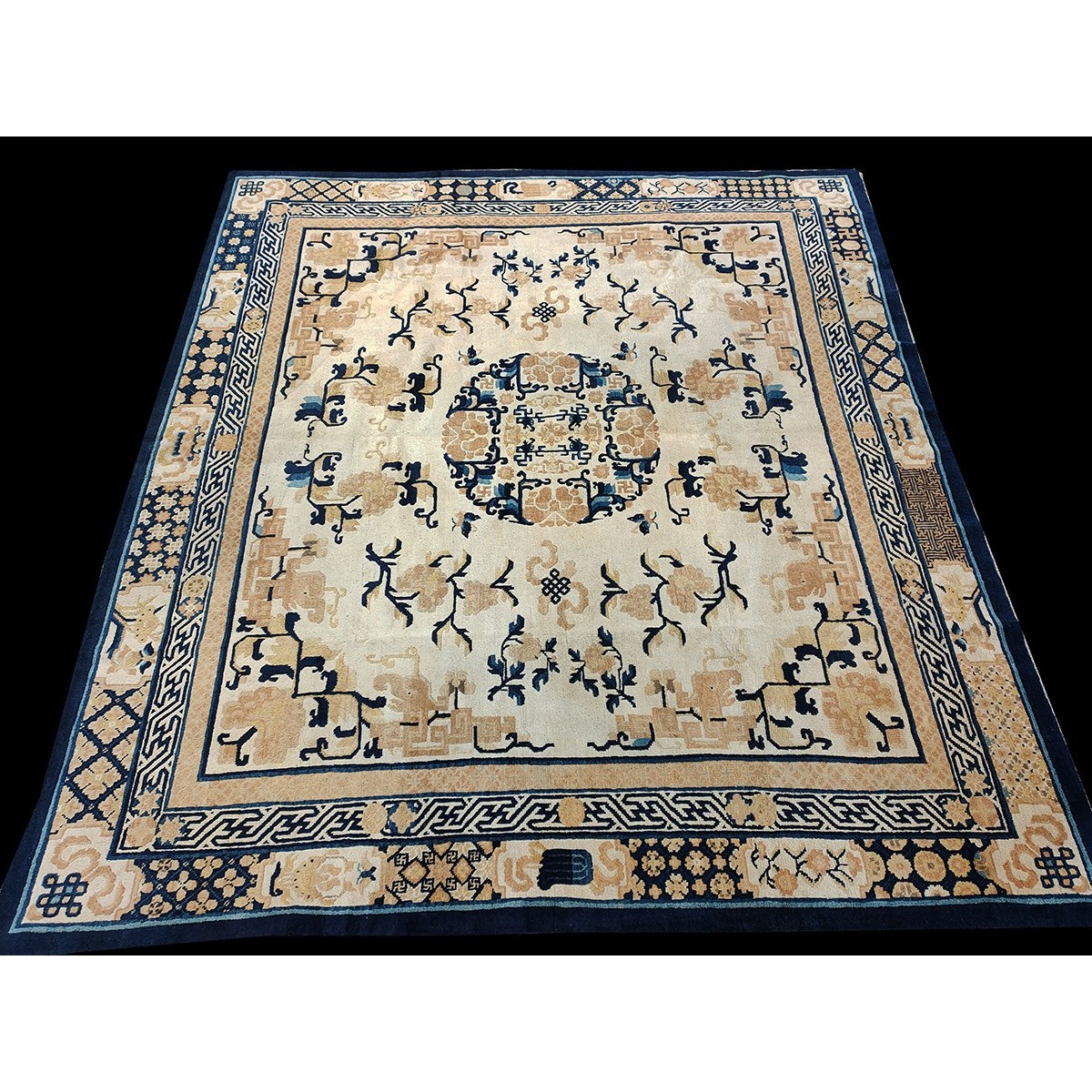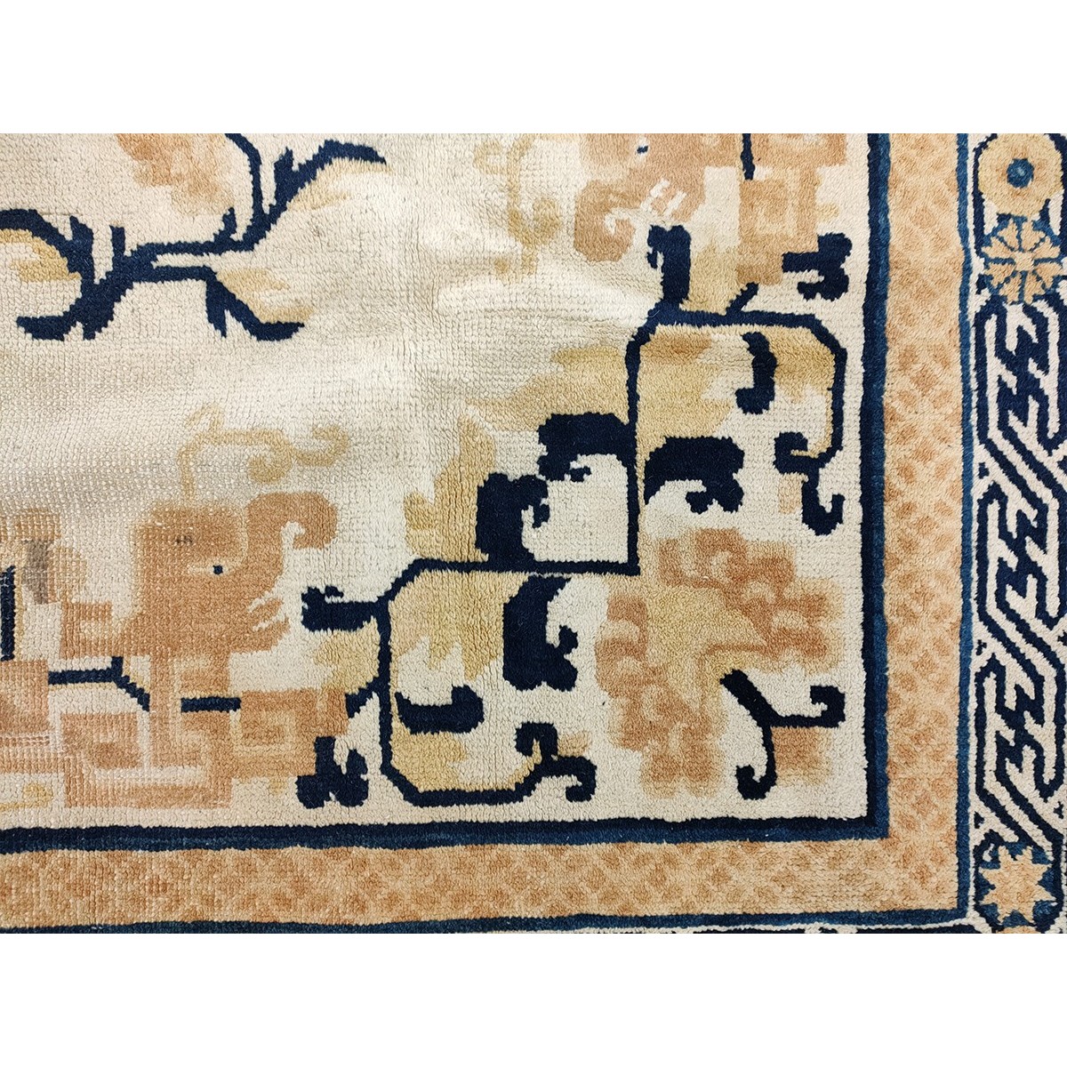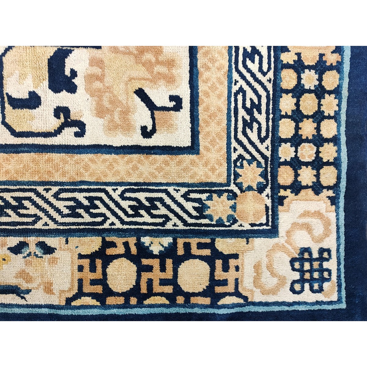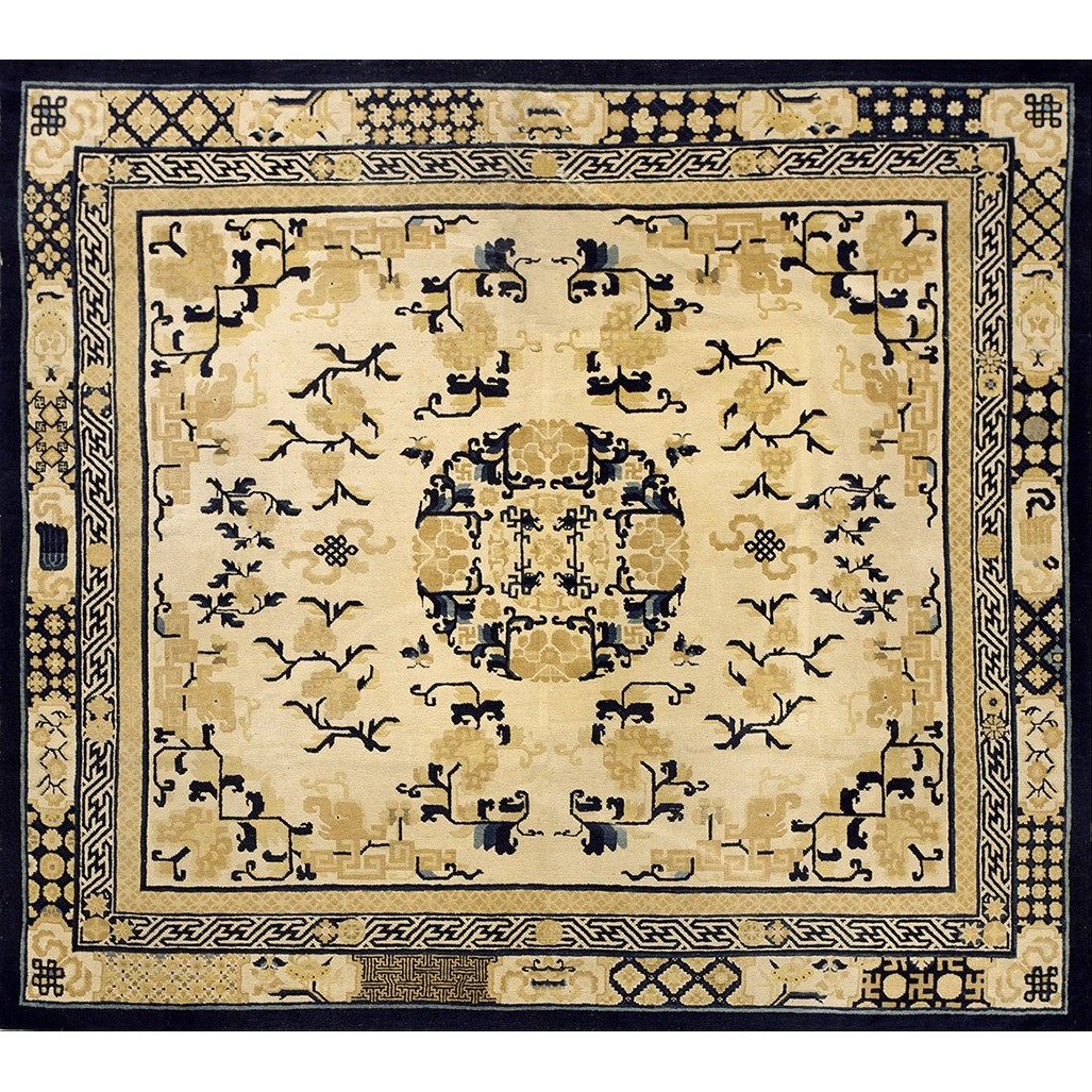 DescriptionChineseCarpets made in China proper. See entries Ningshia, Peking, Art Deco. Chinese - NingxiaThe western Chinese province of Ningshia has a mostly Muslim population and is the source of many of the oldest Chinese carpets of the modern (Ming Dynasty and later) era. The designs are typically Chinese: fretwork or Greek key boarders, pacony palmettes, bats, butterflies, Fu dogs, clouds, dragons, shou symbols, etc. Pollar carpets designed to wrap around monastery columns and displaying a dragon above waves are a specialty. The weave is coarse and soft, with several wefts between knot rows and a longish pile. Yellow golds, dark and light blues are common colors. The outer most plain border on pre 1800 examples is a corrosive brown. Formats include: large square throne carpets, paralleled meditation runners, chair seats and scalloped backs. | |