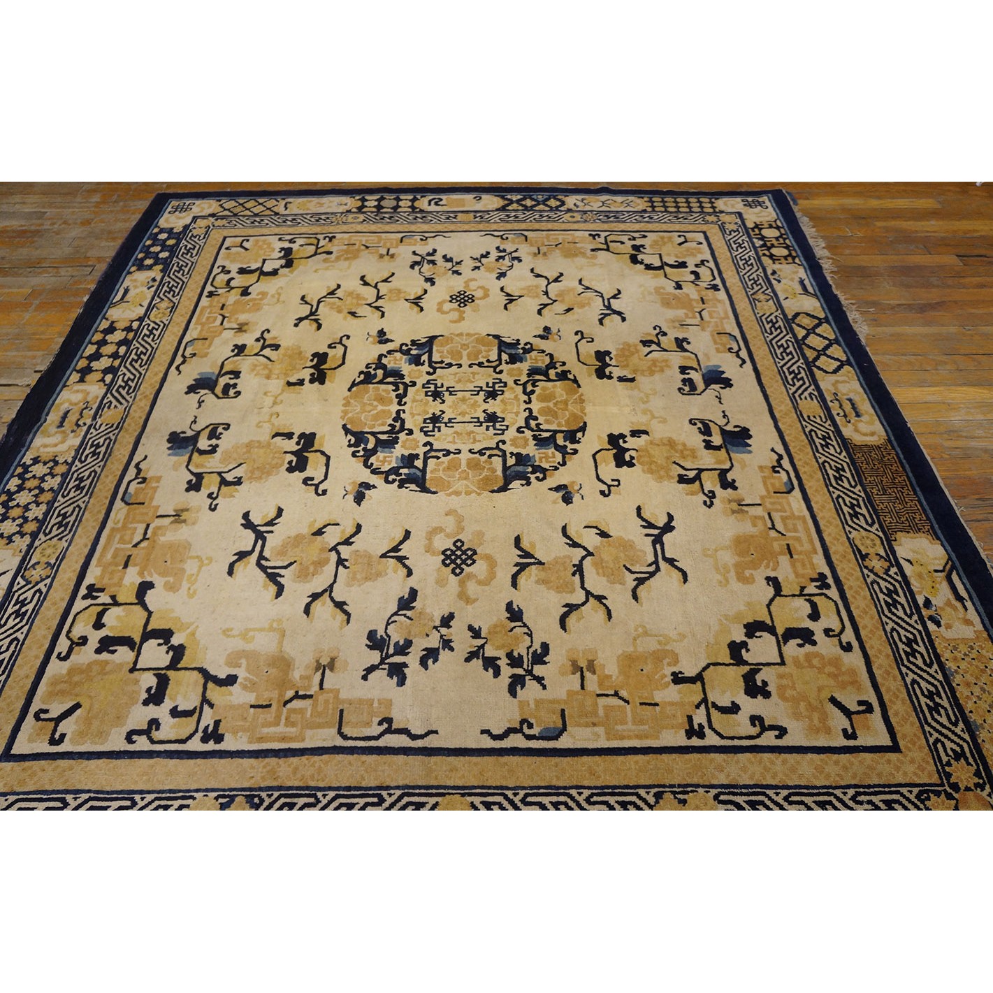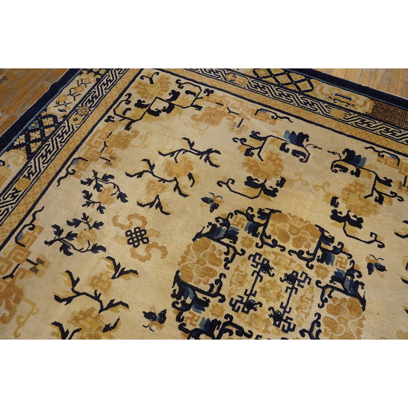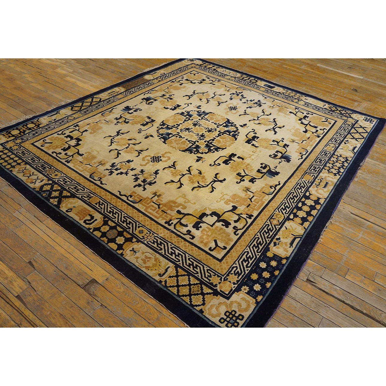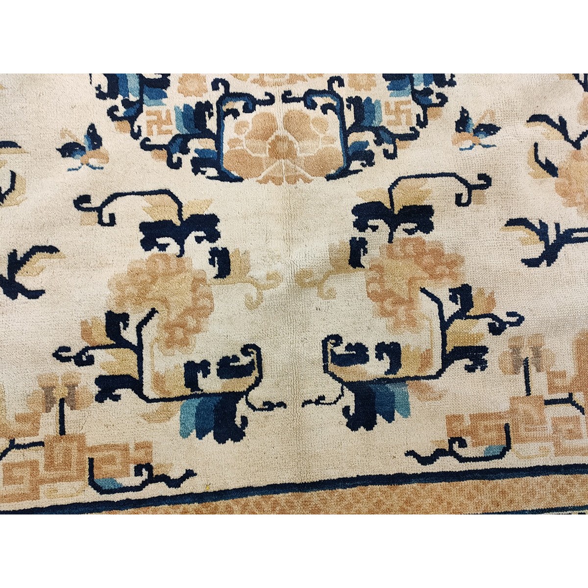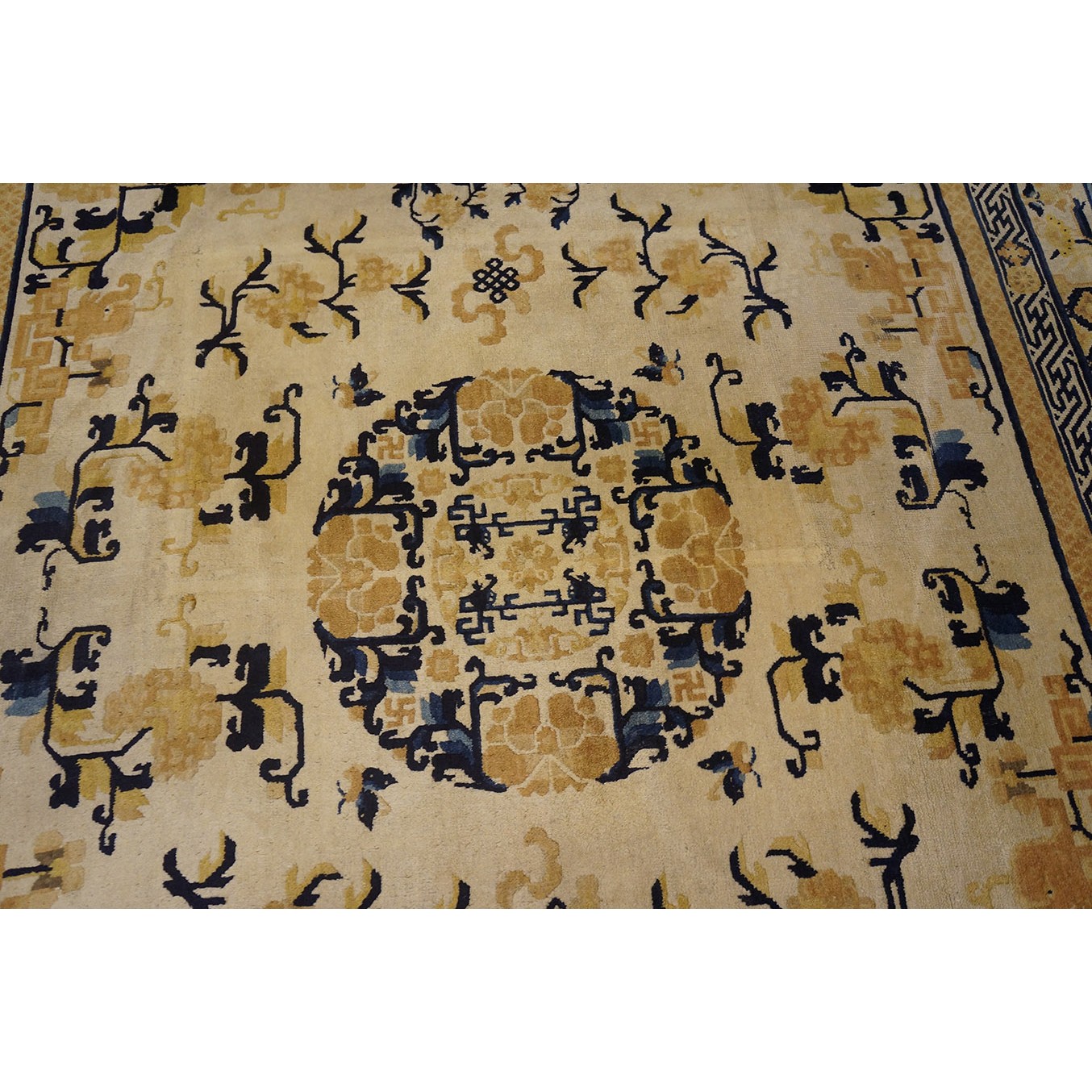 DescriptionChineseCarpets made in China proper. See entries Ningshia, Peking, Art Deco. Chinese - NingxiaThe western Chinese province of Ningshia has a mostly Muslim population and is the source of many of the oldest Chinese carpets of the modern (Ming Dynasty and later) era. The designs are typically Chinese: fretwork or Greek key boarders, pacony palmettes, bats, butterflies, Fu dogs, clouds, dragons, shou symbols, etc. Pollar carpets designed to wrap around monastery columns and displaying a dragon above waves are a specialty. The weave is coarse and soft, with several wefts between knot rows and a longish pile. Yellow golds, dark and light blues are common colors. The outer most plain border on pre 1800 examples is a corrosive brown. Formats include: large square throne carpets, paralleled meditation runners, chair seats and scalloped backs. | |