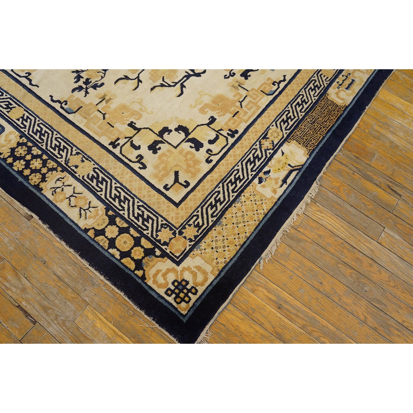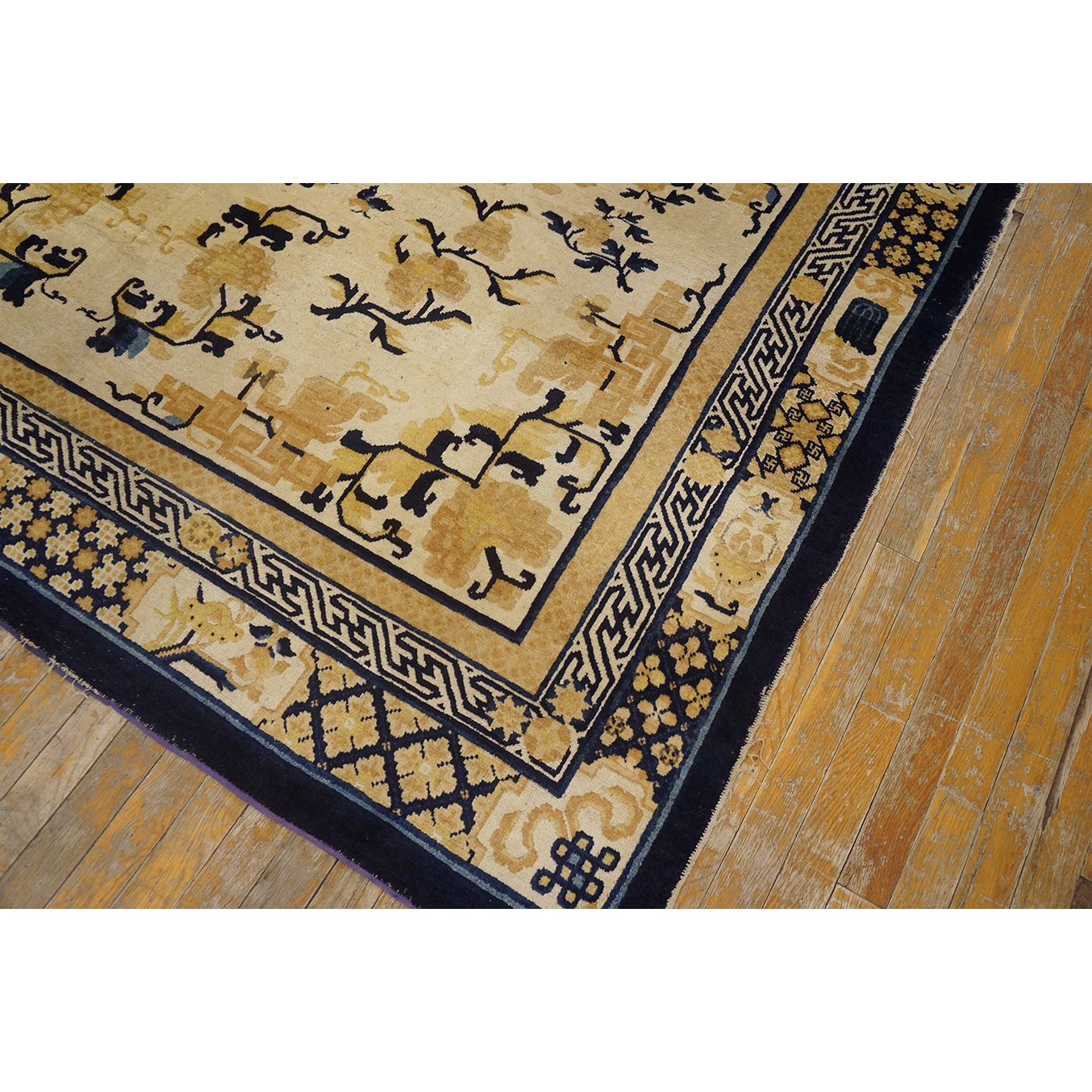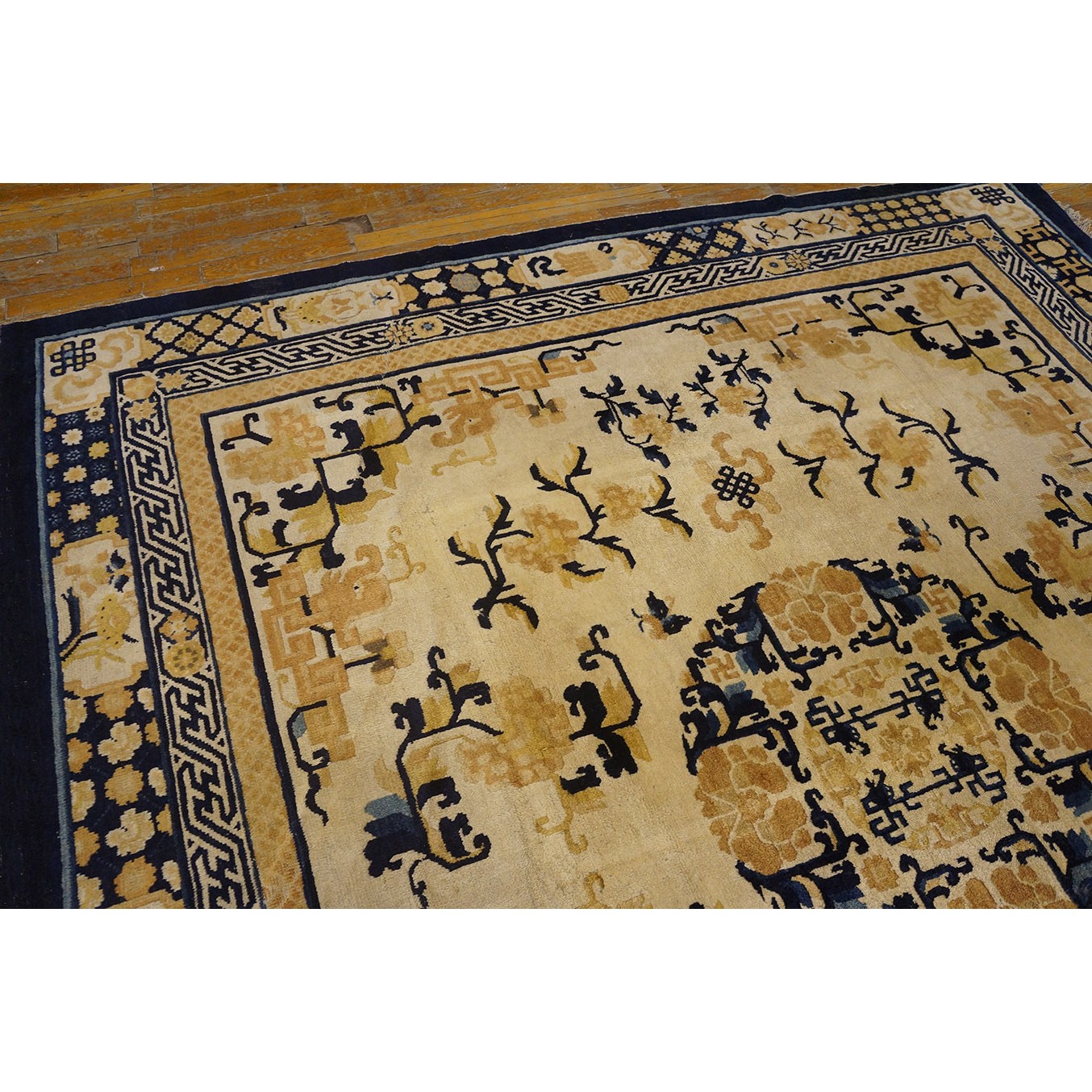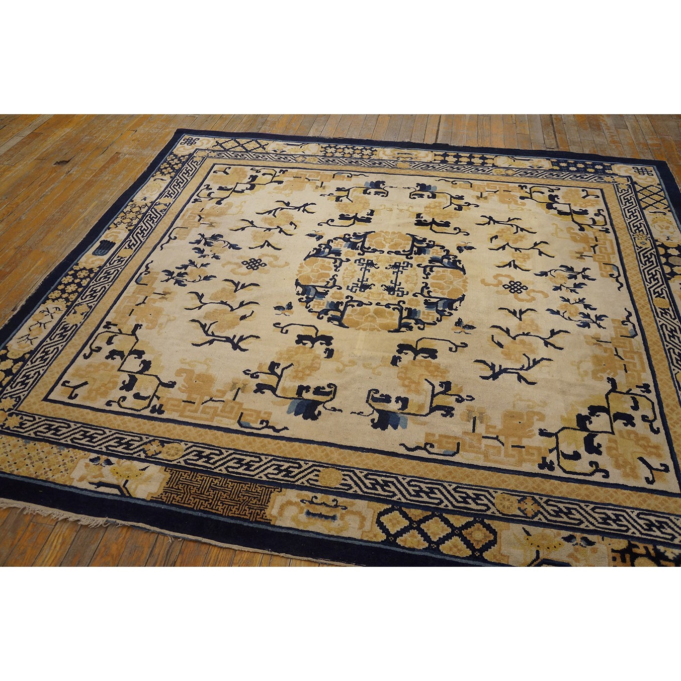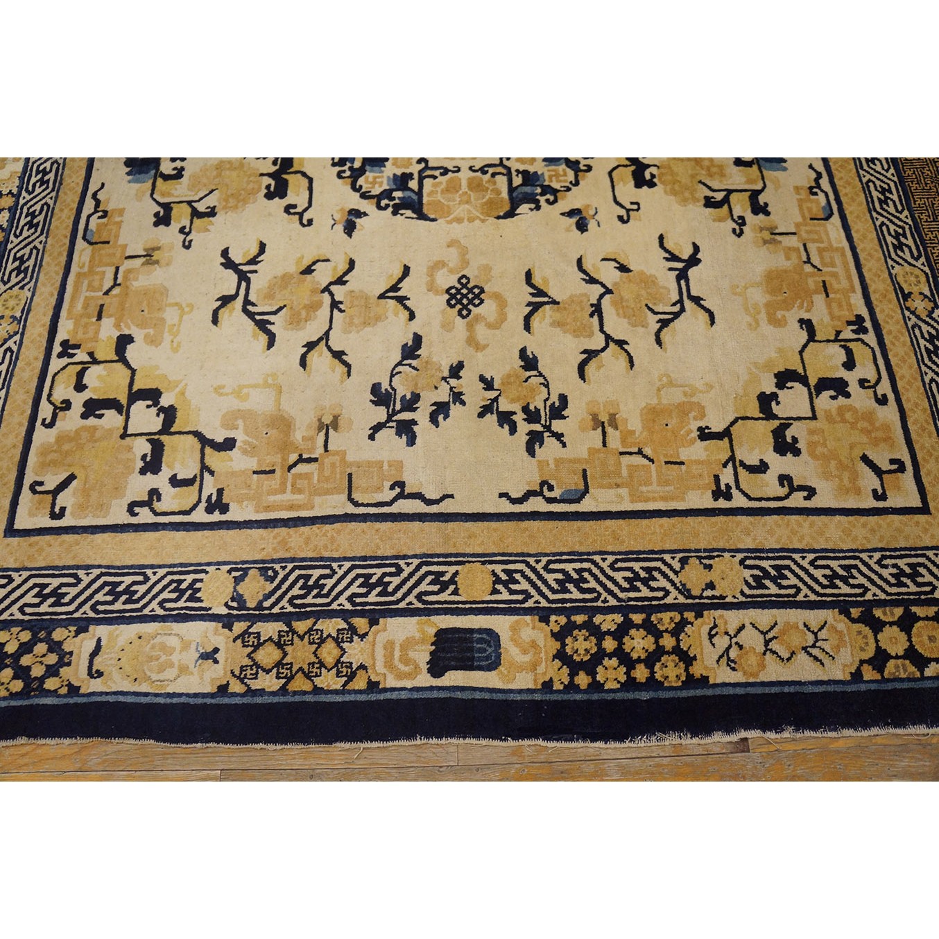 DescriptionChineseCarpets made in China proper. See entries Ningshia, Peking, Art Deco. Chinese - NingxiaThe western Chinese province of Ningshia has a mostly Muslim population and is the source of many of the oldest Chinese carpets of the modern (Ming Dynasty and later) era. The designs are typically Chinese: fretwork or Greek key boarders, pacony palmettes, bats, butterflies, Fu dogs, clouds, dragons, shou symbols, etc. Pollar carpets designed to wrap around monastery columns and displaying a dragon above waves are a specialty. The weave is coarse and soft, with several wefts between knot rows and a longish pile. Yellow golds, dark and light blues are common colors. The outer most plain border on pre 1800 examples is a corrosive brown. Formats include: large square throne carpets, paralleled meditation runners, chair seats and scalloped backs. | |