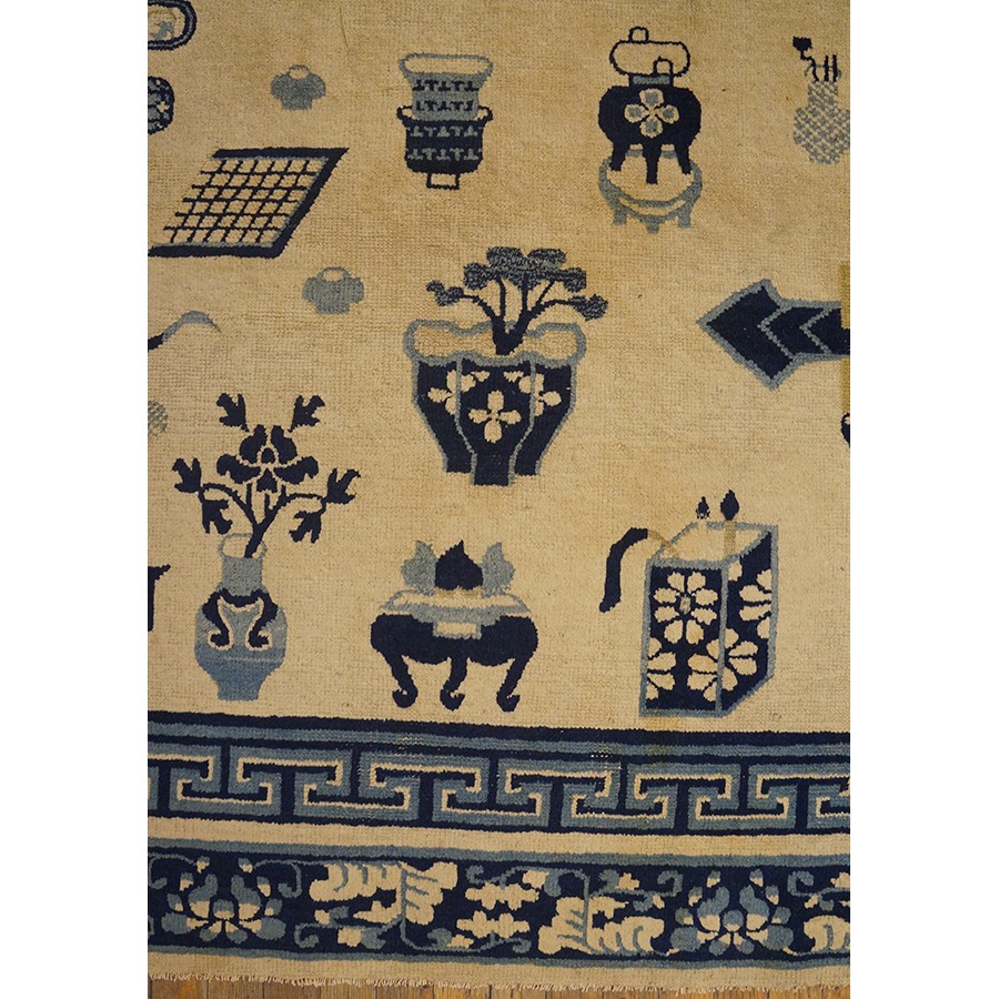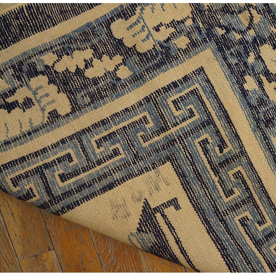 DescriptionChineseCarpets made in China proper. See entries Ningshia, Peking, Art Deco. Chinese - NingxiaThe western Chinese province of Ningshia has a mostly Muslim population and is the source of many of the oldest Chinese carpets of the modern (Ming Dynasty and later) era. The designs are typically Chinese: fretwork or Greek key boarders, pacony palmettes, bats, butterflies, Fu dogs, clouds, dragons, shou symbols, etc. Pollar carpets designed to wrap around monastery columns and displaying a dragon above waves are a specialty. The weave is coarse and soft, with several wefts between knot rows and a longish pile. Yellow golds, dark and light blues are common colors. The outer most plain border on pre 1800 examples is a corrosive brown. Formats include: large square throne carpets, paralleled meditation runners, chair seats and scalloped backs. | |