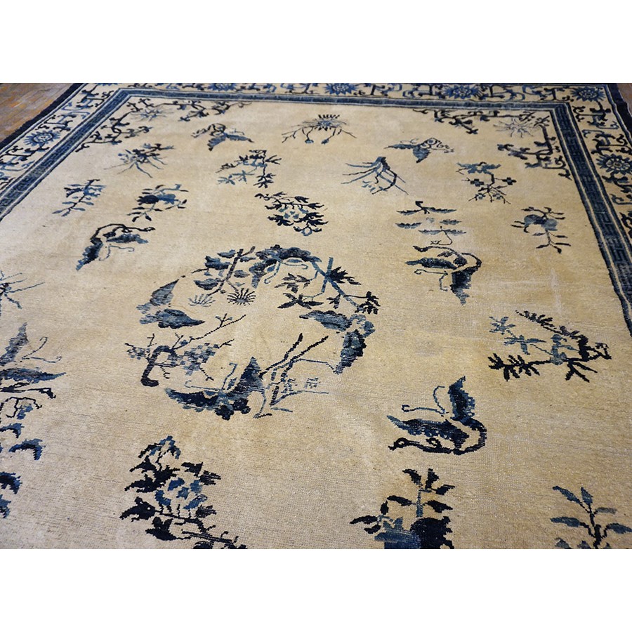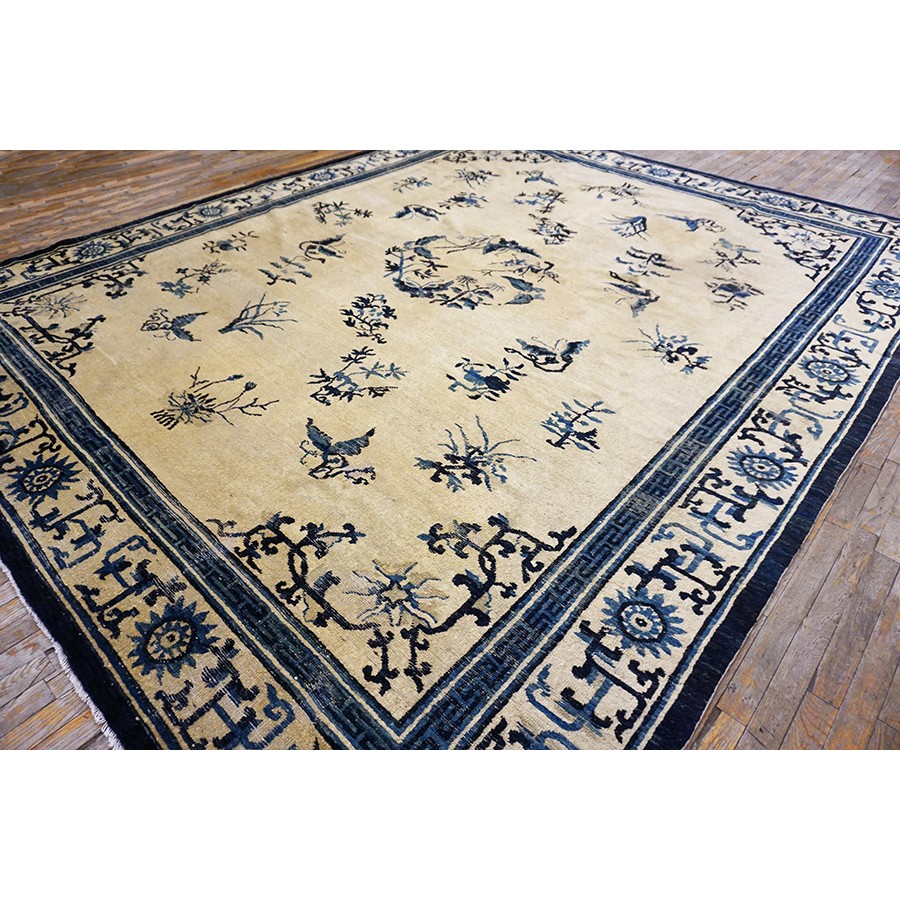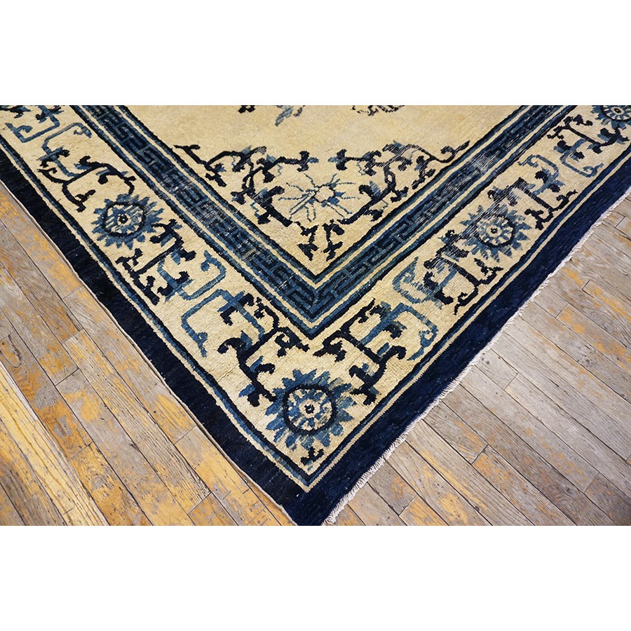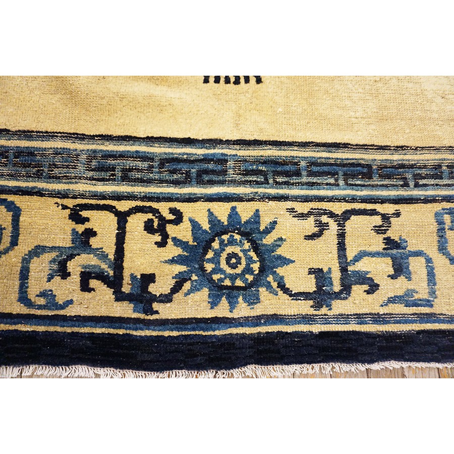 DescriptionChineseCarpets made in China proper. See entries Ningshia, Peking, Art Deco. Chinese - NingxiaThe western Chinese province of Ningshia has a mostly Muslim population and is the source of many of the oldest Chinese carpets of the modern (Ming Dynasty and later) era. The designs are typically Chinese: fretwork or Greek key boarders, pacony palmettes, bats, butterflies, Fu dogs, clouds, dragons, shou symbols, etc. Pollar carpets designed to wrap around monastery columns and displaying a dragon above waves are a specialty. The weave is coarse and soft, with several wefts between knot rows and a longish pile. Yellow golds, dark and light blues are common colors. The outer most plain border on pre 1800 examples is a corrosive brown. Formats include: large square throne carpets, paralleled meditation runners, chair seats and scalloped backs. | |