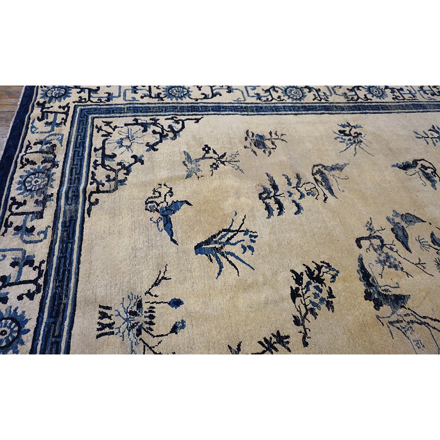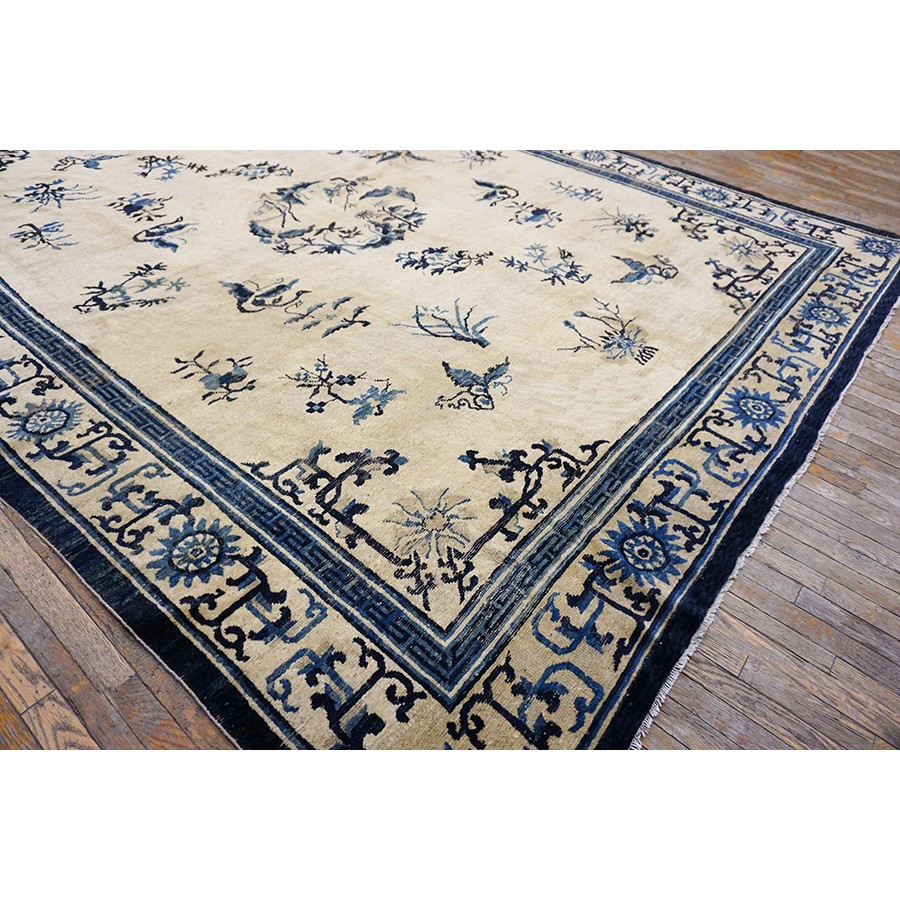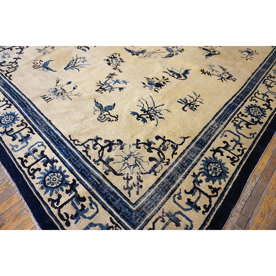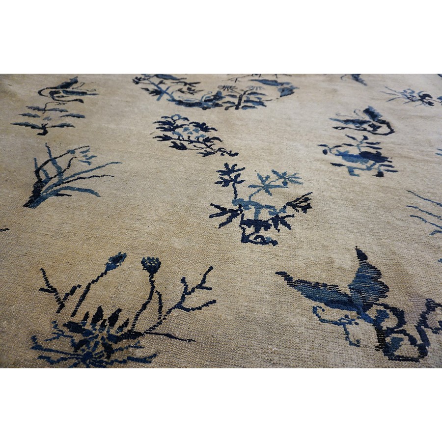 DescriptionChineseCarpets made in China proper. See entries Ningshia, Peking, Art Deco. Chinese - NingxiaThe western Chinese province of Ningshia has a mostly Muslim population and is the source of many of the oldest Chinese carpets of the modern (Ming Dynasty and later) era. The designs are typically Chinese: fretwork or Greek key boarders, pacony palmettes, bats, butterflies, Fu dogs, clouds, dragons, shou symbols, etc. Pollar carpets designed to wrap around monastery columns and displaying a dragon above waves are a specialty. The weave is coarse and soft, with several wefts between knot rows and a longish pile. Yellow golds, dark and light blues are common colors. The outer most plain border on pre 1800 examples is a corrosive brown. Formats include: large square throne carpets, paralleled meditation runners, chair seats and scalloped backs. | |