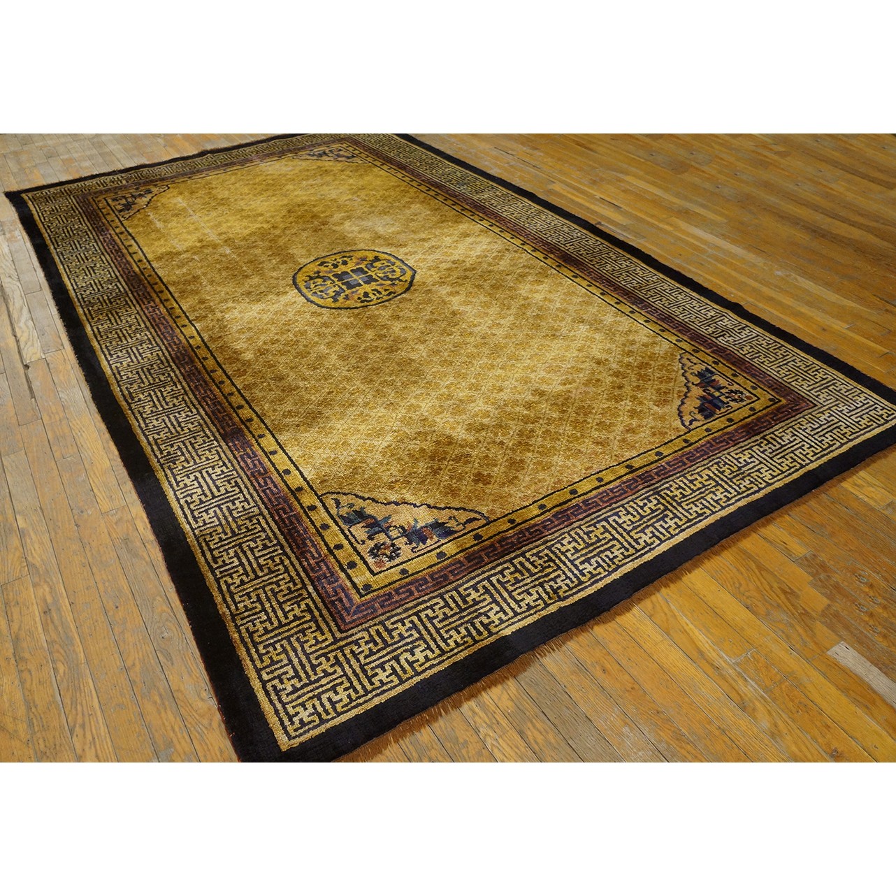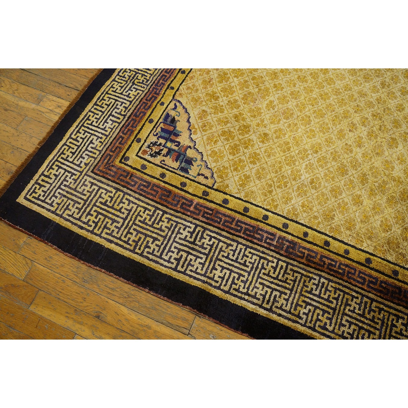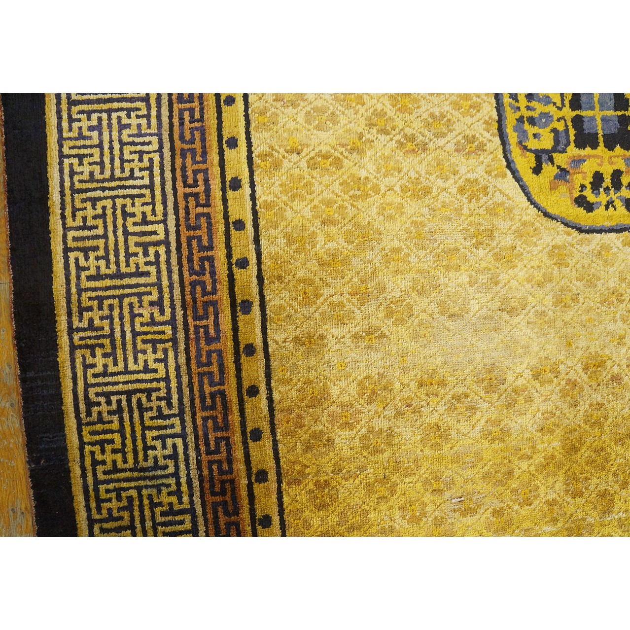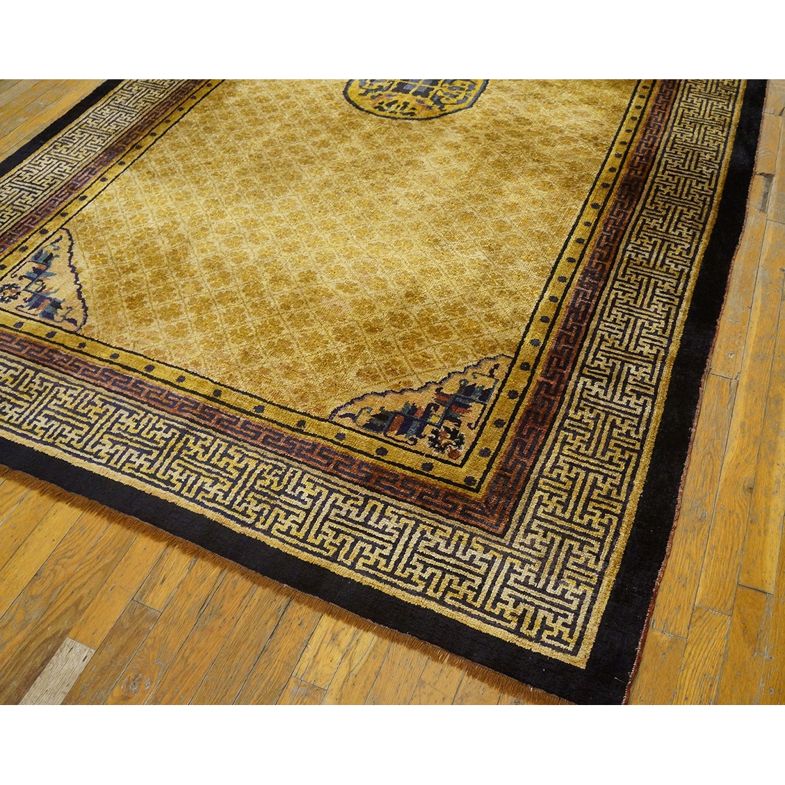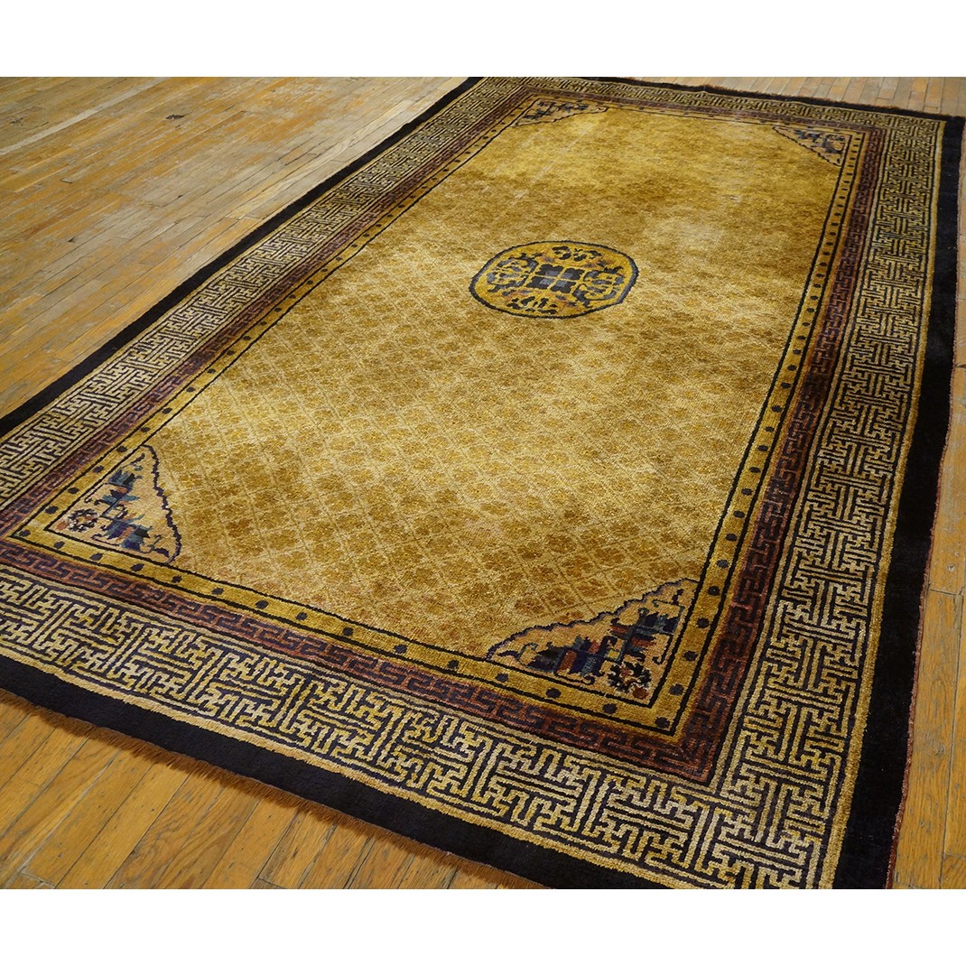 DescriptionChineseCarpets made in China proper. See entries Ningshia, Peking, Art Deco. Chinese - NingxiaThe western Chinese province of Ningshia has a mostly Muslim population and is the source of many of the oldest Chinese carpets of the modern (Ming Dynasty and later) era. The designs are typically Chinese: fretwork or Greek key boarders, pacony palmettes, bats, butterflies, Fu dogs, clouds, dragons, shou symbols, etc. Pollar carpets designed to wrap around monastery columns and displaying a dragon above waves are a specialty. The weave is coarse and soft, with several wefts between knot rows and a longish pile. Yellow golds, dark and light blues are common colors. The outer most plain border on pre 1800 examples is a corrosive brown. Formats include: large square throne carpets, paralleled meditation runners, chair seats and scalloped backs. | |