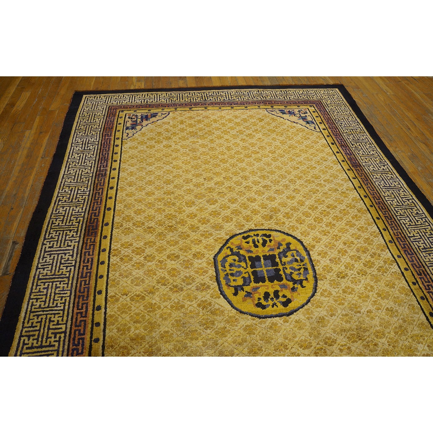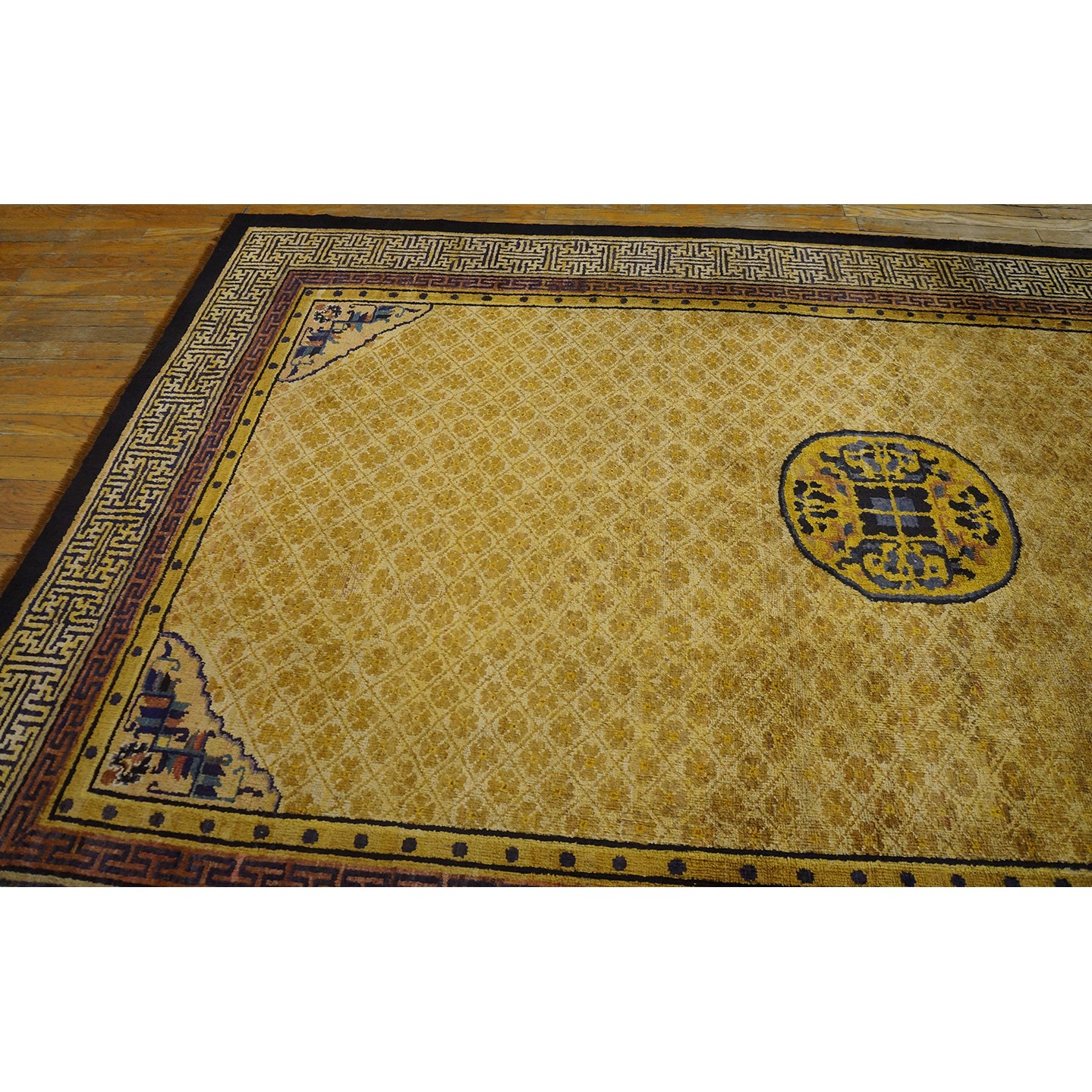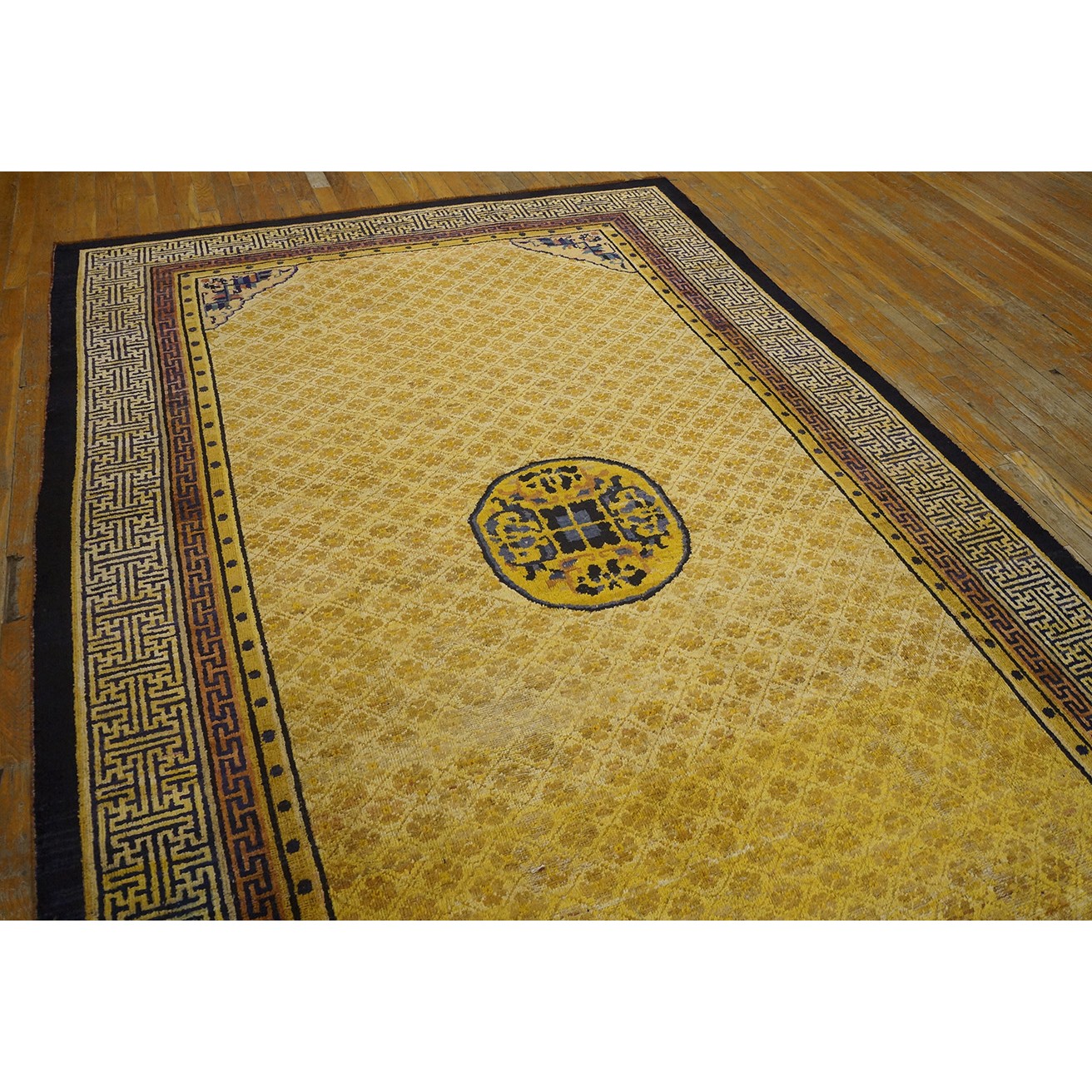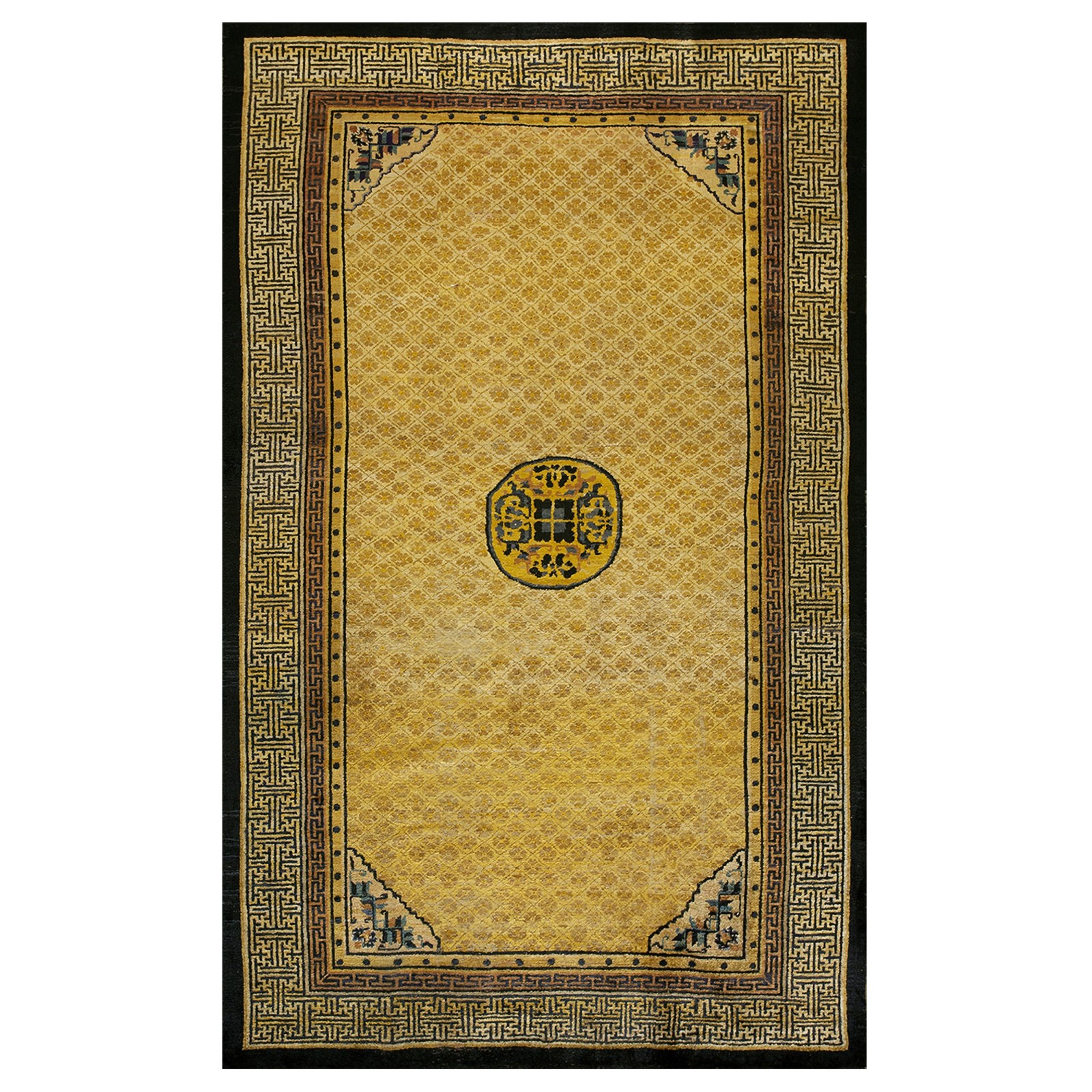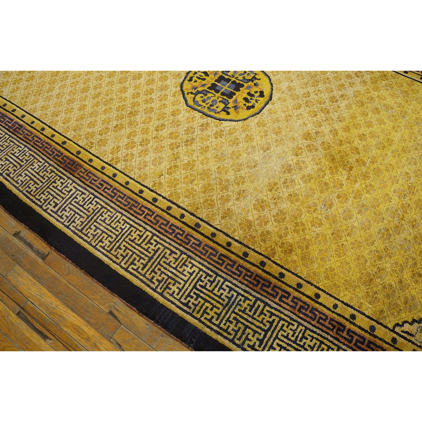 DescriptionChineseCarpets made in China proper. See entries Ningshia, Peking, Art Deco. Chinese - NingxiaThe western Chinese province of Ningshia has a mostly Muslim population and is the source of many of the oldest Chinese carpets of the modern (Ming Dynasty and later) era. The designs are typically Chinese: fretwork or Greek key boarders, pacony palmettes, bats, butterflies, Fu dogs, clouds, dragons, shou symbols, etc. Pollar carpets designed to wrap around monastery columns and displaying a dragon above waves are a specialty. The weave is coarse and soft, with several wefts between knot rows and a longish pile. Yellow golds, dark and light blues are common colors. The outer most plain border on pre 1800 examples is a corrosive brown. Formats include: large square throne carpets, paralleled meditation runners, chair seats and scalloped backs. | |