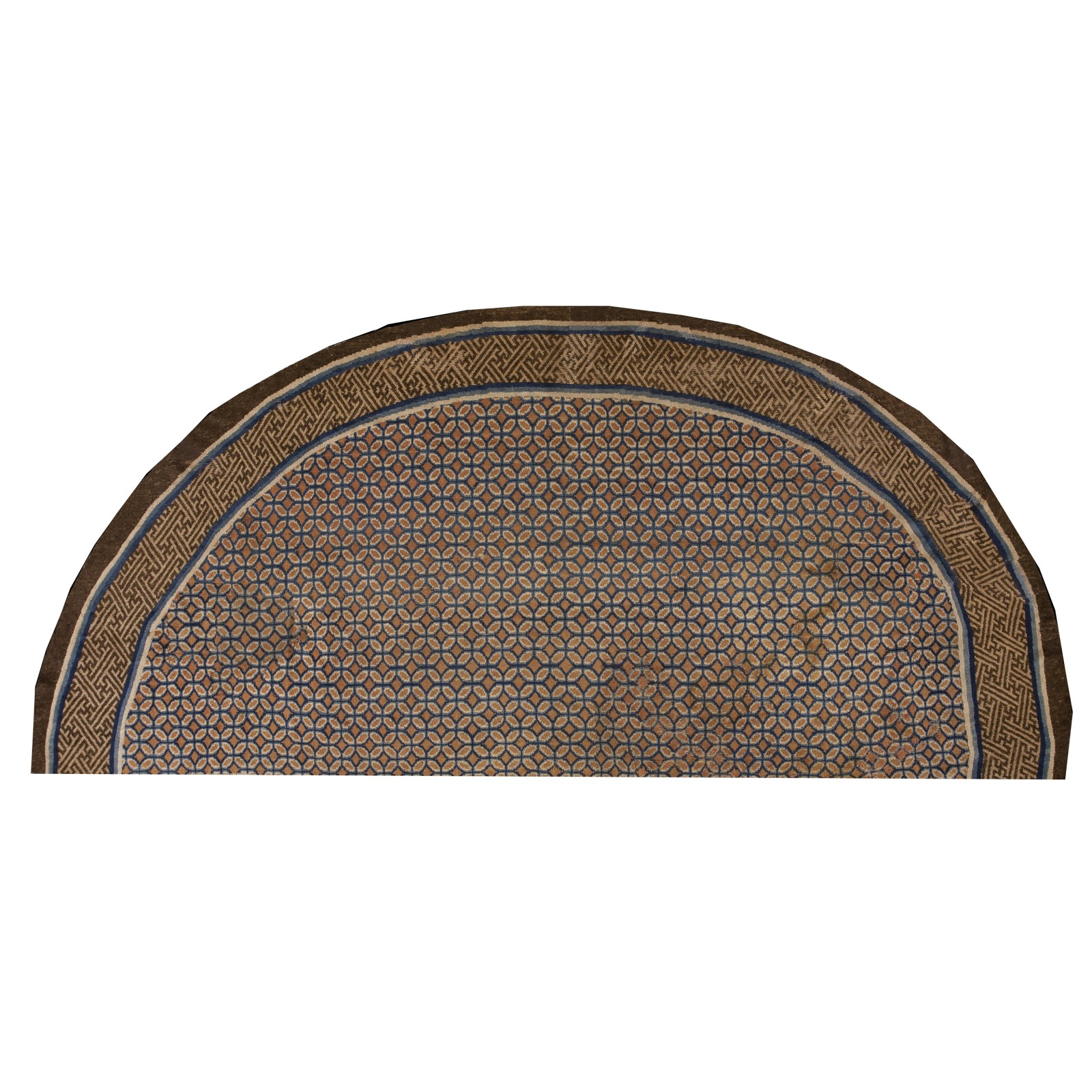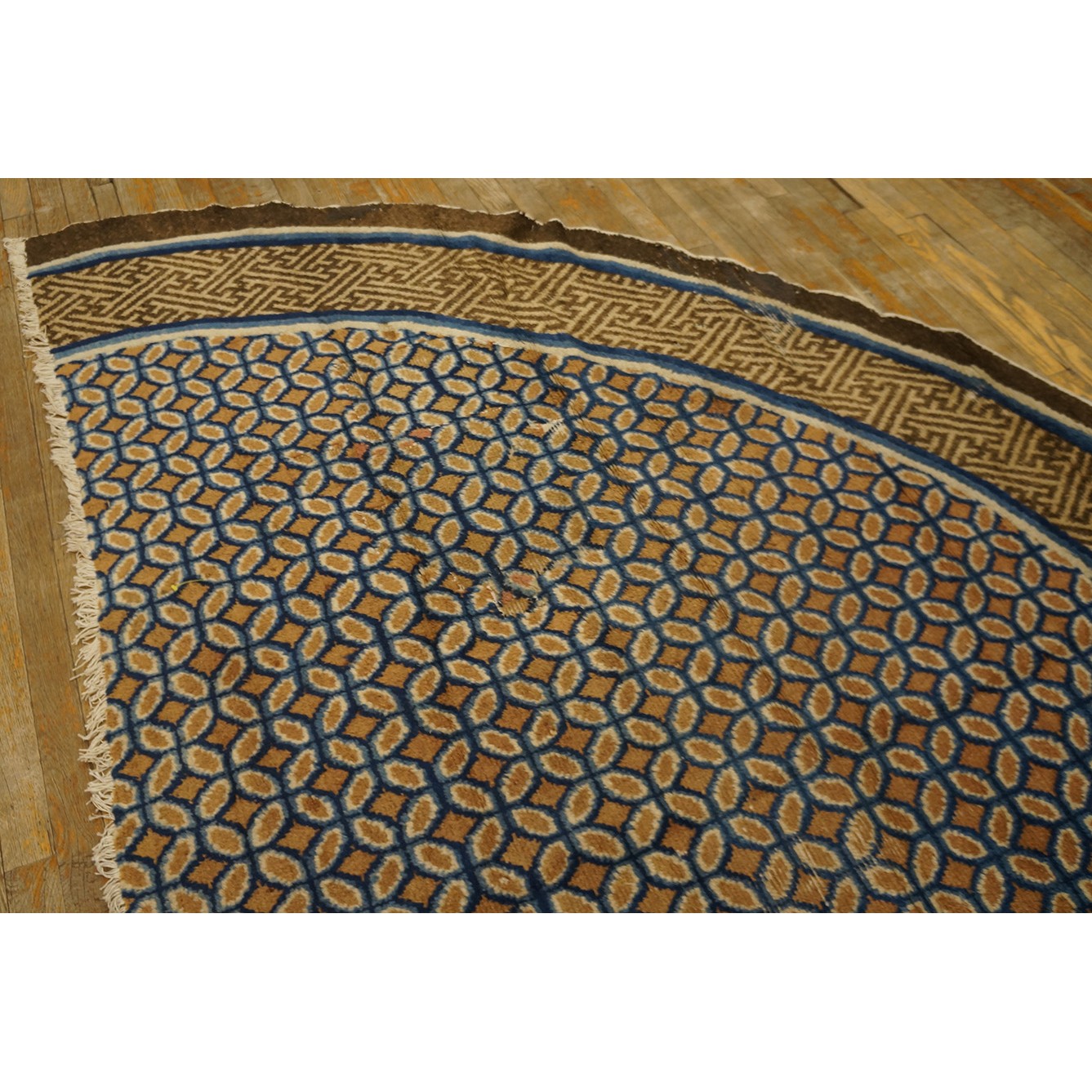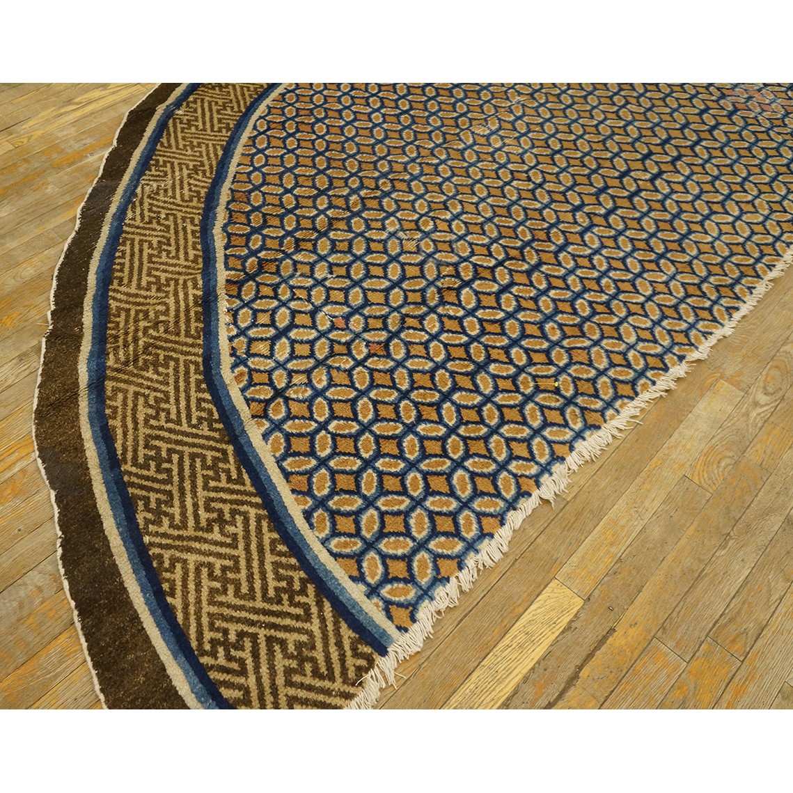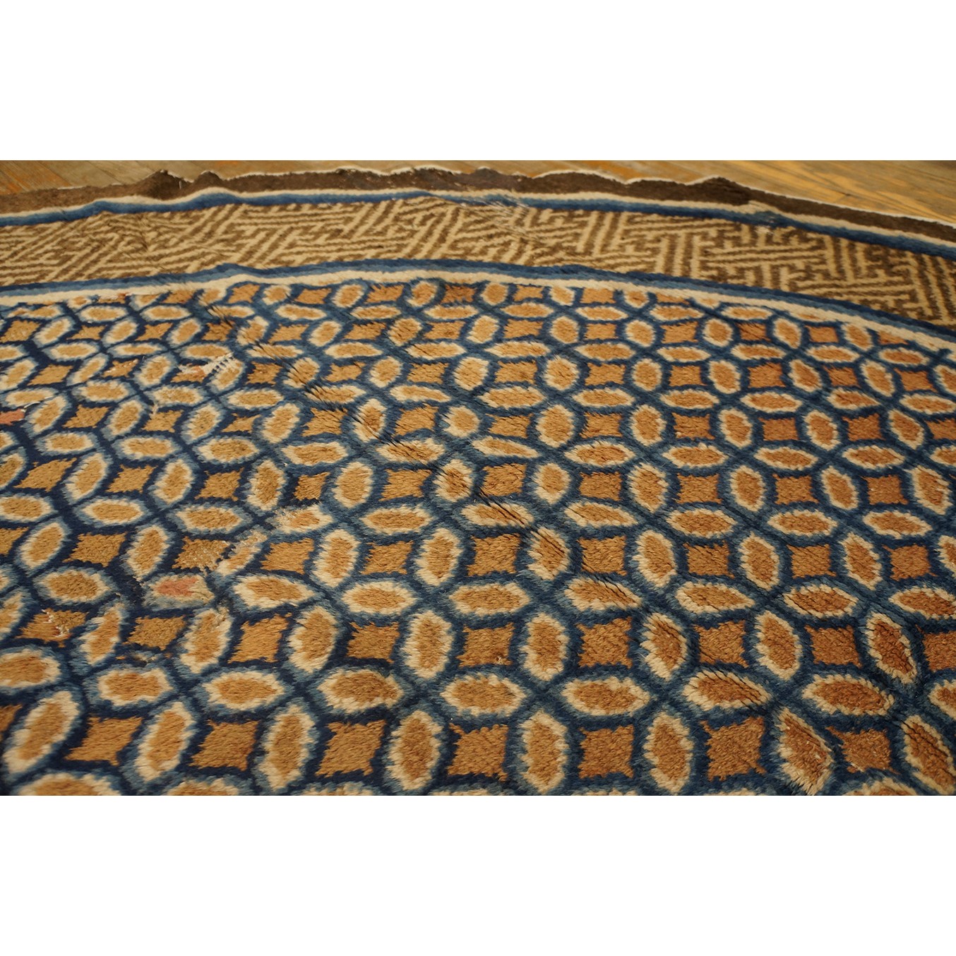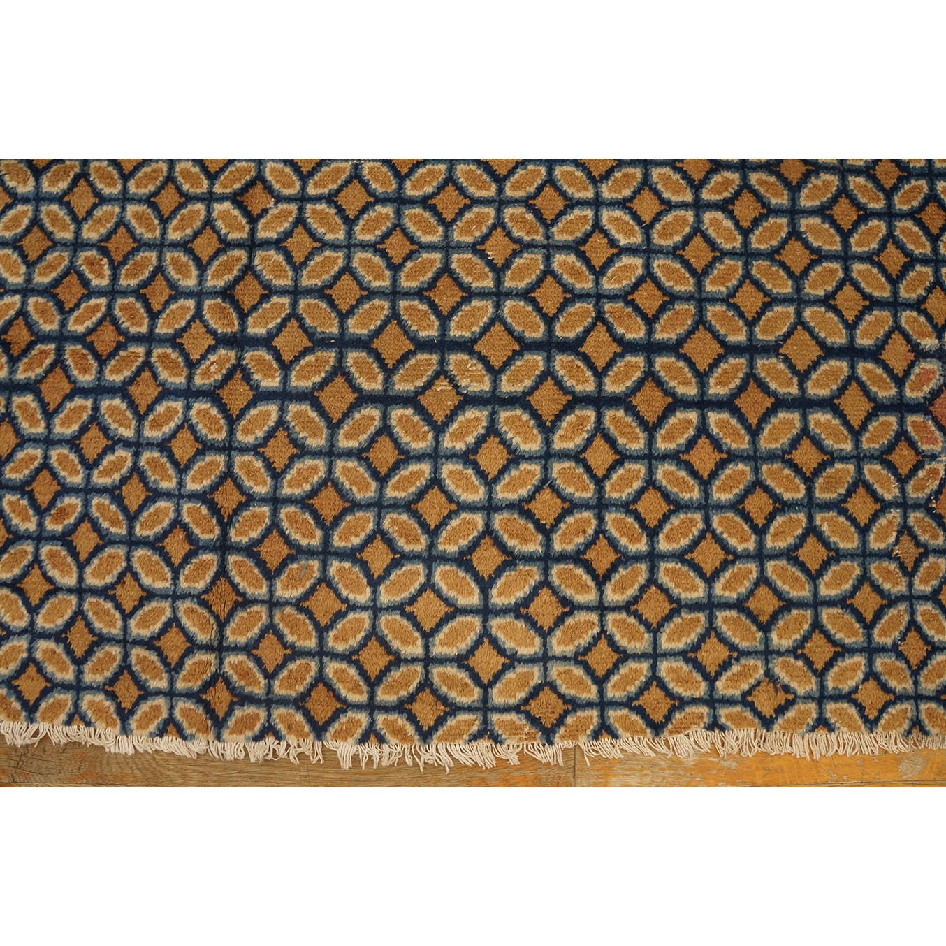 DescriptionChineseCarpets made in China proper. See entries Ningshia, Peking, Art Deco. Chinese - NingxiaThe western Chinese province of Ningshia has a mostly Muslim population and is the source of many of the oldest Chinese carpets of the modern (Ming Dynasty and later) era. The designs are typically Chinese: fretwork or Greek key boarders, pacony palmettes, bats, butterflies, Fu dogs, clouds, dragons, shou symbols, etc. Pollar carpets designed to wrap around monastery columns and displaying a dragon above waves are a specialty. The weave is coarse and soft, with several wefts between knot rows and a longish pile. Yellow golds, dark and light blues are common colors. The outer most plain border on pre 1800 examples is a corrosive brown. Formats include: large square throne carpets, paralleled meditation runners, chair seats and scalloped backs. | |