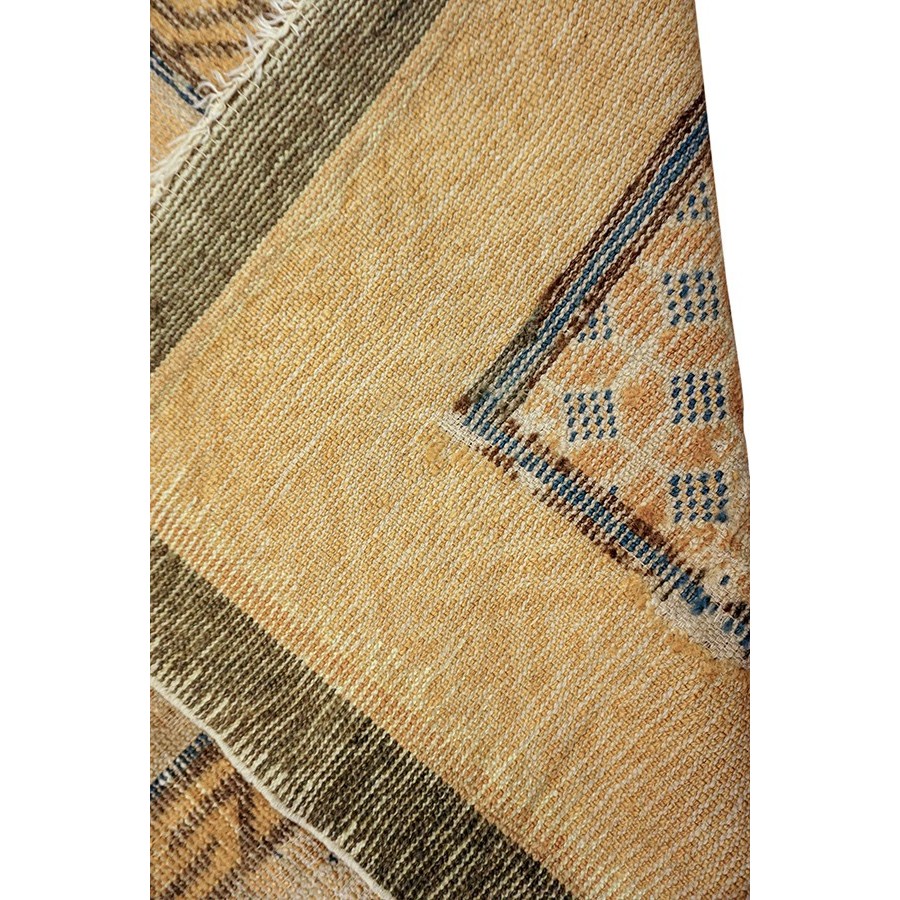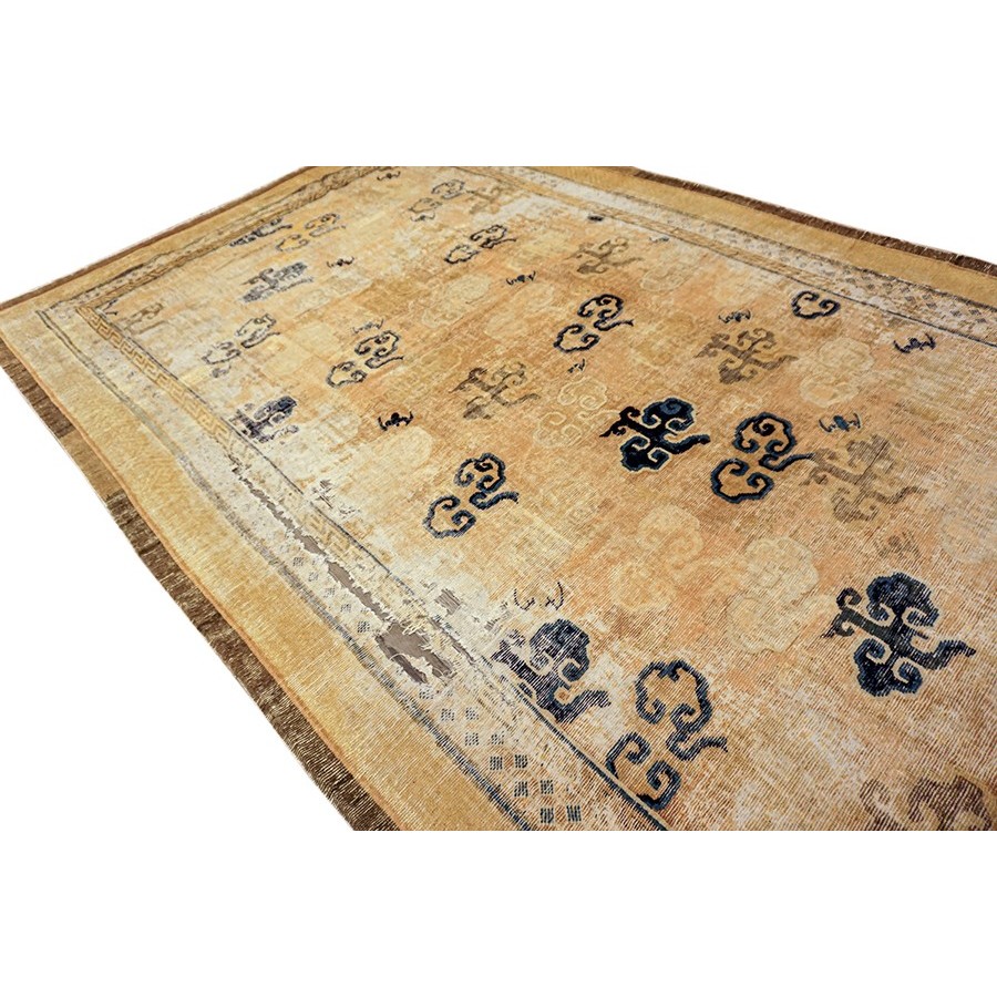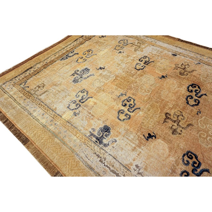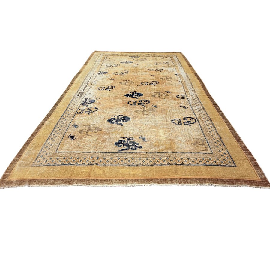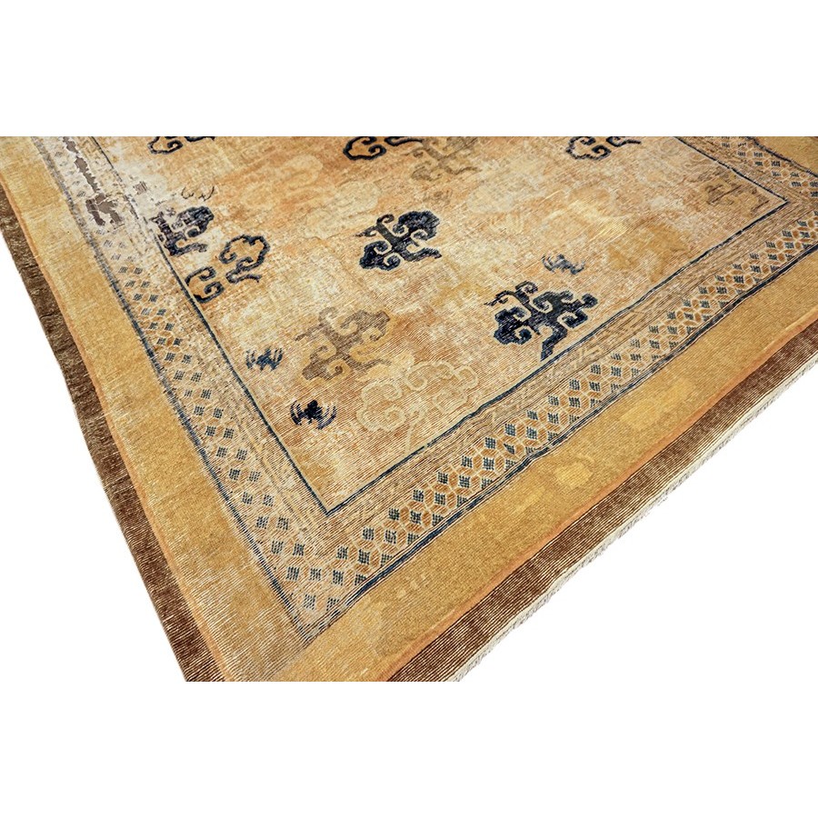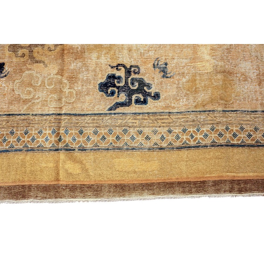 The western Chinese province of Ningshia has a mostly Muslim population and is the source of many of the oldest Chinese carpets of the modern (Ming Dynasty and later) era. The designs are typically Chinese: fretwork or Greek key boarders, pacony palmettes, bats, butterflies, Fu dogs, clouds, dragons, shou symbols, etc. Pollar carpets designed to wrap around monastery columns and displaying a dragon above waves are a specialty. The weave is coarse and soft, with several wefts between knot rows and a longish pile. Yellow golds, dark and light blues are common colors. The outer most plain border on pre 1800 examples is a corrosive brown. Formats include: large square “throne” carpets, paralleled meditation runners, chair seats and scalloped backs.