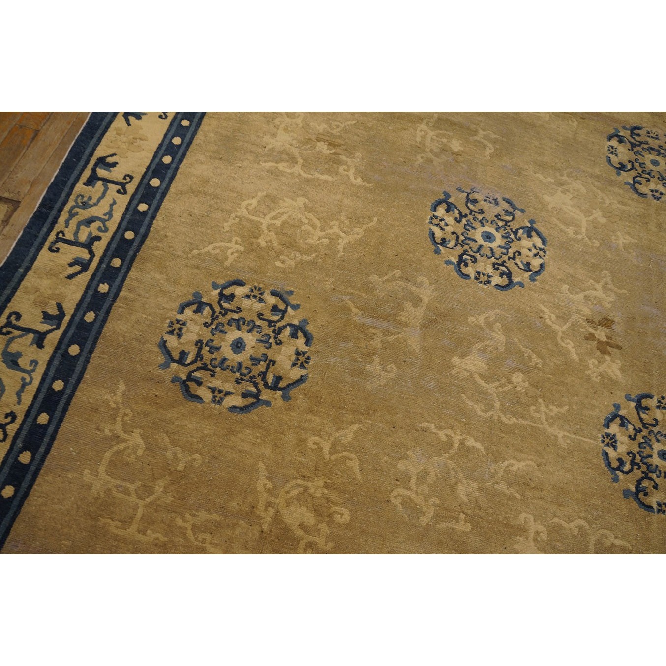 DescriptionChineseCarpets made in China proper. See entries Ningshia, Peking, Art Deco. Chinese - NingxiaThe western Chinese province of Ningshia has a mostly Muslim population and is the source of many of the oldest Chinese carpets of the modern (Ming Dynasty and later) era. The designs are typically Chinese: fretwork or Greek key boarders, pacony palmettes, bats, butterflies, Fu dogs, clouds, dragons, shou symbols, etc. Pollar carpets designed to wrap around monastery columns and displaying a dragon above waves are a specialty. The weave is coarse and soft, with several wefts between knot rows and a longish pile. Yellow golds, dark and light blues are common colors. The outer most plain border on pre 1800 examples is a corrosive brown. Formats include: large square throne carpets, paralleled meditation runners, chair seats and scalloped backs. | |