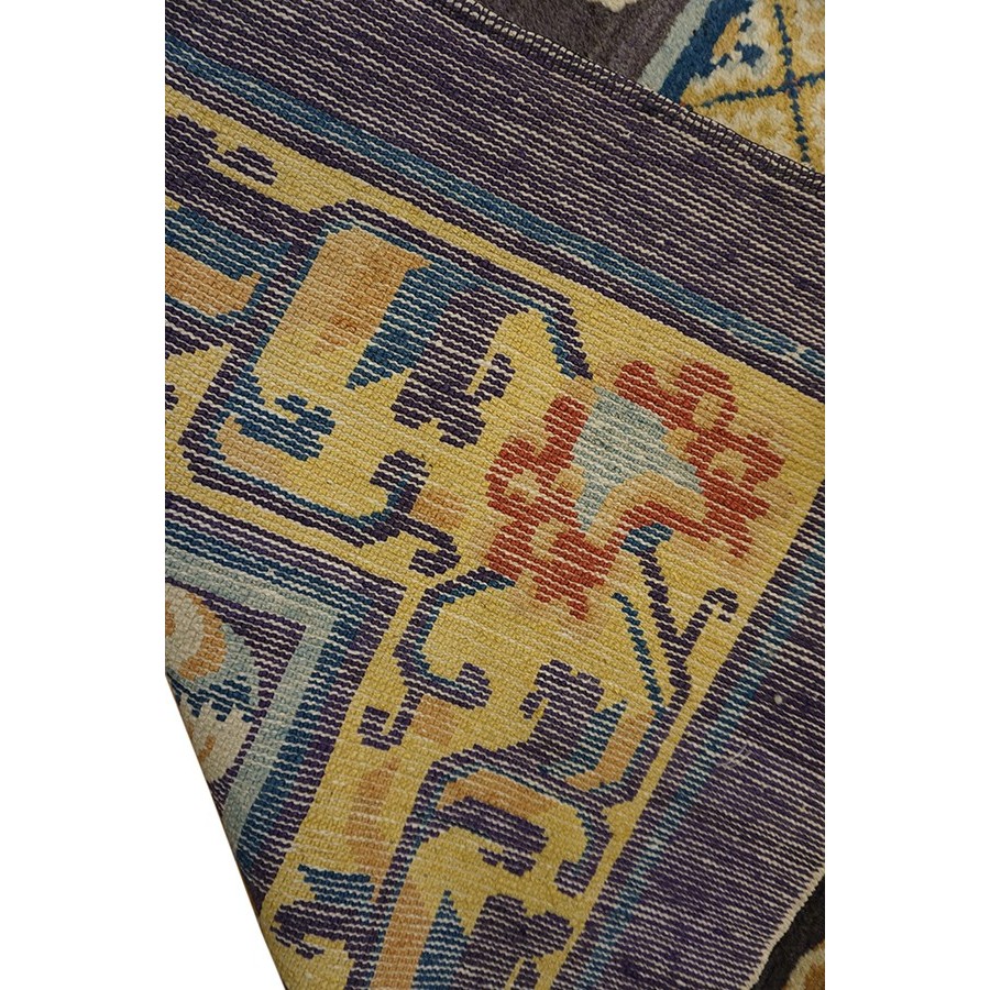 DescriptionChineseCarpets made in China proper. See entries Ningshia, Peking, Art Deco. Chinese - NingxiaThe western Chinese province of Ningshia has a mostly Muslim population and is the source of many of the oldest Chinese carpets of the modern (Ming Dynasty and later) era. The designs are typically Chinese: fretwork or Greek key boarders, pacony palmettes, bats, butterflies, Fu dogs, clouds, dragons, shou symbols, etc. Pollar carpets designed to wrap around monastery columns and displaying a dragon above waves are a specialty. The weave is coarse and soft, with several wefts between knot rows and a longish pile. Yellow golds, dark and light blues are common colors. The outer most plain border on pre 1800 examples is a corrosive brown. Formats include: large square throne carpets, paralleled meditation runners, chair seats and scalloped backs. | |