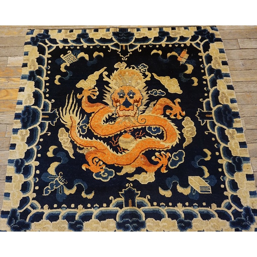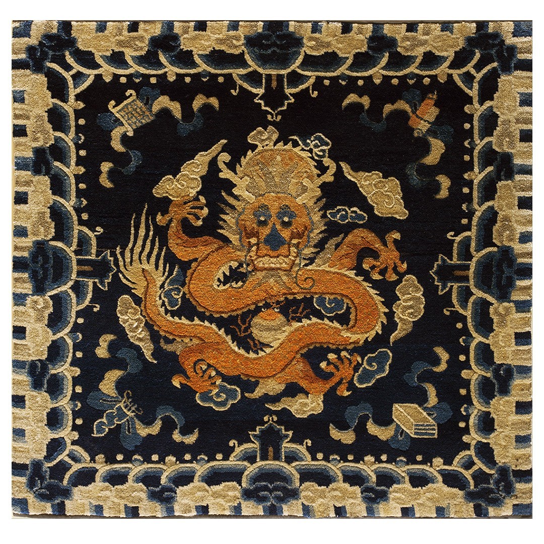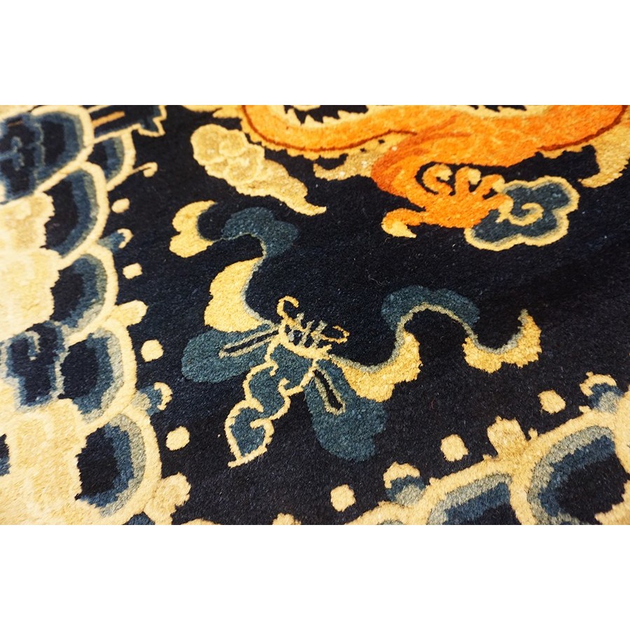 DescriptionChineseCarpets made in China proper. See entries Ningshia, Peking, Art Deco. Chinese - NingxiaThe western Chinese province of Ningshia has a mostly Muslim population and is the source of many of the oldest Chinese carpets of the modern (Ming Dynasty and later) era. The designs are typically Chinese: fretwork or Greek key boarders, pacony palmettes, bats, butterflies, Fu dogs, clouds, dragons, shou symbols, etc. Pollar carpets designed to wrap around monastery columns and displaying a dragon above waves are a specialty. The weave is coarse and soft, with several wefts between knot rows and a longish pile. Yellow golds, dark and light blues are common colors. The outer most plain border on pre 1800 examples is a corrosive brown. Formats include: large square throne carpets, paralleled meditation runners, chair seats and scalloped backs. | |
