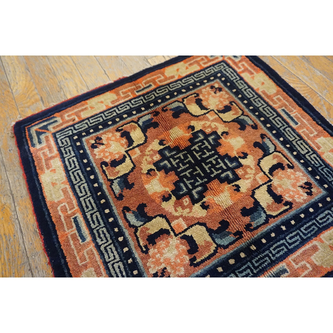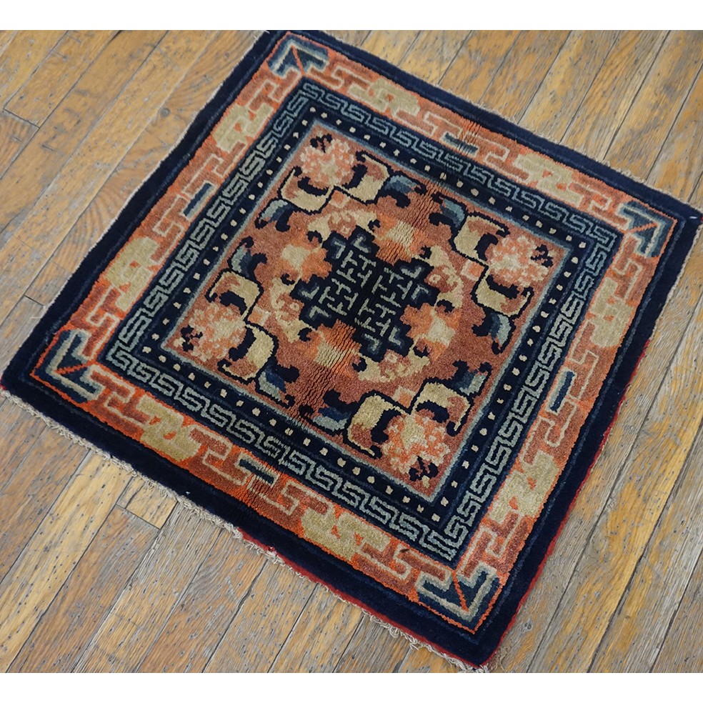 DescriptionChineseCarpets made in China proper. See entries Ningshia, Peking, Art Deco. Chinese - NingxiaThe western Chinese province of Ningshia has a mostly Muslim population and is the source of many of the oldest Chinese carpets of the modern (Ming Dynasty and later) era. The designs are typically Chinese: fretwork or Greek key boarders, pacony palmettes, bats, butterflies, Fu dogs, clouds, dragons, shou symbols, etc. Pollar carpets designed to wrap around monastery columns and displaying a dragon above waves are a specialty. The weave is coarse and soft, with several wefts between knot rows and a longish pile. Yellow golds, dark and light blues are common colors. The outer most plain border on pre 1800 examples is a corrosive brown. Formats include: large square throne carpets, paralleled meditation runners, chair seats and scalloped backs. | |